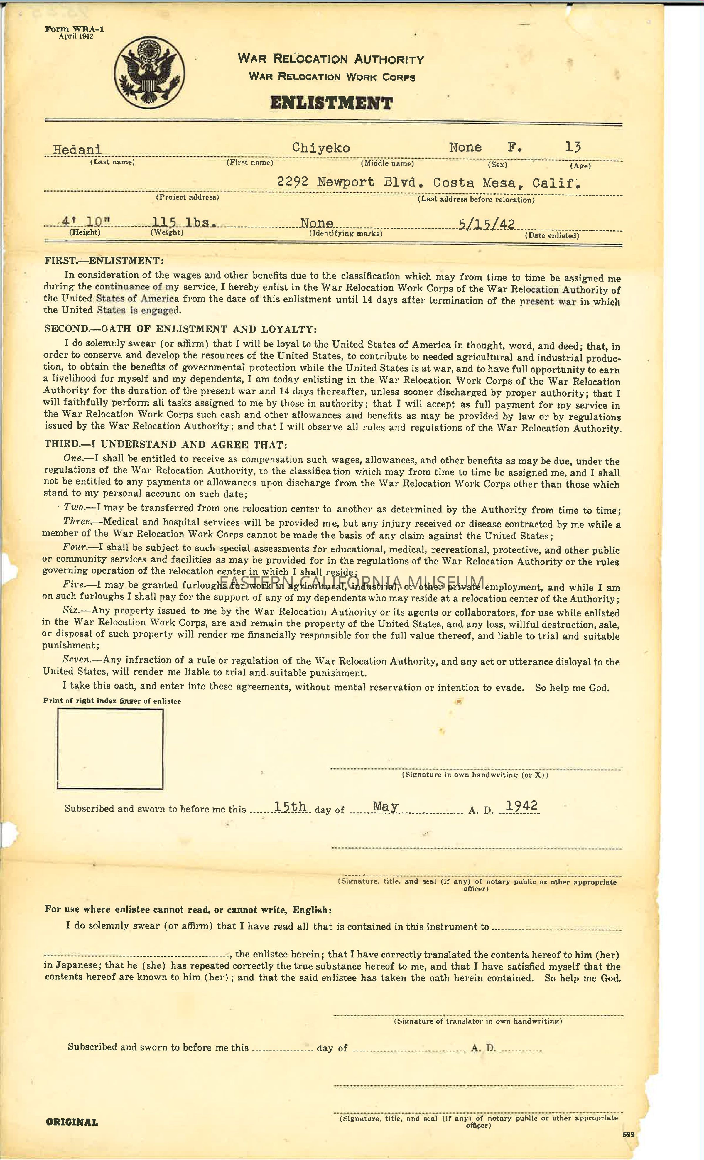 War Relocation Authority War Relocation Work Corps Enlistment form WRA-1 for Chiyeko Hedani, age 13. It is dated May 15, 1942. This item was given to Shi Nomura by Henry Hori, who was at Poston, Arizona, Camp 3.Collection