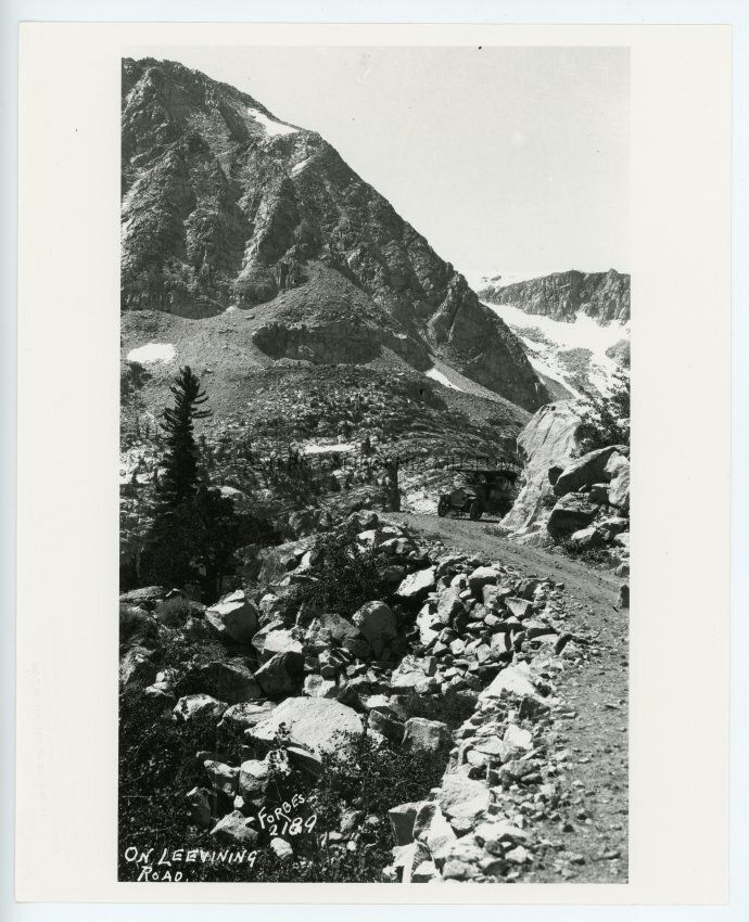 Photo of a vehicle on a curving dirt road with mountains, boulders, and snow around. Written on front: On Lee Vining Road, Forbes, 2189. This road goes up to Tioga Pass and into Yosemite.
