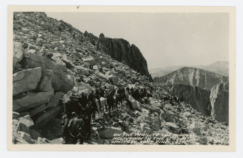 Photo postcard titled, "On the Trail to the Highest Mountain in the U.S. Mt. Whitney, Lone Pine, Calif." It shows a very long packtrain going through a barren rocky section of the trail. Photo by Burton Frasher.Collection