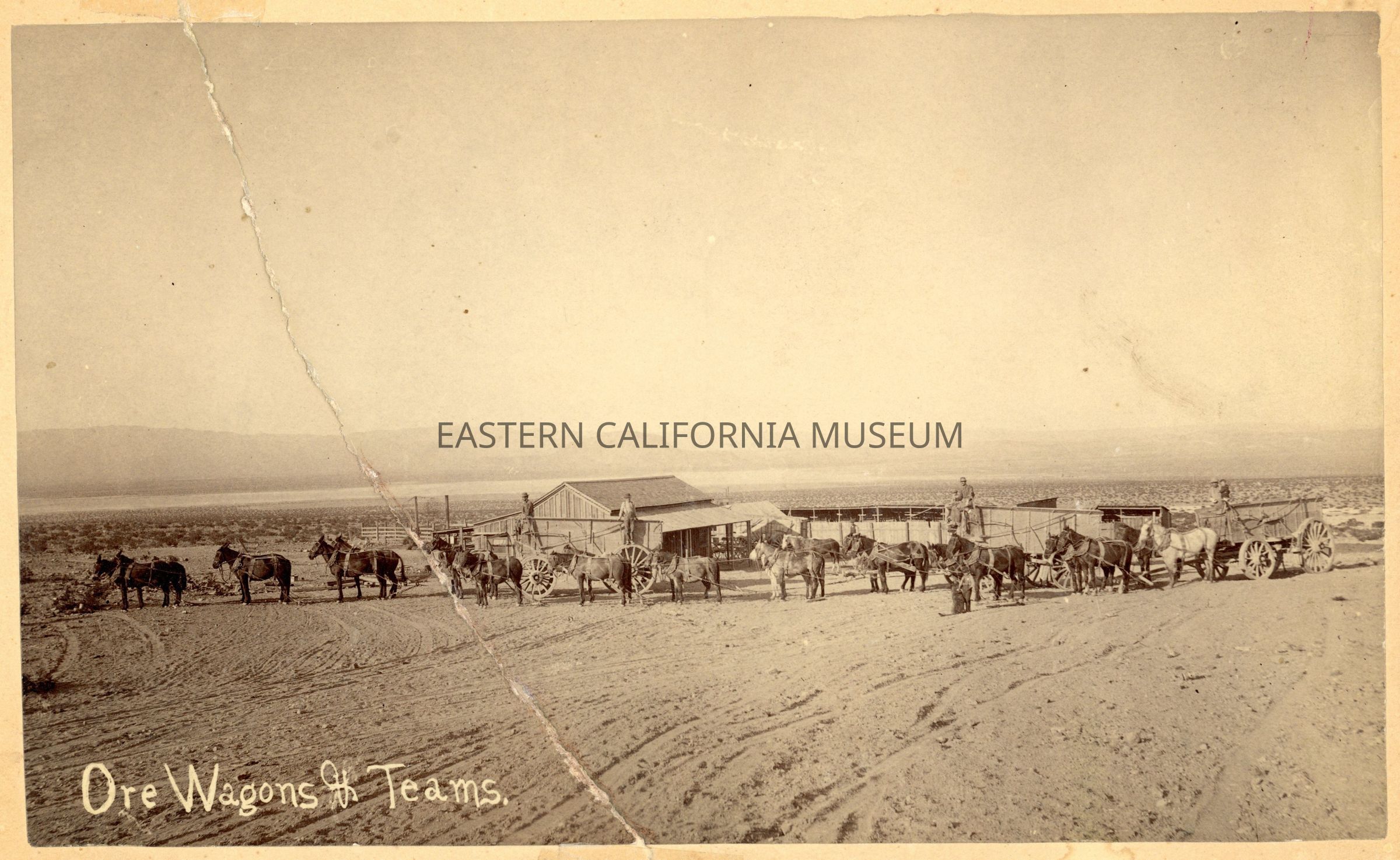 Mounted albumen print of what might be Lime Point, Nevada prior to 1900. It is captioned, "Ore Wagons and Teams," but the photographer is unknown. It shows three 6-10 teams of horses/mules hauling large wagons. There are about eight or nine men and boys in the image (and one dog). There is a large barn and stable behind them, and in the distance appears to be a lake or dry lake bed with a distinct mound (Mt. Jackson?) on the opposite side.