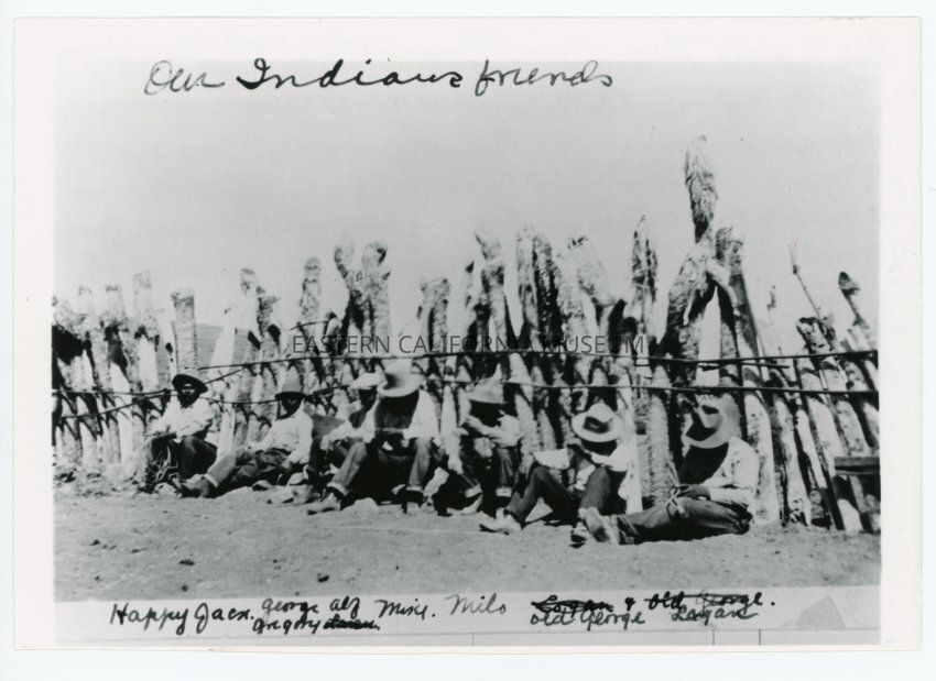 This photo was included with letter 1955.912.41a and is mentioned in manuscript 1995.912.25b, in which Elizabeth Mecham writes of this photo: I took the enclosed picture as they sat against the yucca tree posts of the corral at the Junction May 1916--"talking it over." "Happy Jack" was a "cousin" of Mike's--as close as they figured relationship--George Gregory (Coso Indian) helped that time--next is a friend who was visiting us, Alf Faulkner. We put him--a "green horn" to driving the team and wagon with camping equipment etc. Next is Mike and my husband Milo--then George and Mike's son Logan--still camera shy (evil eye).