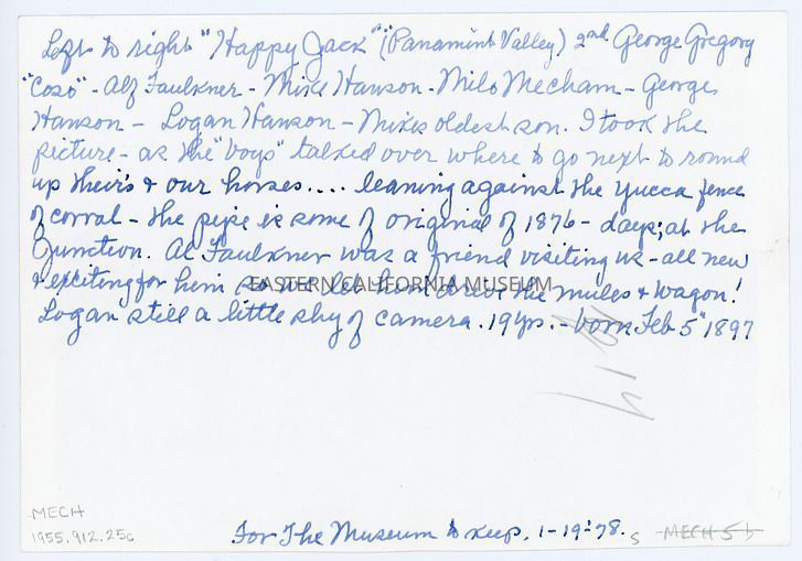 Handwritten in blue ink on reverse: Left to right: "Happy Jack" (Panamint Valley), 2nd George Gregory "Coso," Alf Faulkner, Mike Hanson, Milo Mecham, George Hanson, Logan Hanson--Mike's oldest son. I took the picture as the "boys" talked over where to go next to round up theirs and ours horses...leaning against the yucca fence of corral. The pipe is some of original of 1876 days at the Junction. Al Faulkner was a friend visiting us--all new and exciting for him so we let him drive the mules and wagon! Logan still a little shy of camera. 19 yrs.--born Feb 5, 1897. For the museum to keep, 1-19-1978.