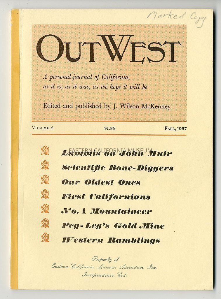 "Out West, Vol. 2, Fall 1967" has "Marked Copy" written on front cover and contains articles titled "The Ever-Living 'Old Ones'," 'The First Californians," "Norman Clyde, Mountaineer," and "A Pleasant Spring Climb on Mt. Agassiz."Publication Details
