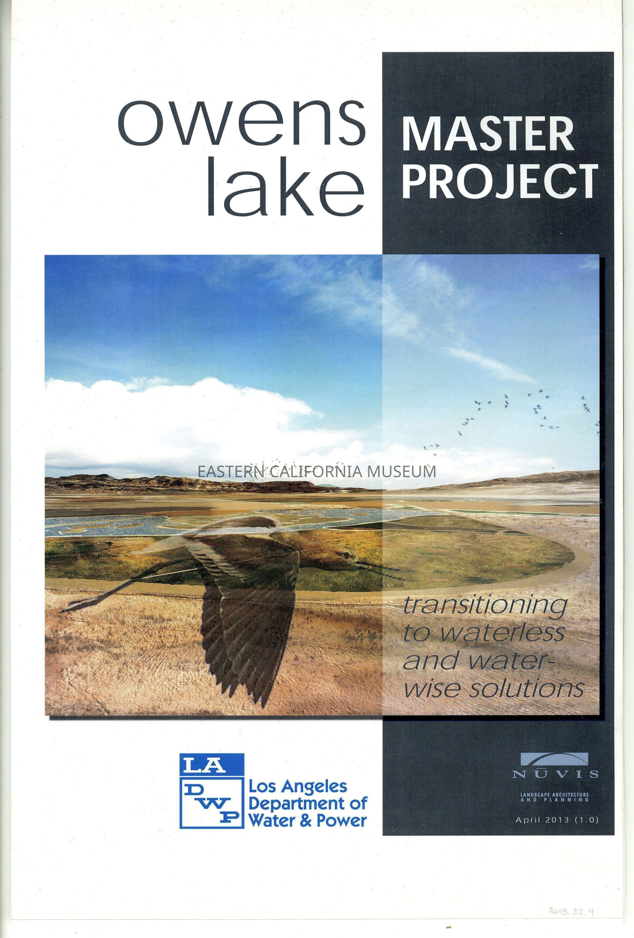 "Owens Lake Master Project" is spiral bound and was published by Los Angeles Department of Water and Power (LADWP) in April 2013. Contents include; Project Goals, Broader Public Benefits, Land Cover Plan & Phasing, Species Guilds, Waterless Dust Control, Enabling the Project, and Birds Eye Views.
