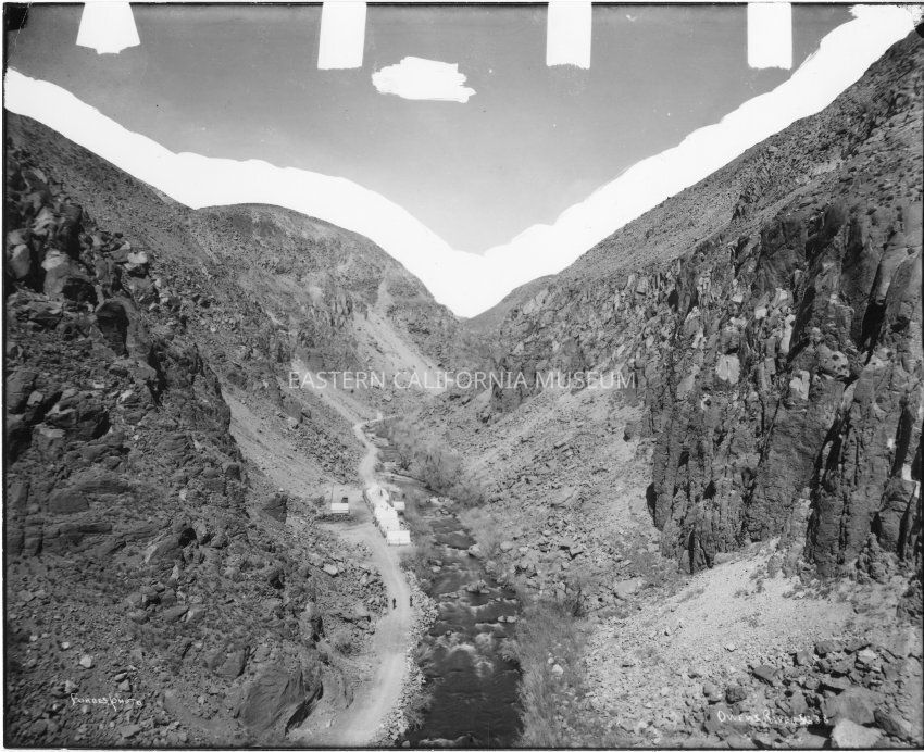 B&W glossy print: looking down into a canyon, rocky sides, river, 2 men walking along a rode, several tents