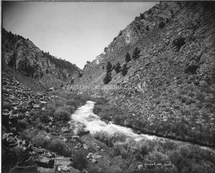 B&W glossy print: rushing stream running through a canyon, rock slopes, few trees