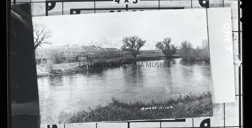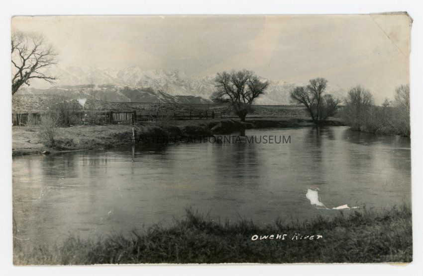 Photo postcard titled, "Owens River." It shows the river east of Lone Pine, a railroad line in the distance, and the snow covered Sierra Nevada mountain range in the background.Collection