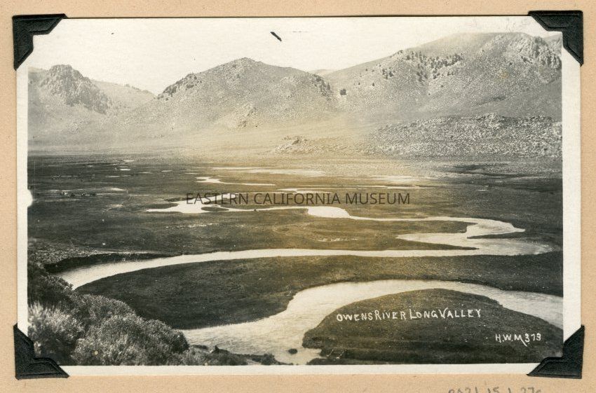 Photo postcard of the Owens River winding through Long Valley before the dam created Crowley Lake in this location. It is titled, "Owens River Long Valley" and was taken by H. W. Mendenhall and given his photo #373.Collection