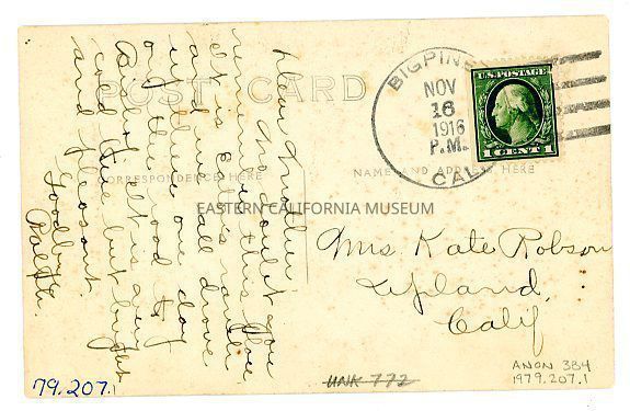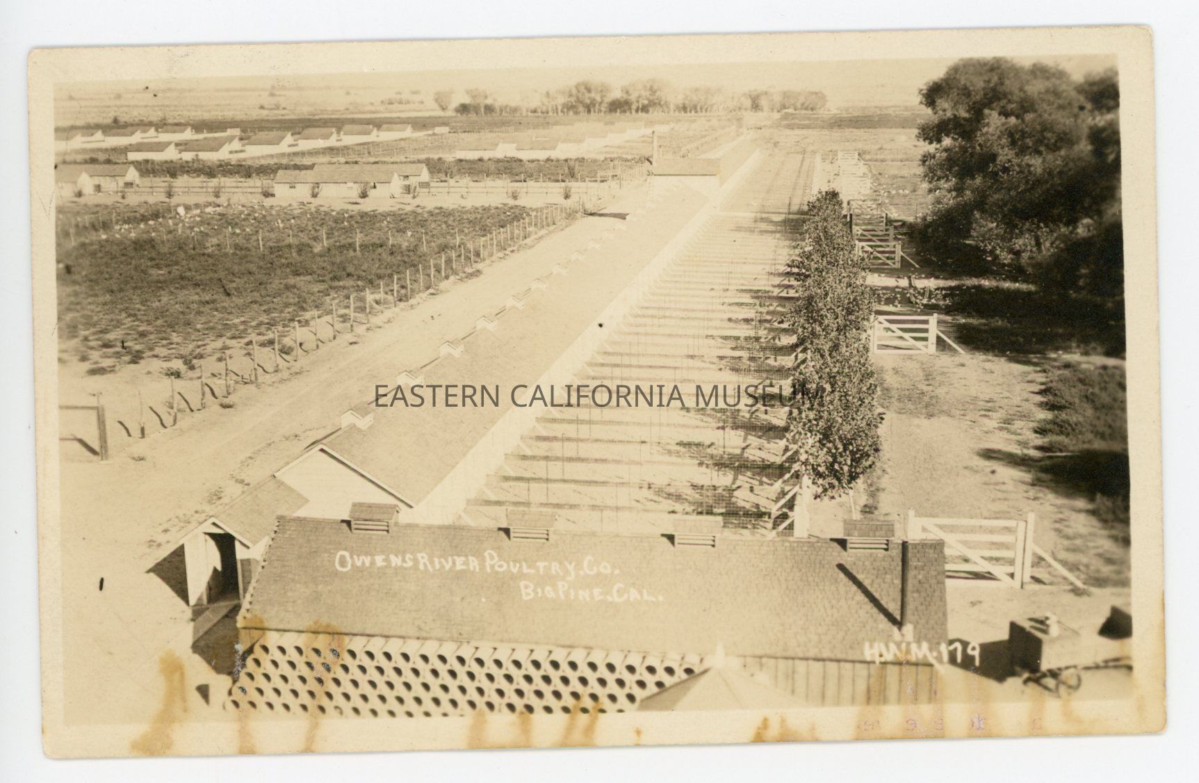 Photo postcard titled, "Owens River Poultry Co., Big Pine, Cal." It was taken by photographer H. W. Mendenhall of Big Pine and given his ID #179. It was sent to Mrs. Kate Robson of Upland, CA from her son, Ralph, in Big Pine on 11/16/1916. It has a green one cent Washington stamp. The Owens River Poultry Co. was Fred Eaton's ranch.Photograph Details