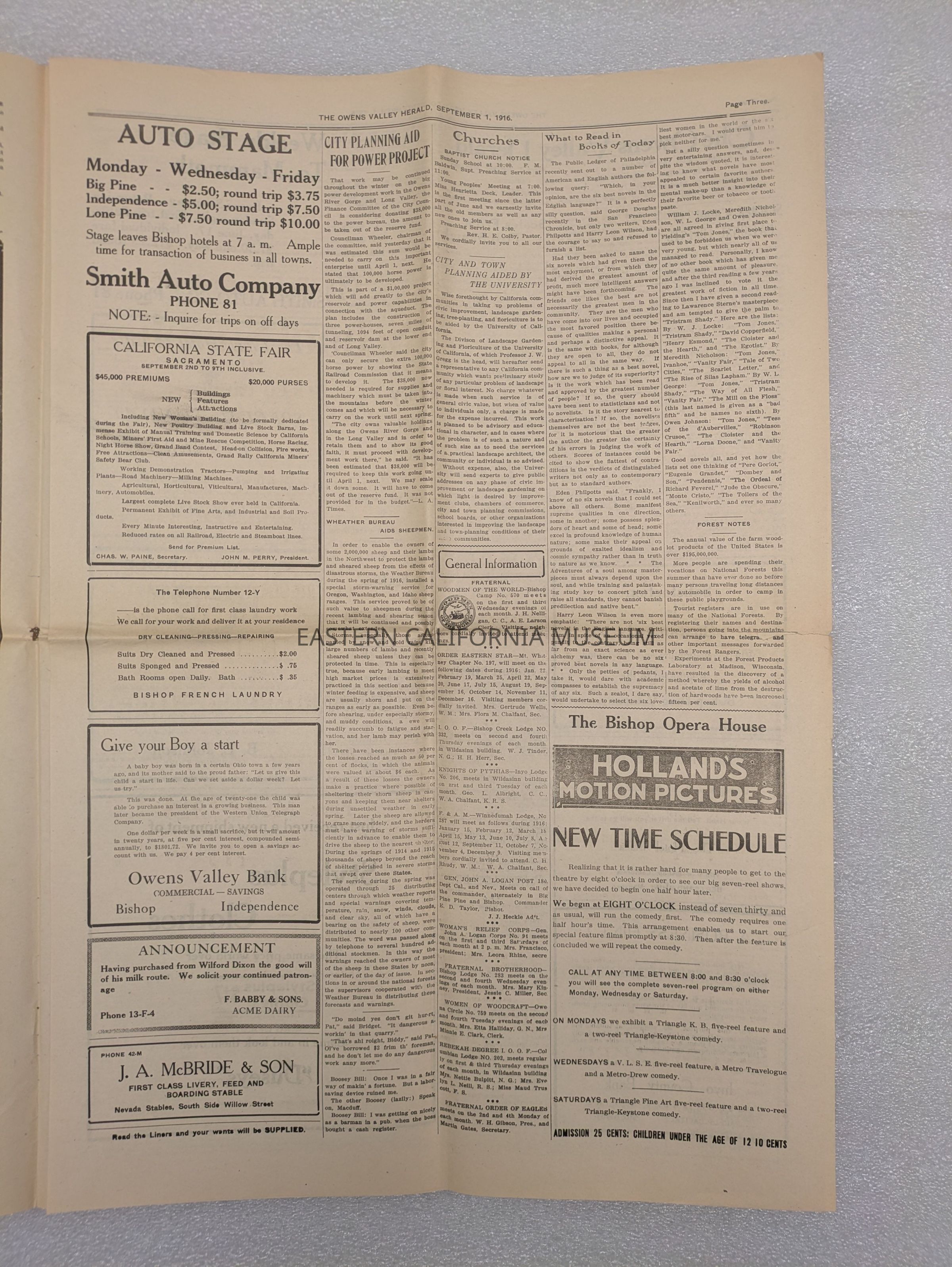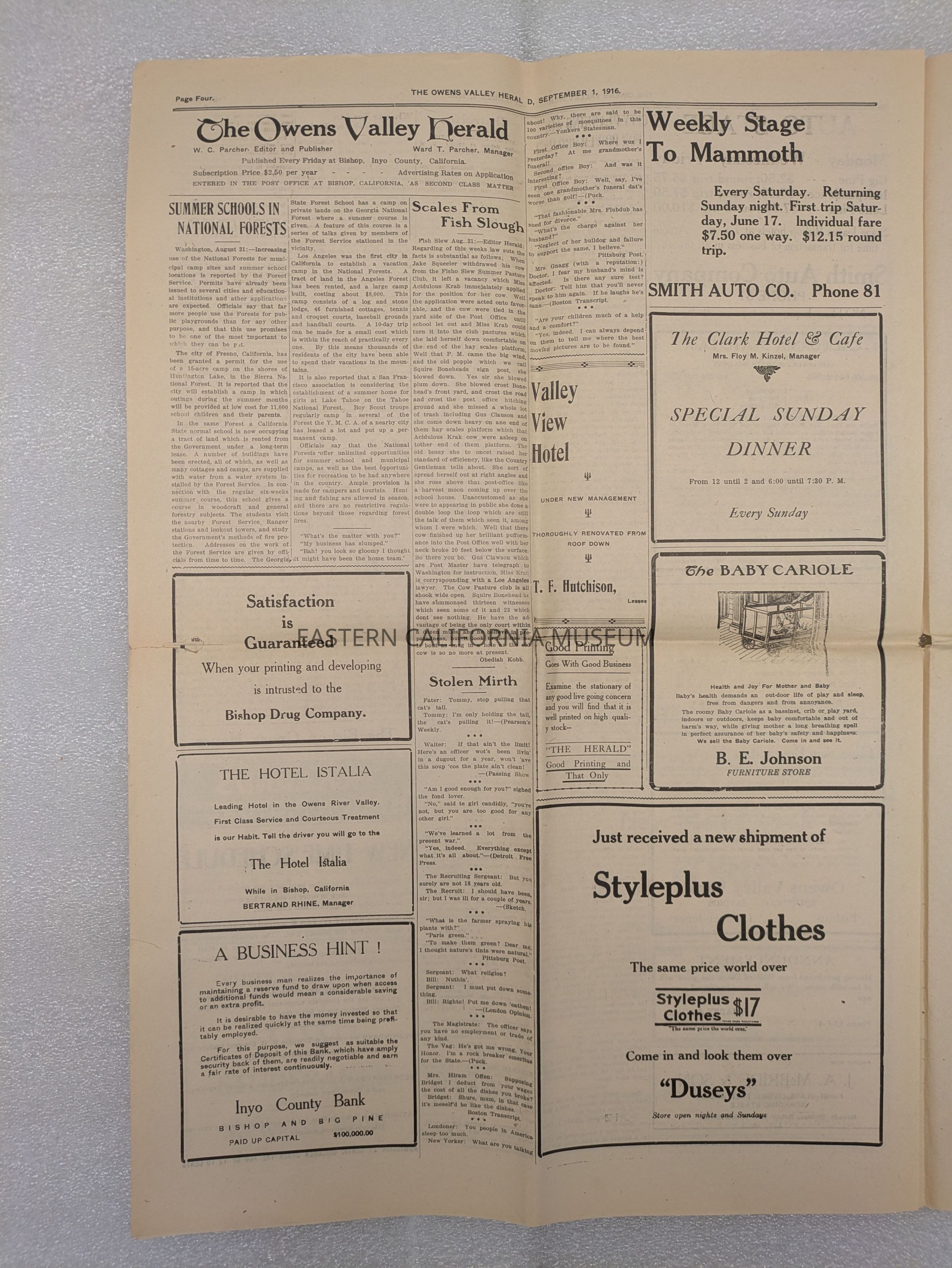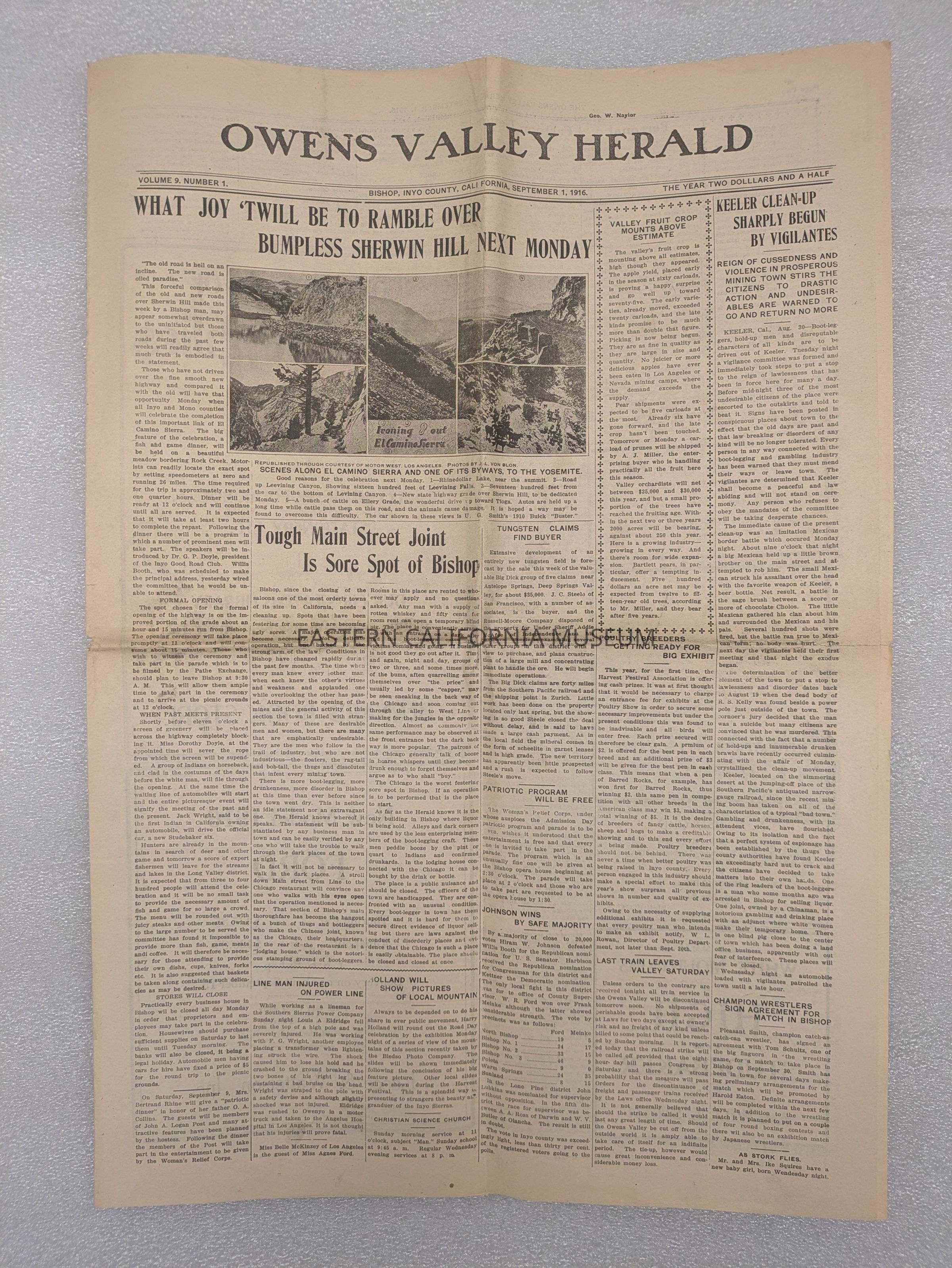 Newspaper: Owens Valley Herald, Vol. 9, No. 1, September 1, 1916. Stamped on front page: Geo. W. Naylor.