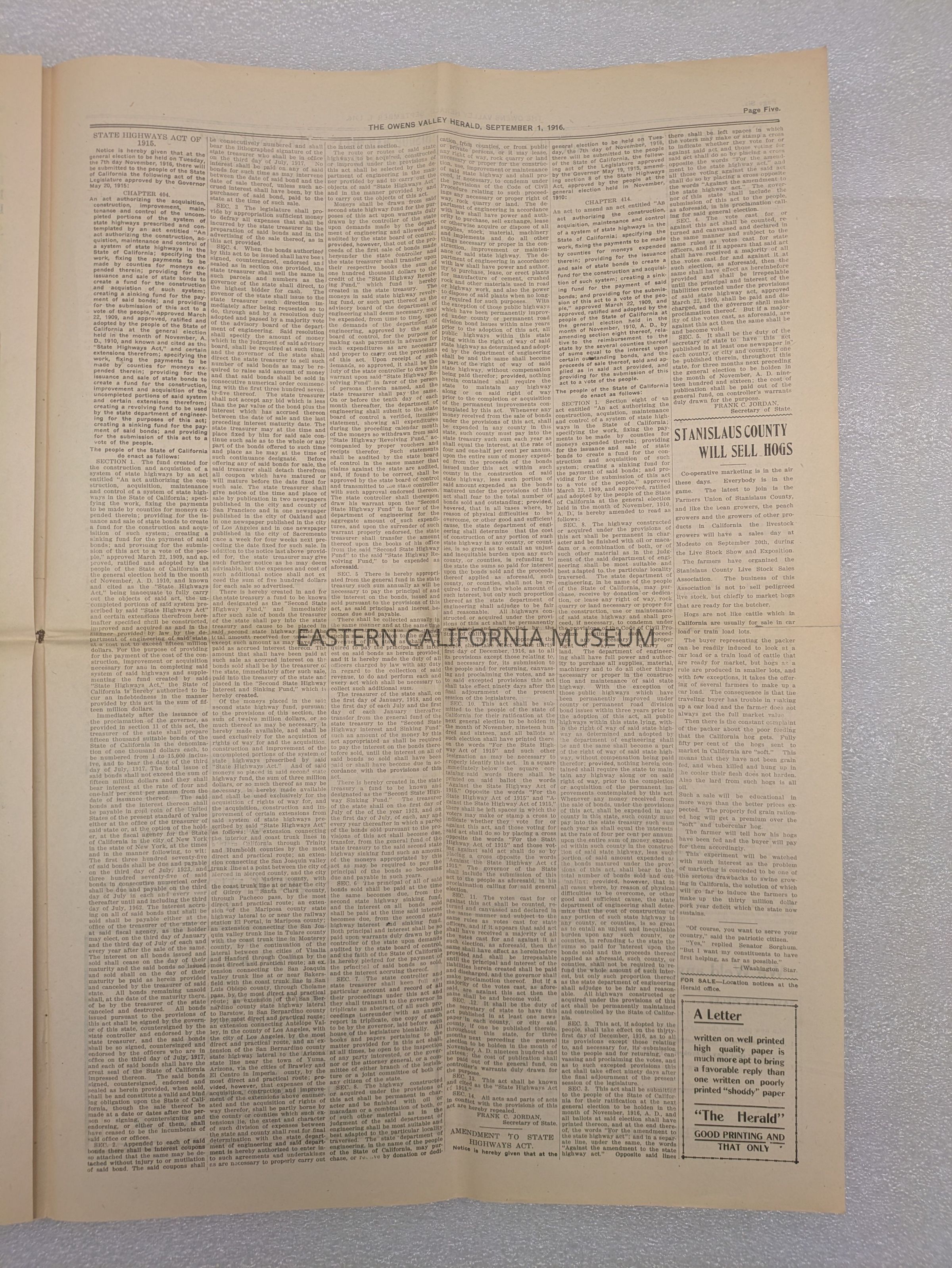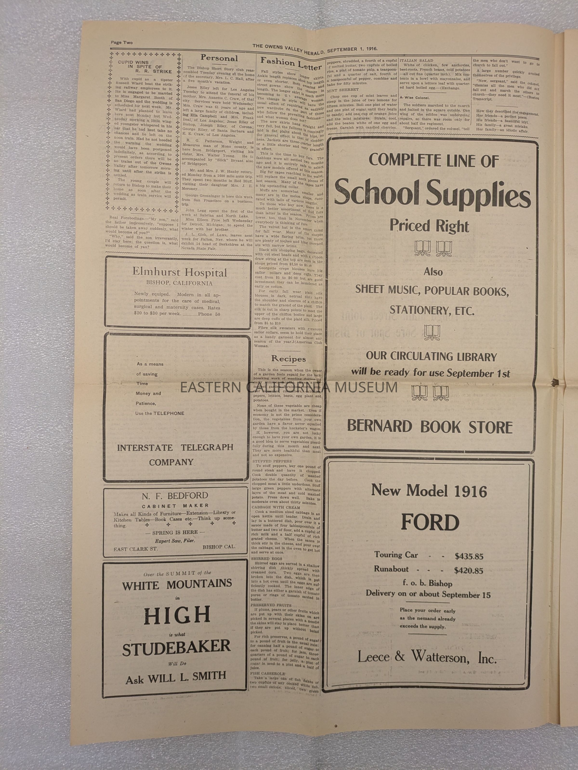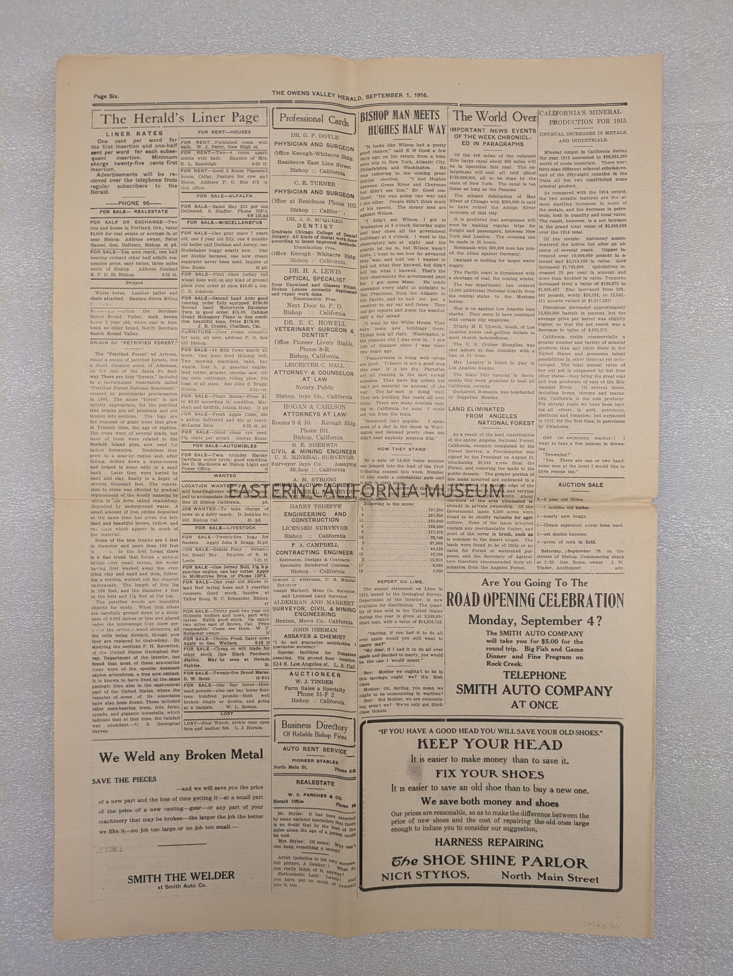 Newspaper: Owens Valley Herald, Vol. 9, No. 1, September 1, 1916. Stamped on front page: Geo. W. Naylor.