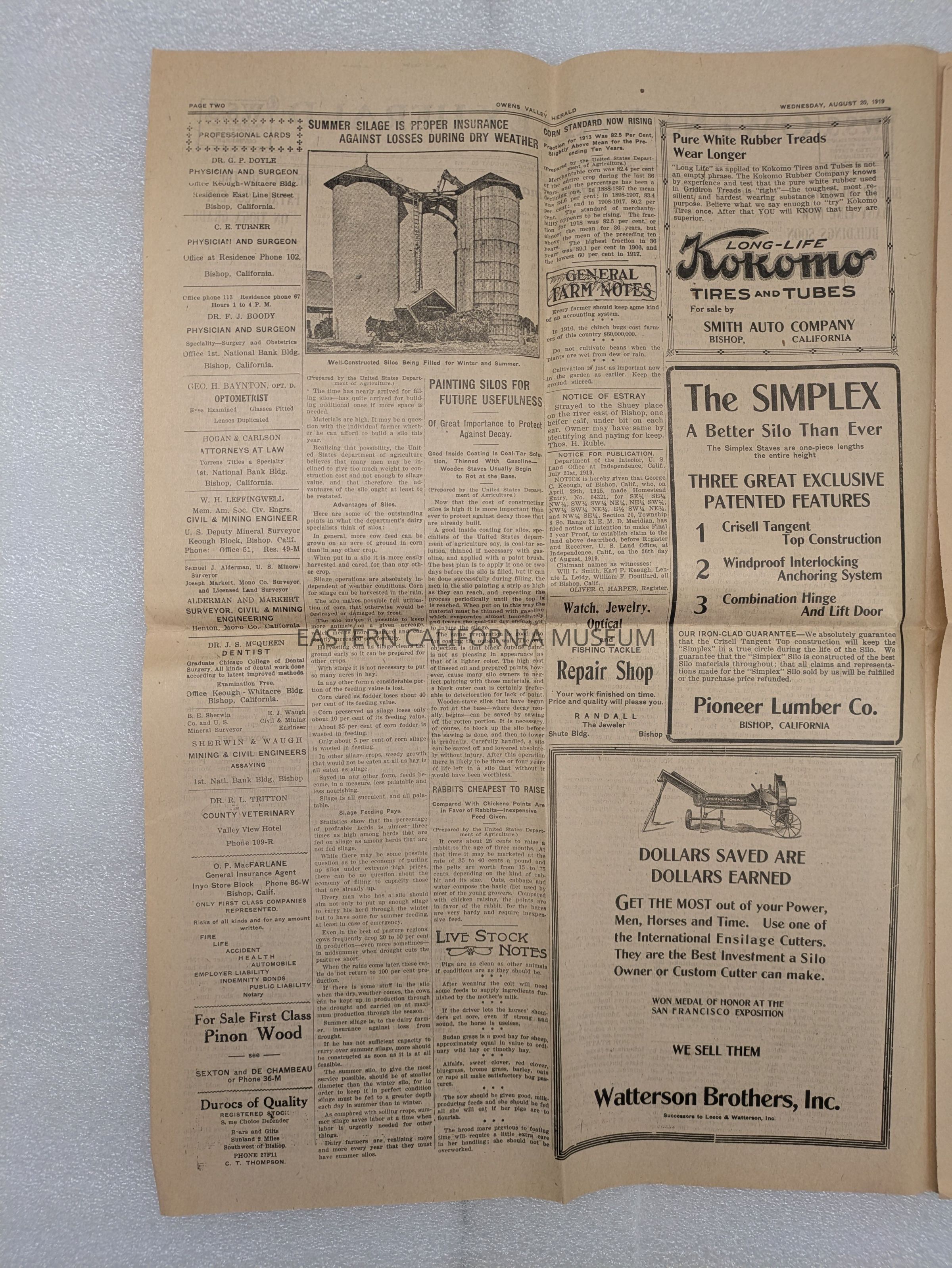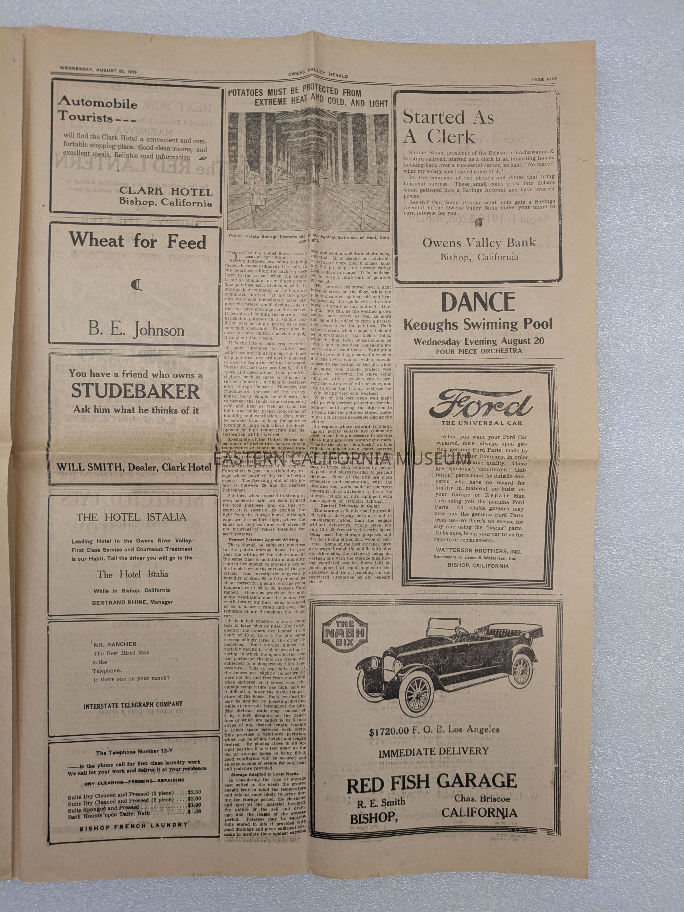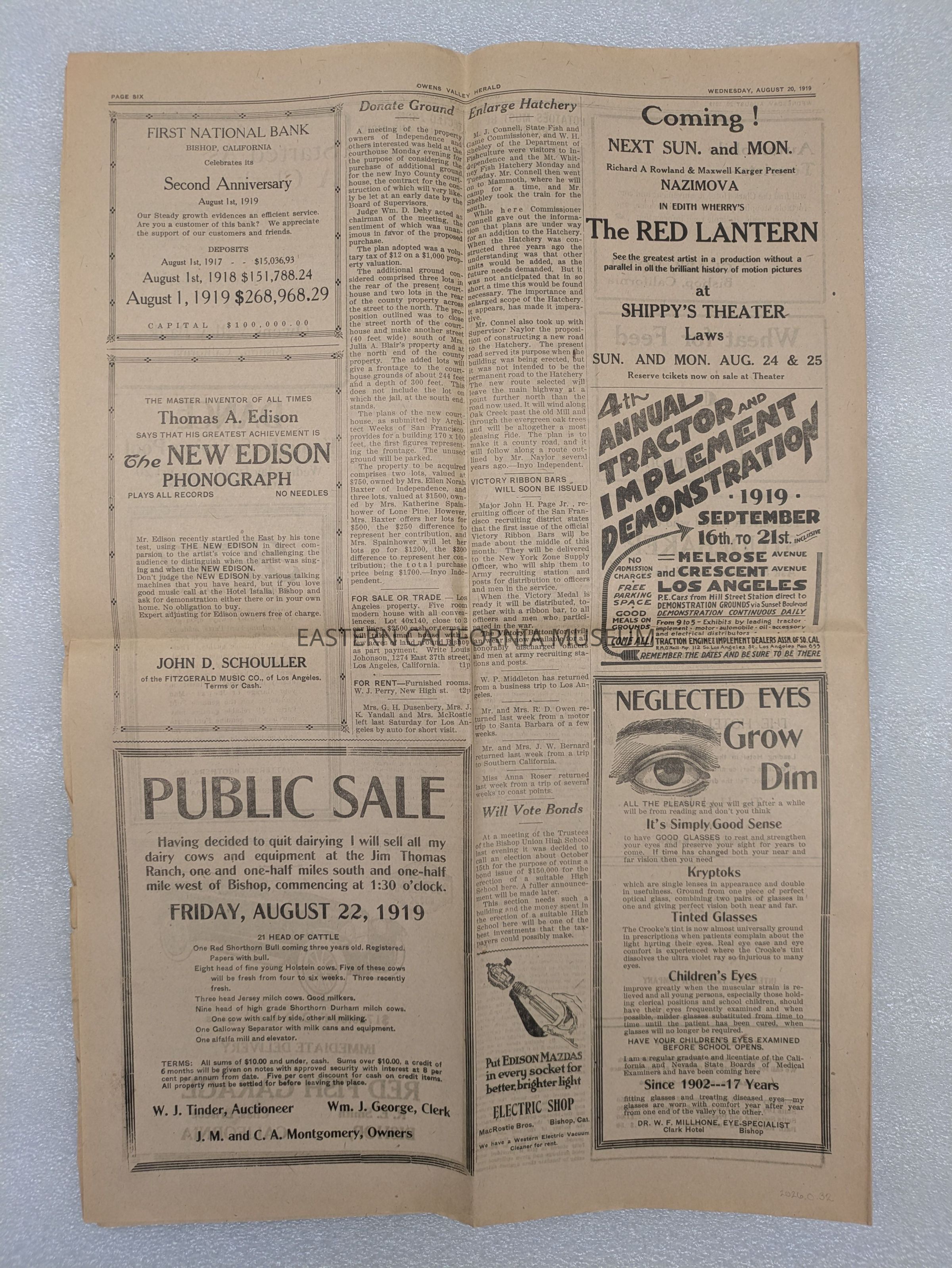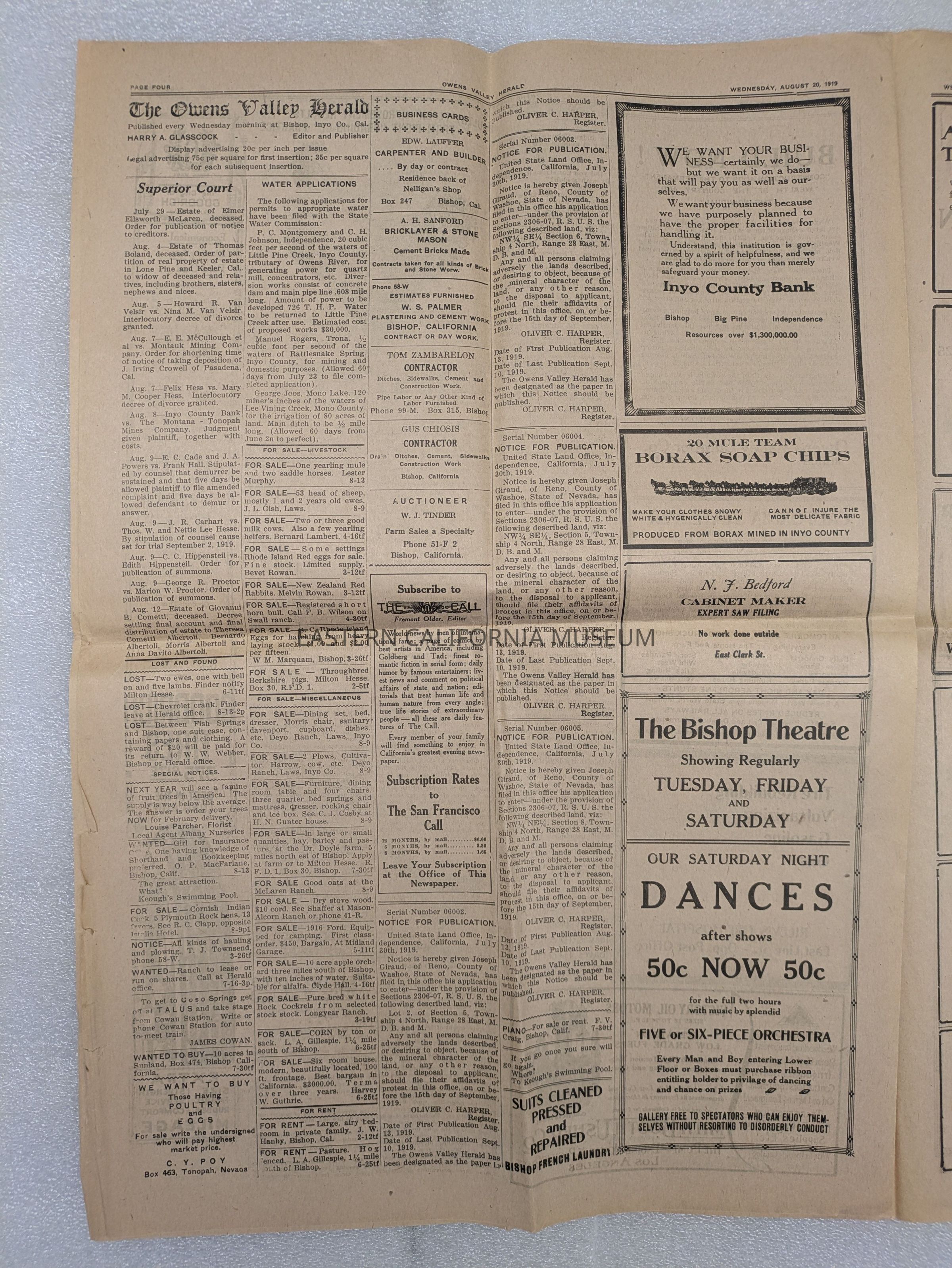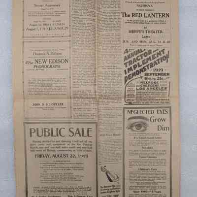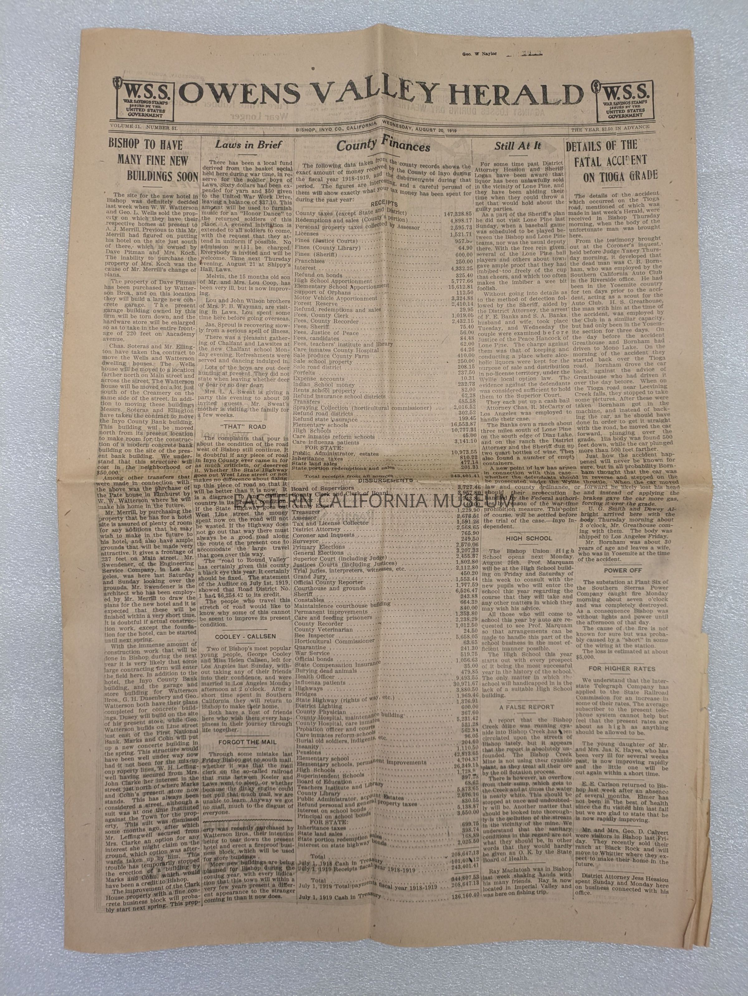 Newspaper: Owens Valley Herald, Vol. 11, No. 51, August 20, 1919. Stamped on front page: Geo. W. Naylor.