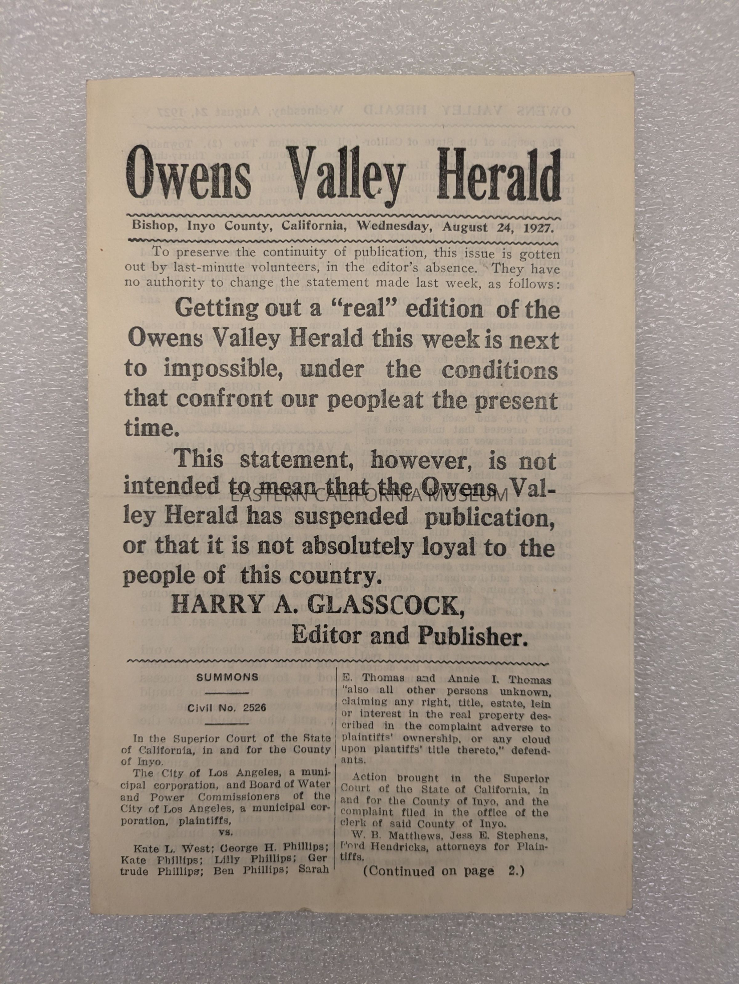 To preserve the continuity of publication, this issues is gotten out by last-minute volunteers, in the editor's absence. They have no authority to change the statement made last week, as follows: Getting out a "real" edition of the Owens Valley Herald this week is next to impossible, under the conditions that confront our people at the present time. This statement, however, is not intended to mean that the Owens Valley Herald has suspended publication, or that it is not absolutely loyal to the people of this country.Publication Details