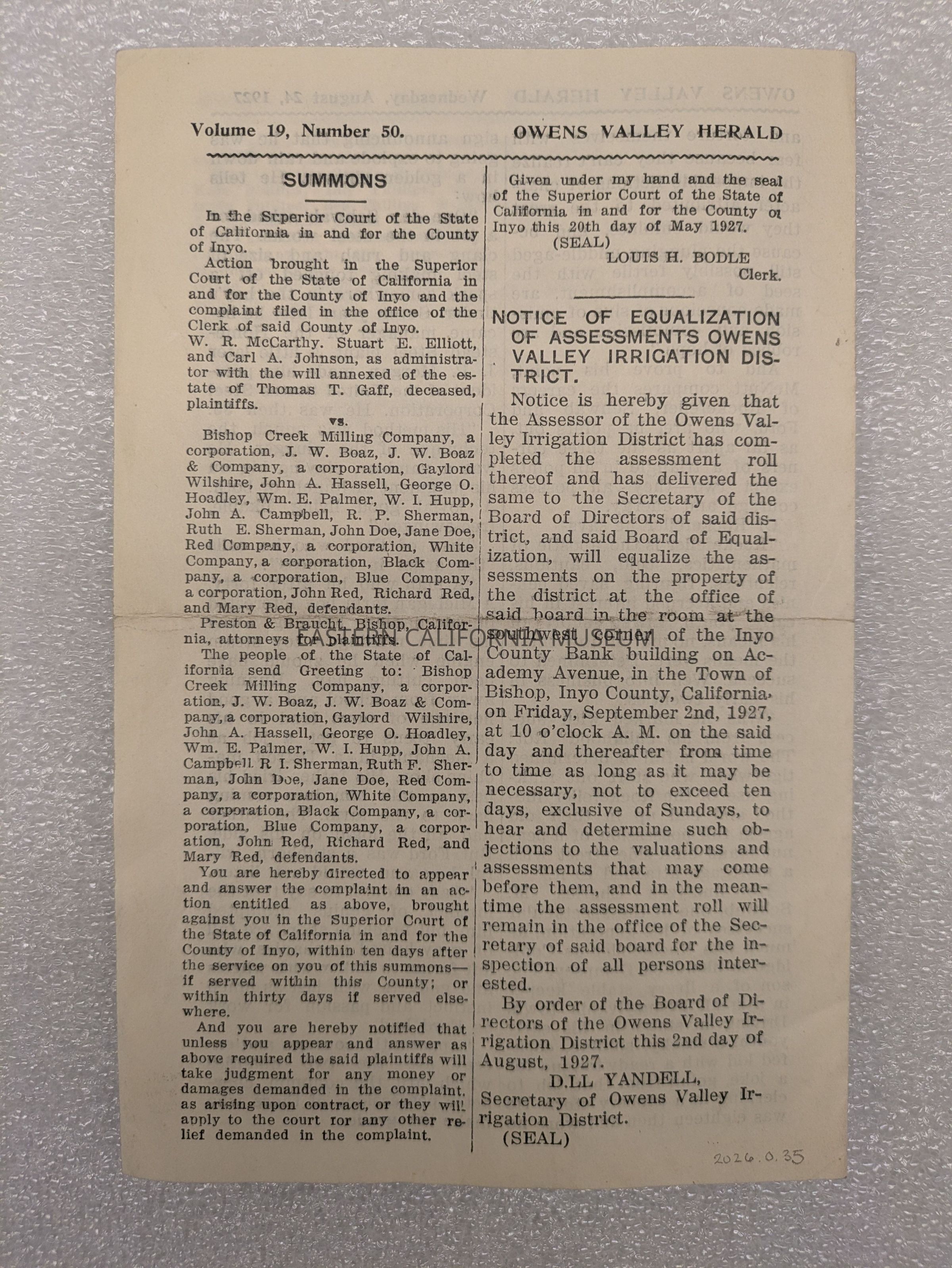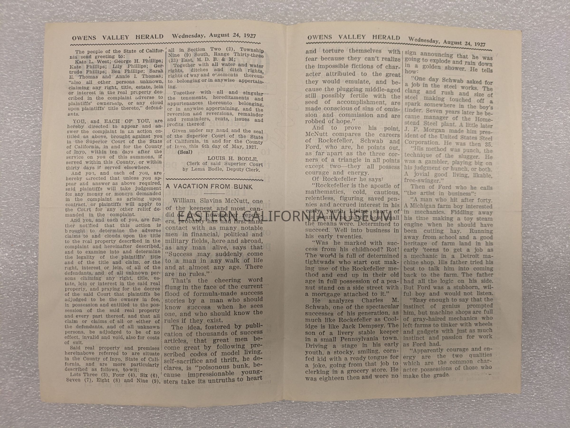 Newspaper: Owens Valley Herald, Vol. 19, No. 50, August 24, 1927.