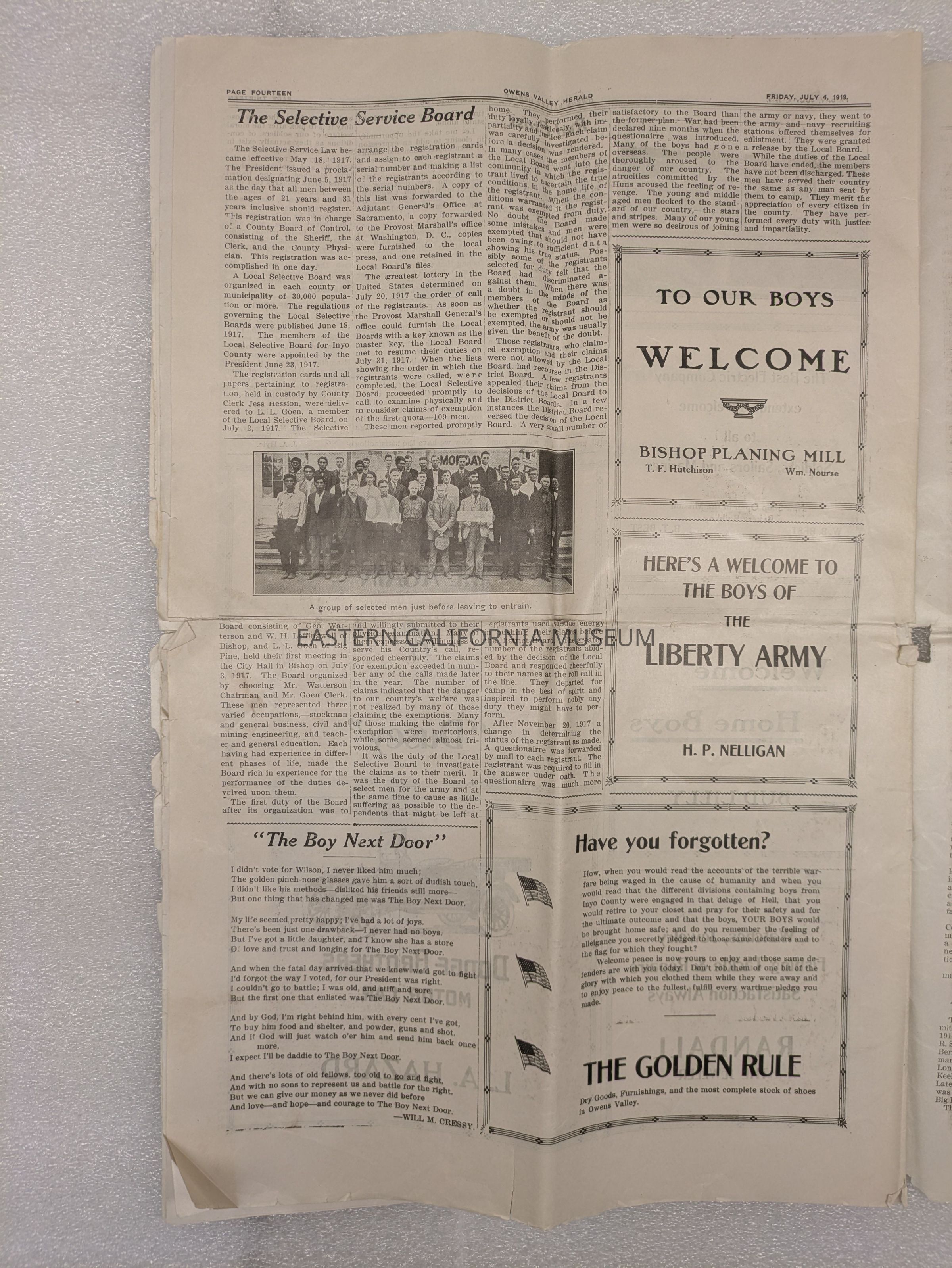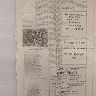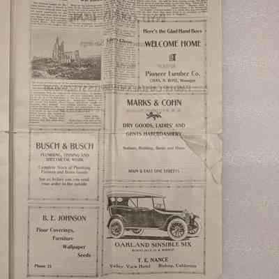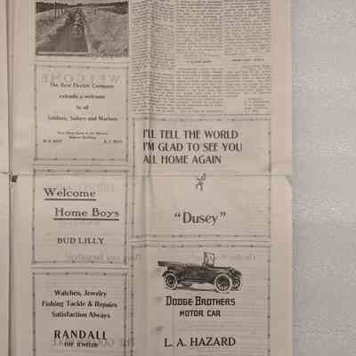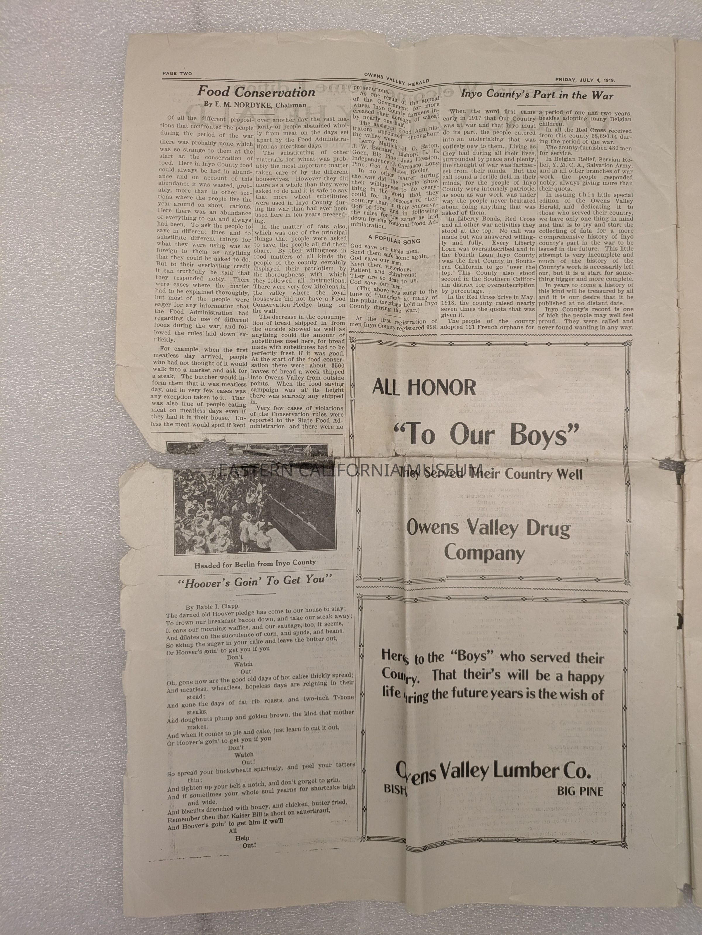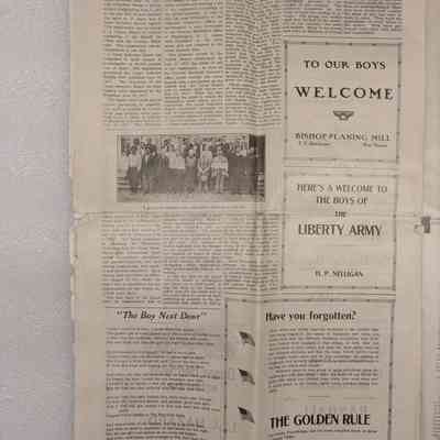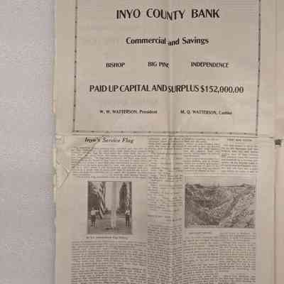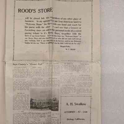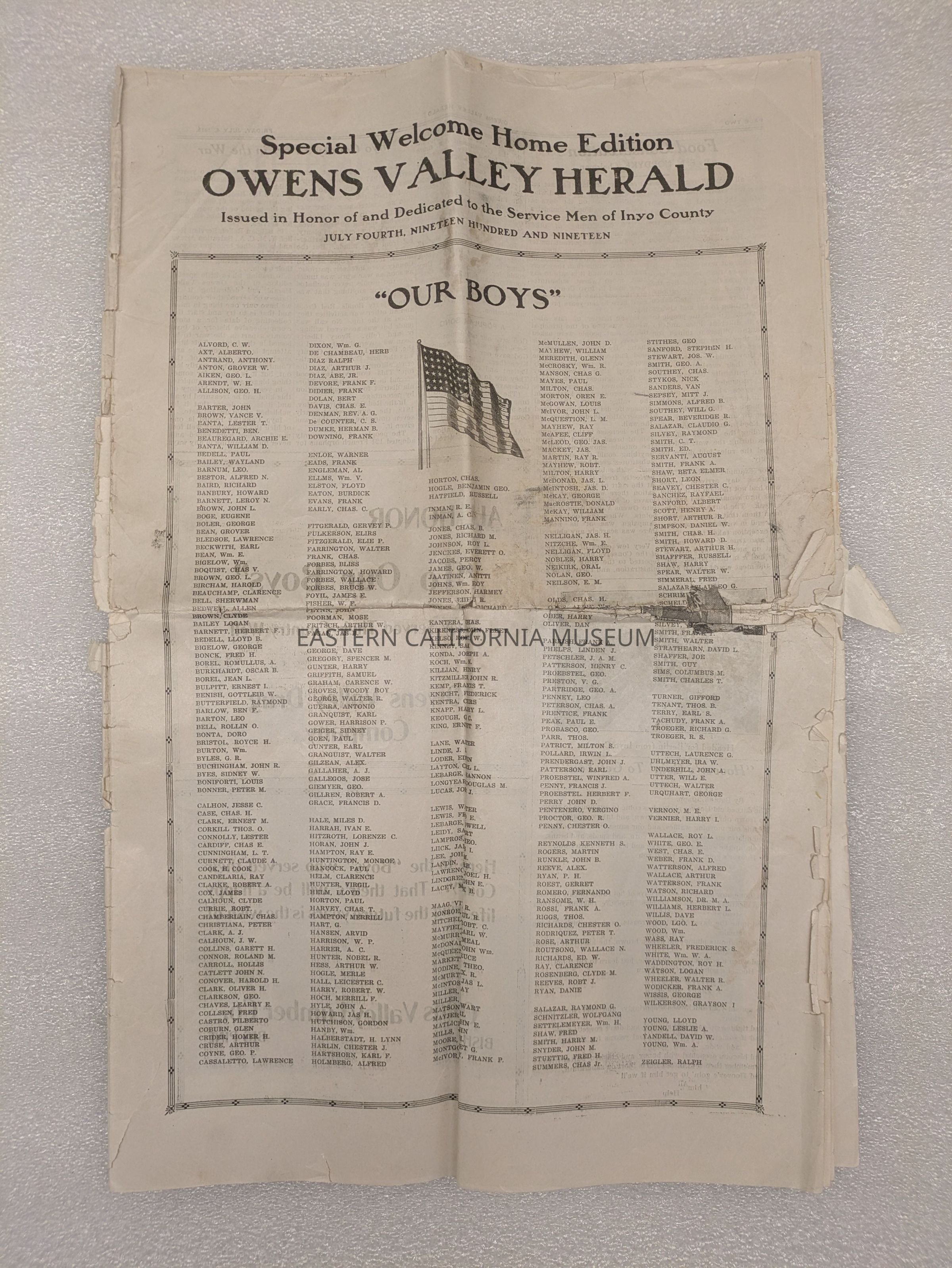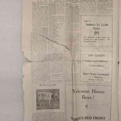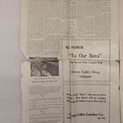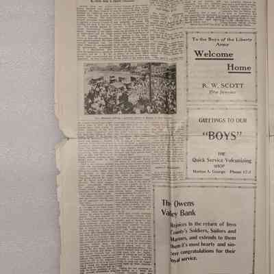 Newspaper: Owens Valley Herald, Special Welcome Home Edition Issued in Honor of and Dedicated to the Service Men of Inyo County, July 4, 1919. Contains article titled "Our Boys" giving names of Inyo County servicemen.