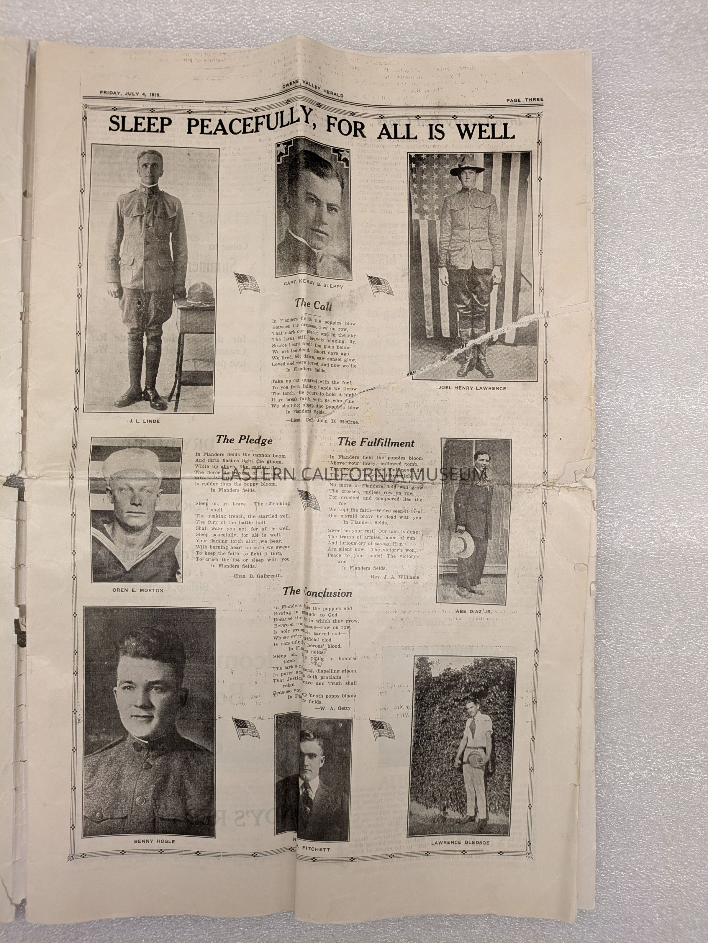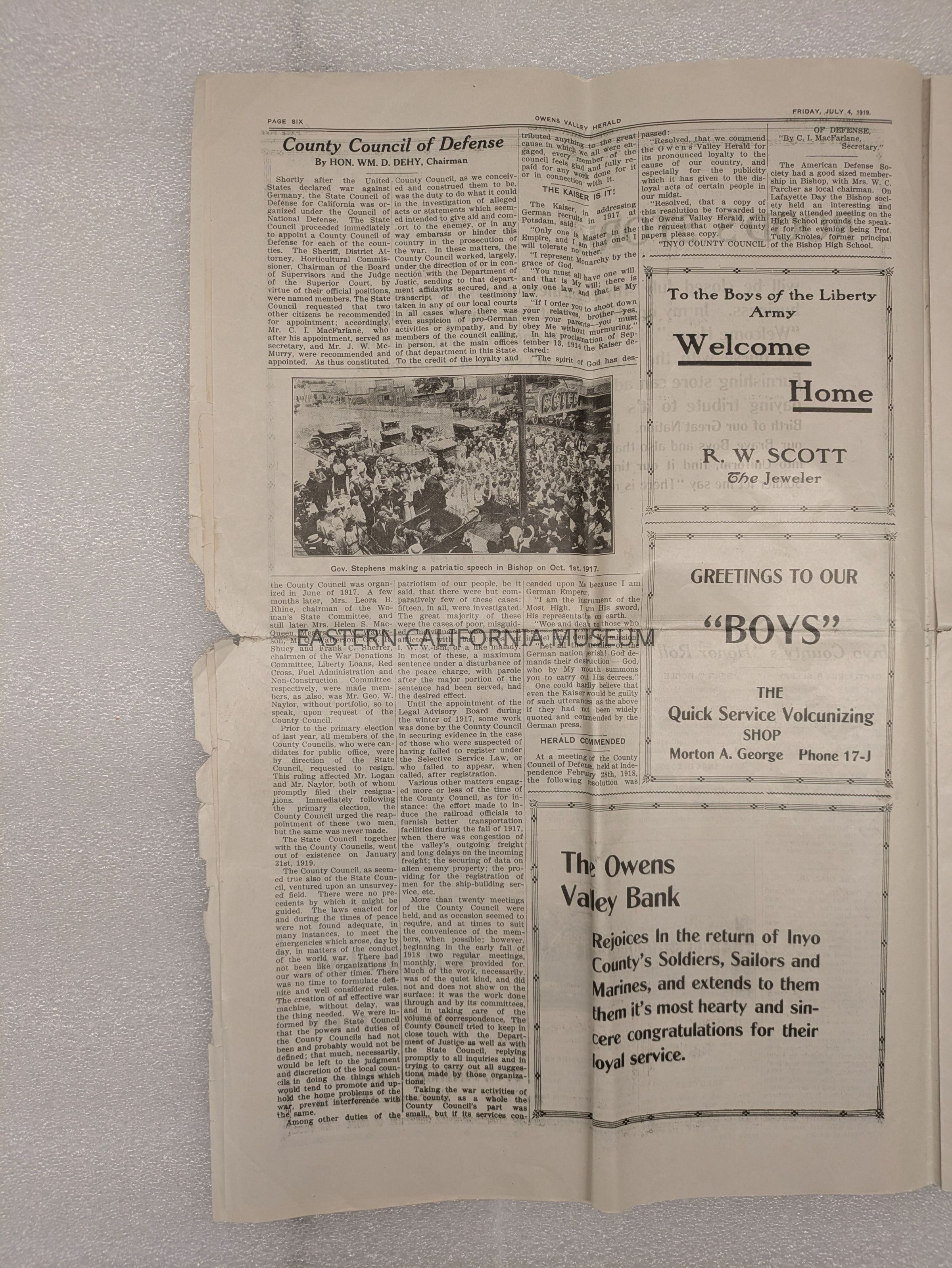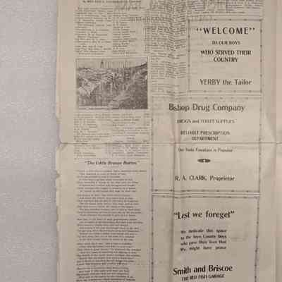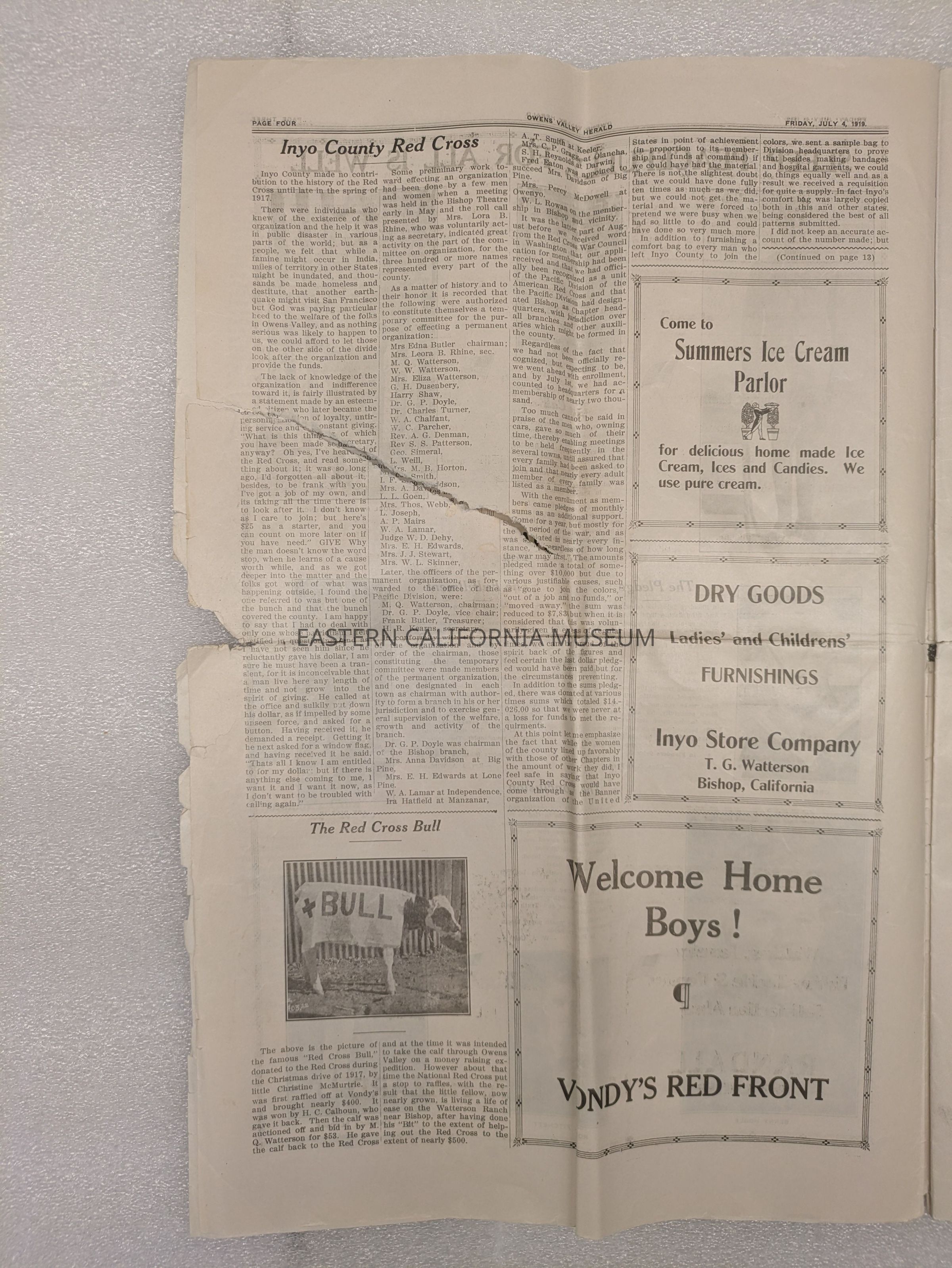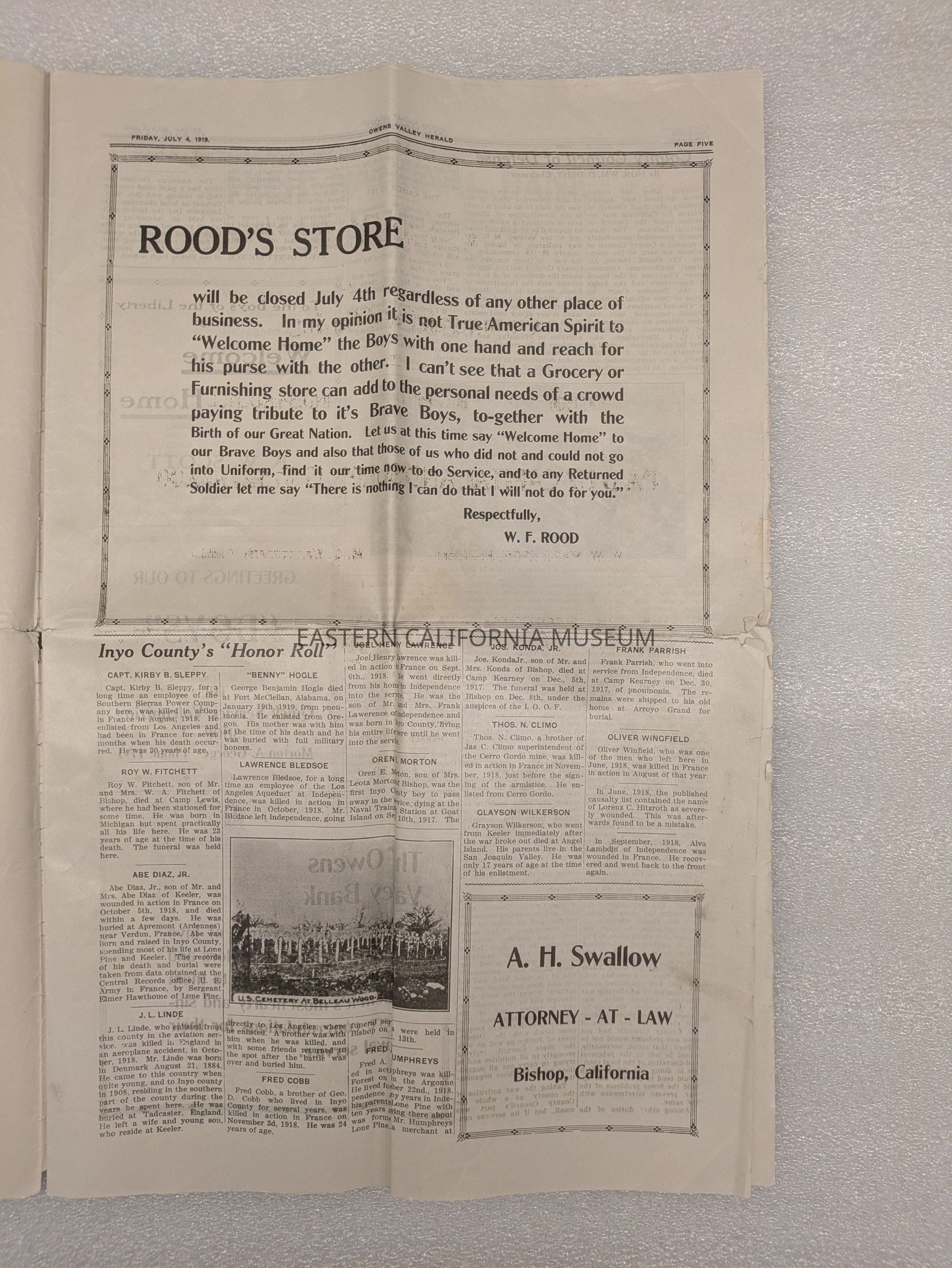 Newspaper: Owens Valley Herald, Special Welcome Home Edition Issued in Honor of and Dedicated to the Service Men of Inyo County, July 4, 1919. Contains article titled "Our Boys" giving names of Inyo County servicemen.