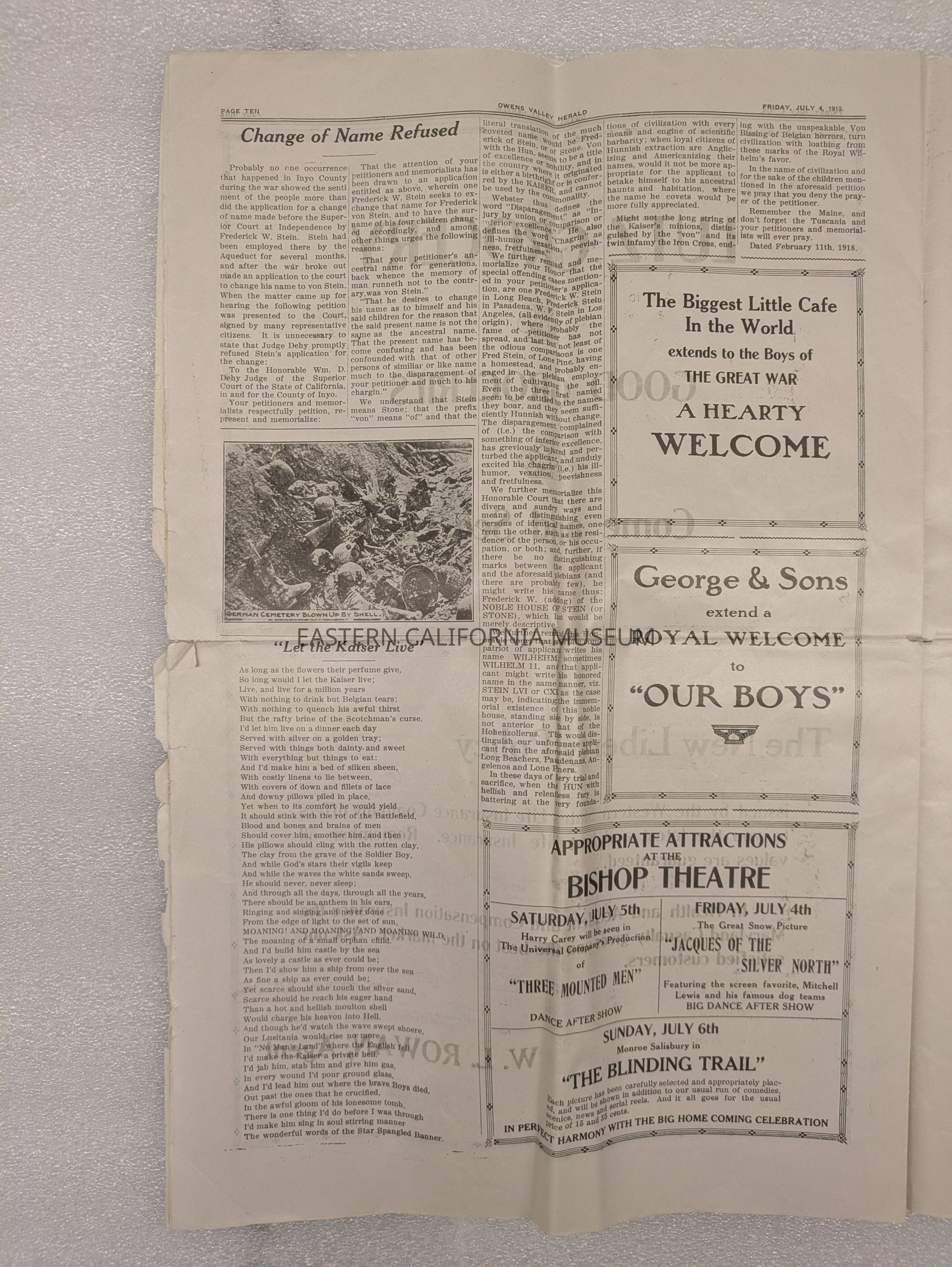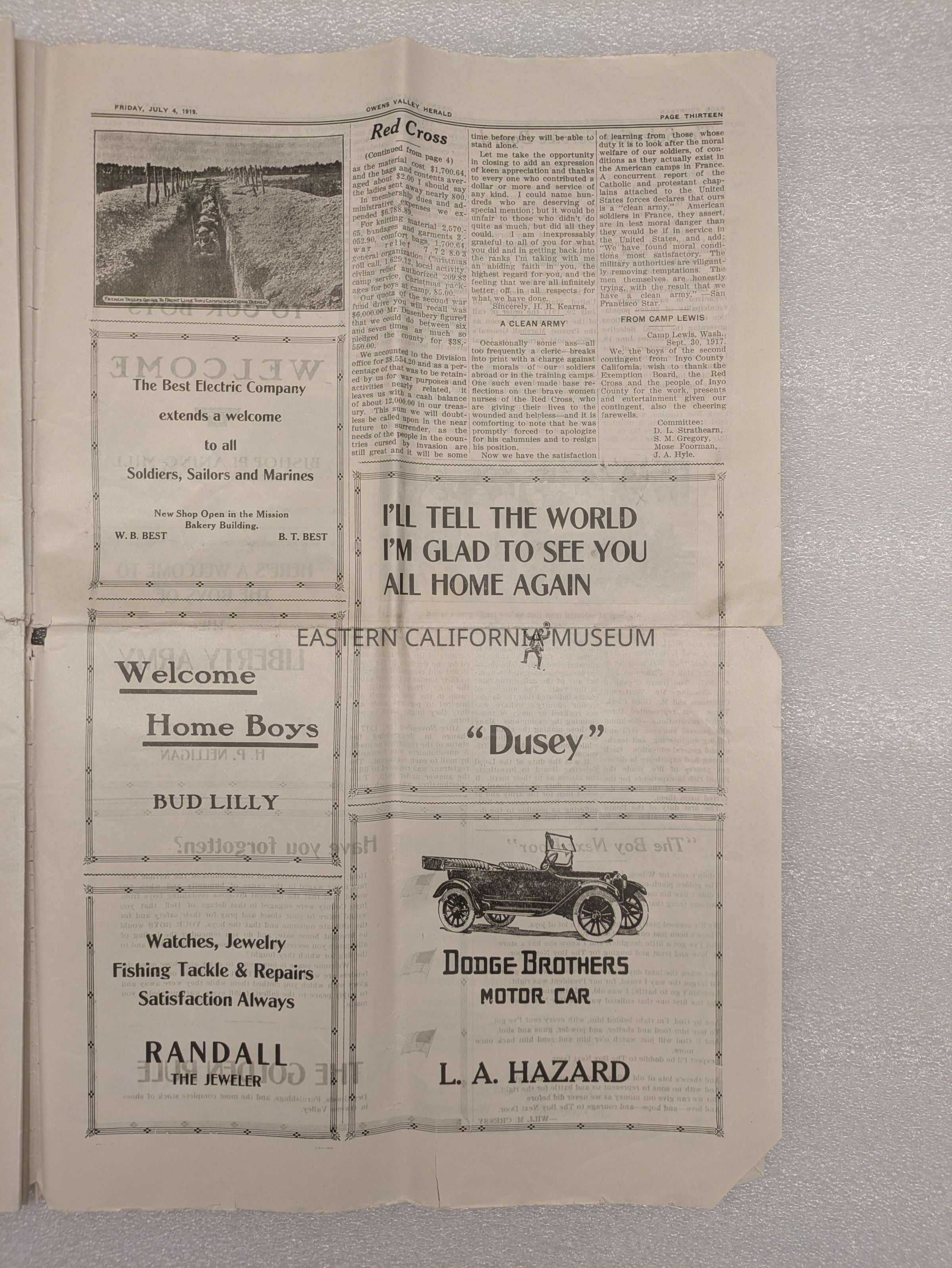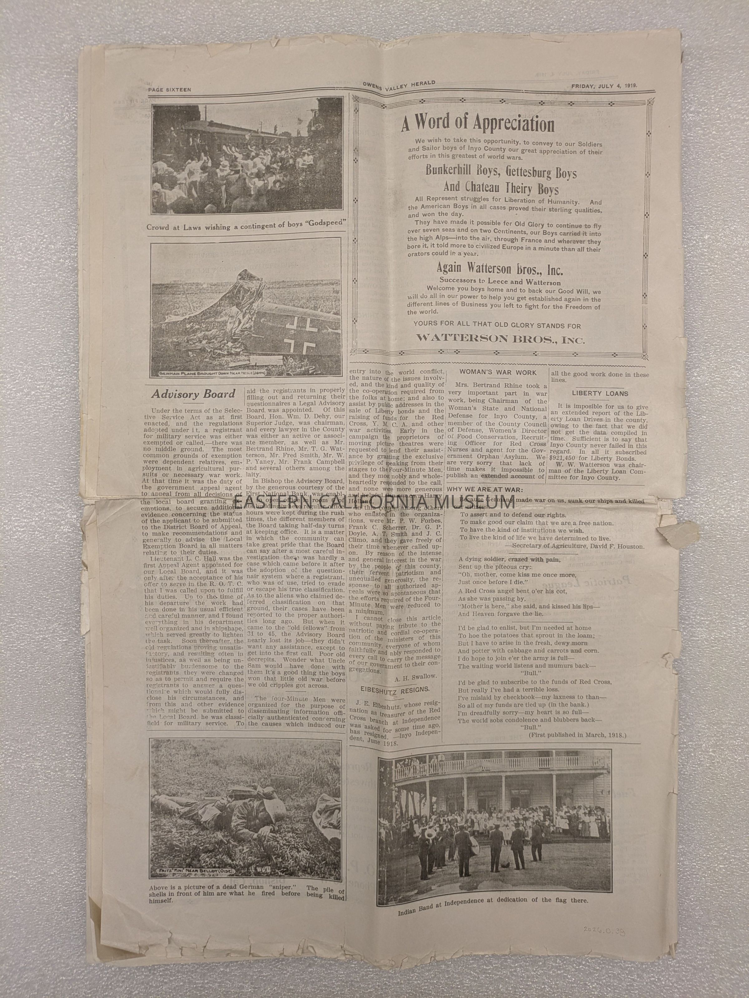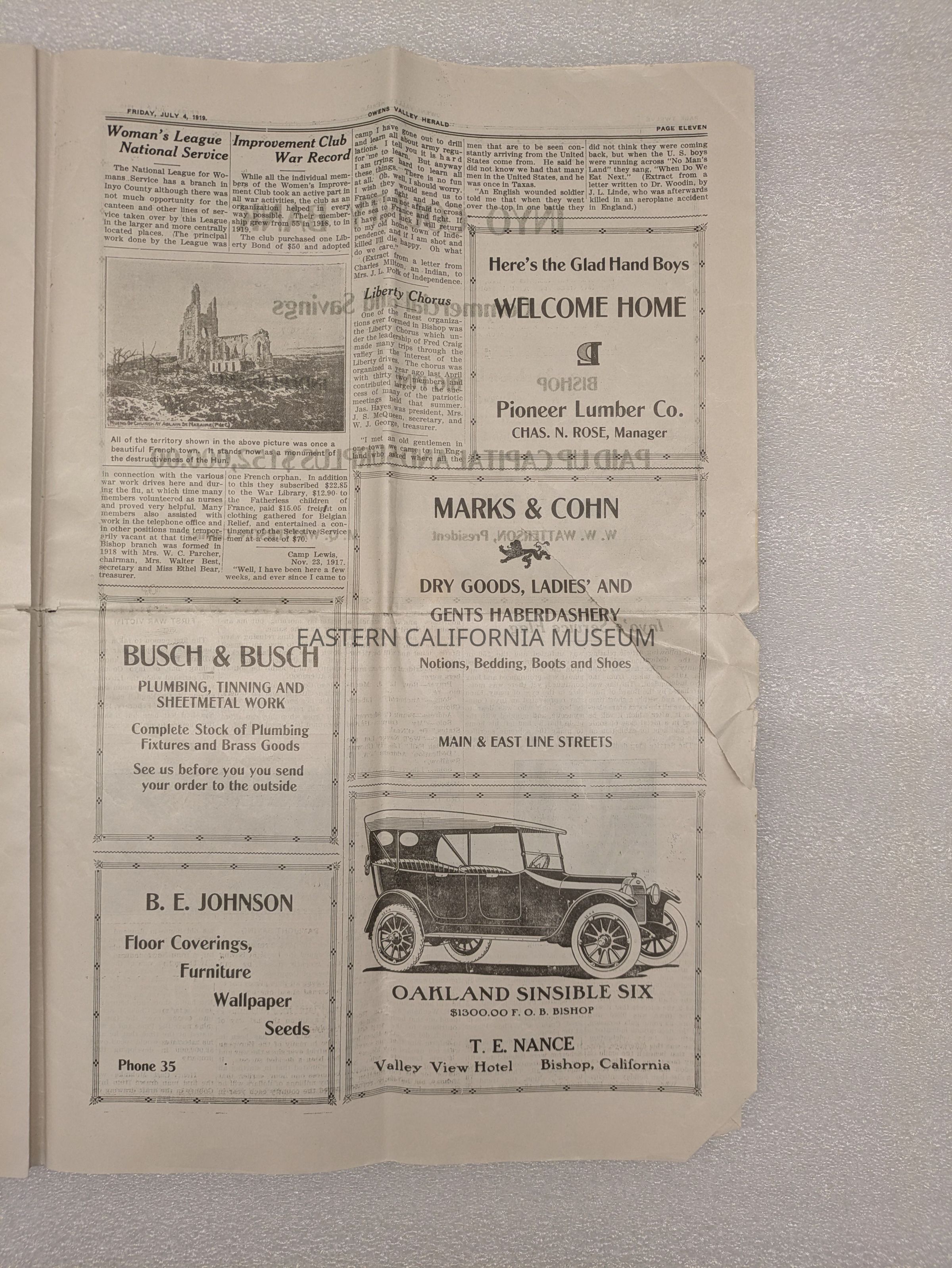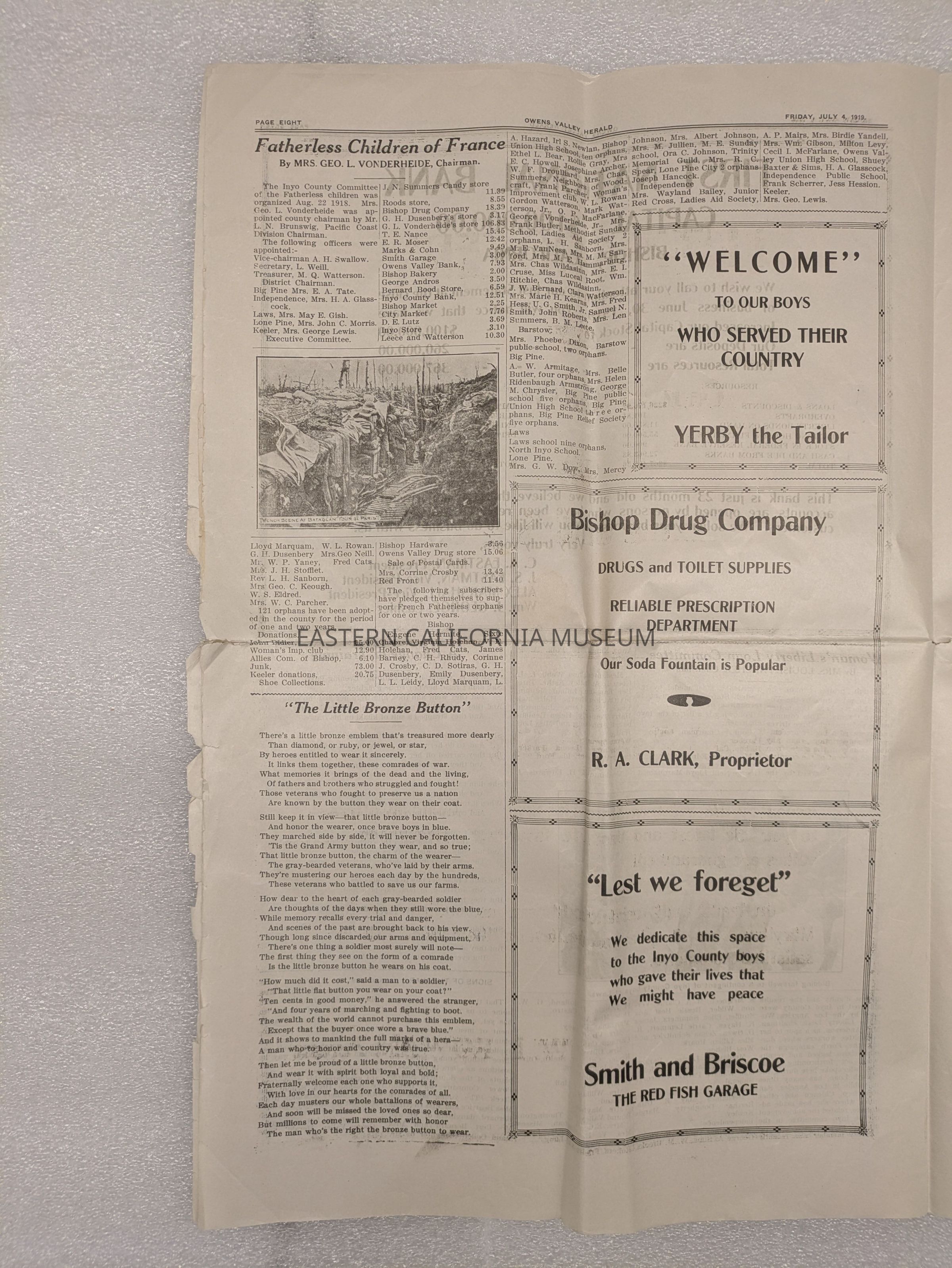 Newspaper: Owens Valley Herald, Special Welcome Home Edition Issued in Honor of and Dedicated to the Service Men of Inyo County, July 4, 1919. Contains article titled "Our Boys" giving names of Inyo County servicemen.