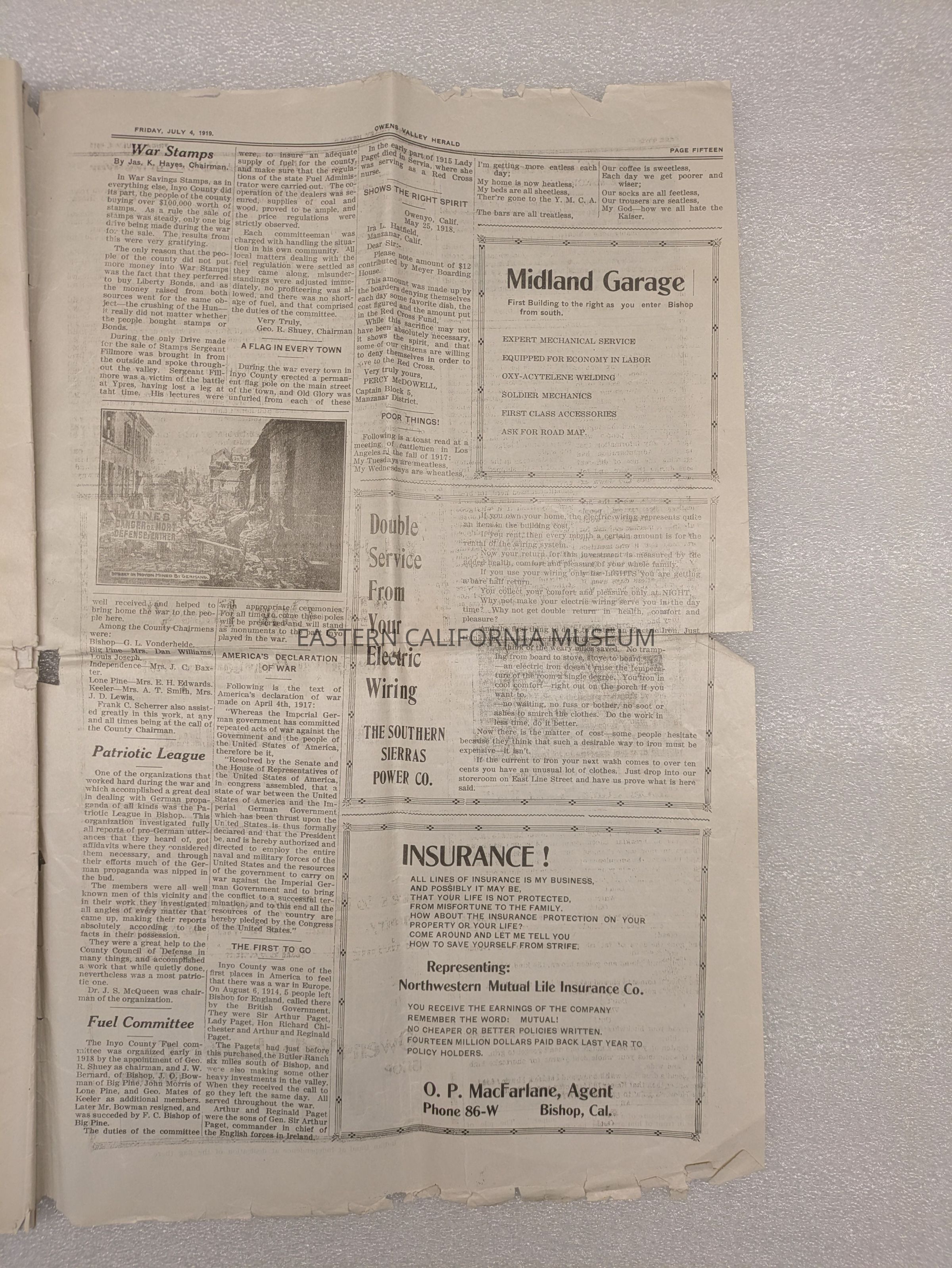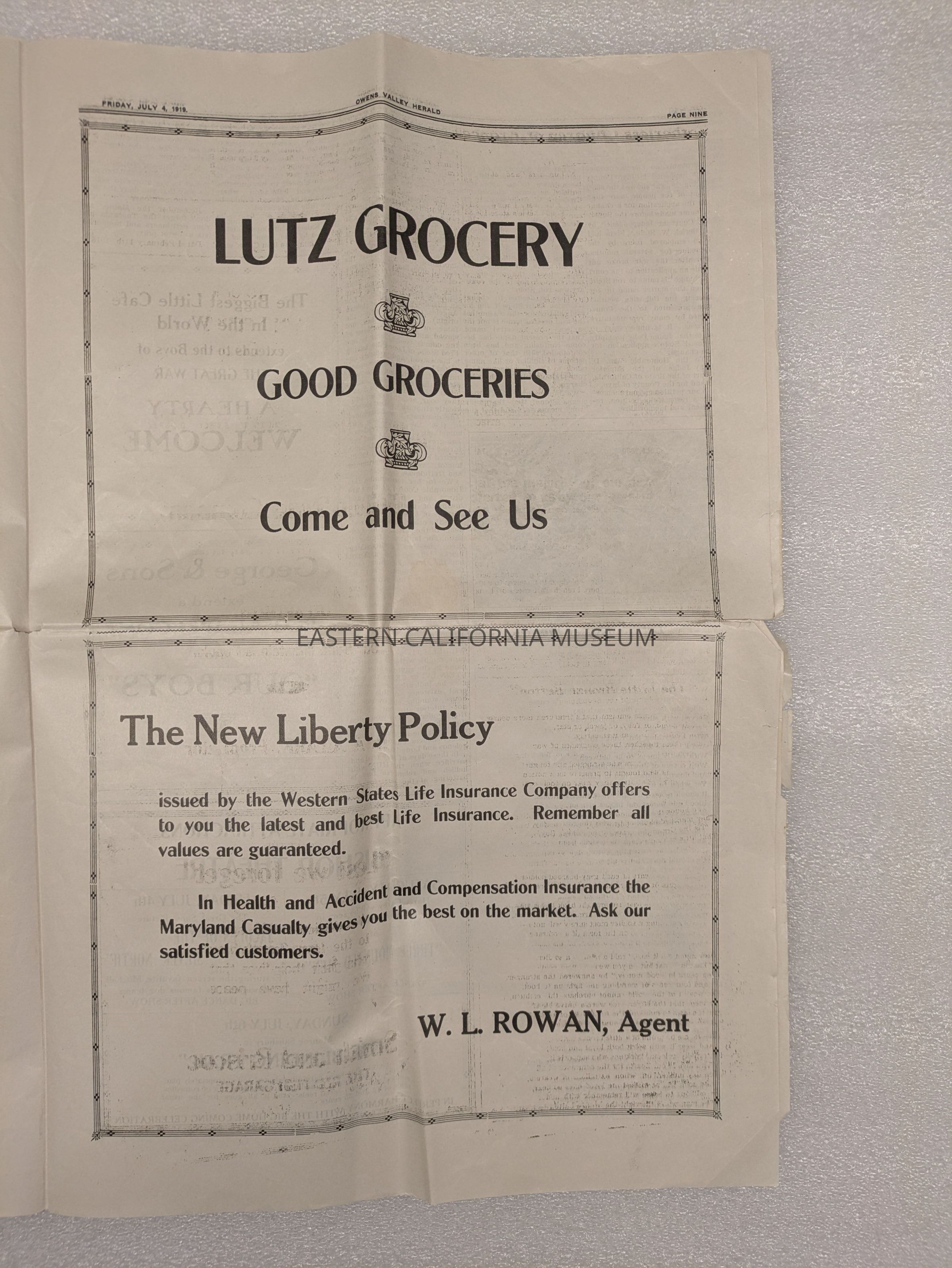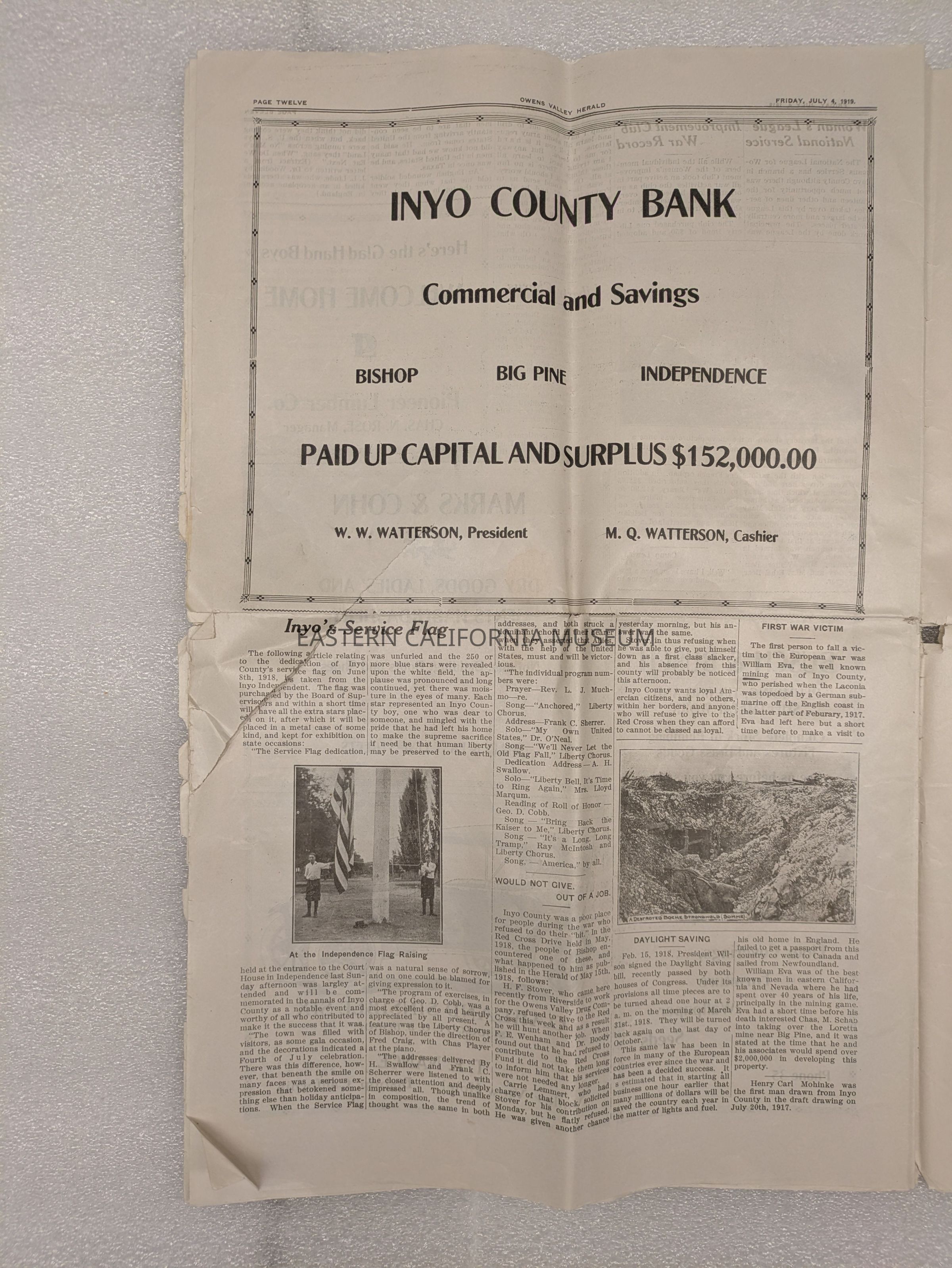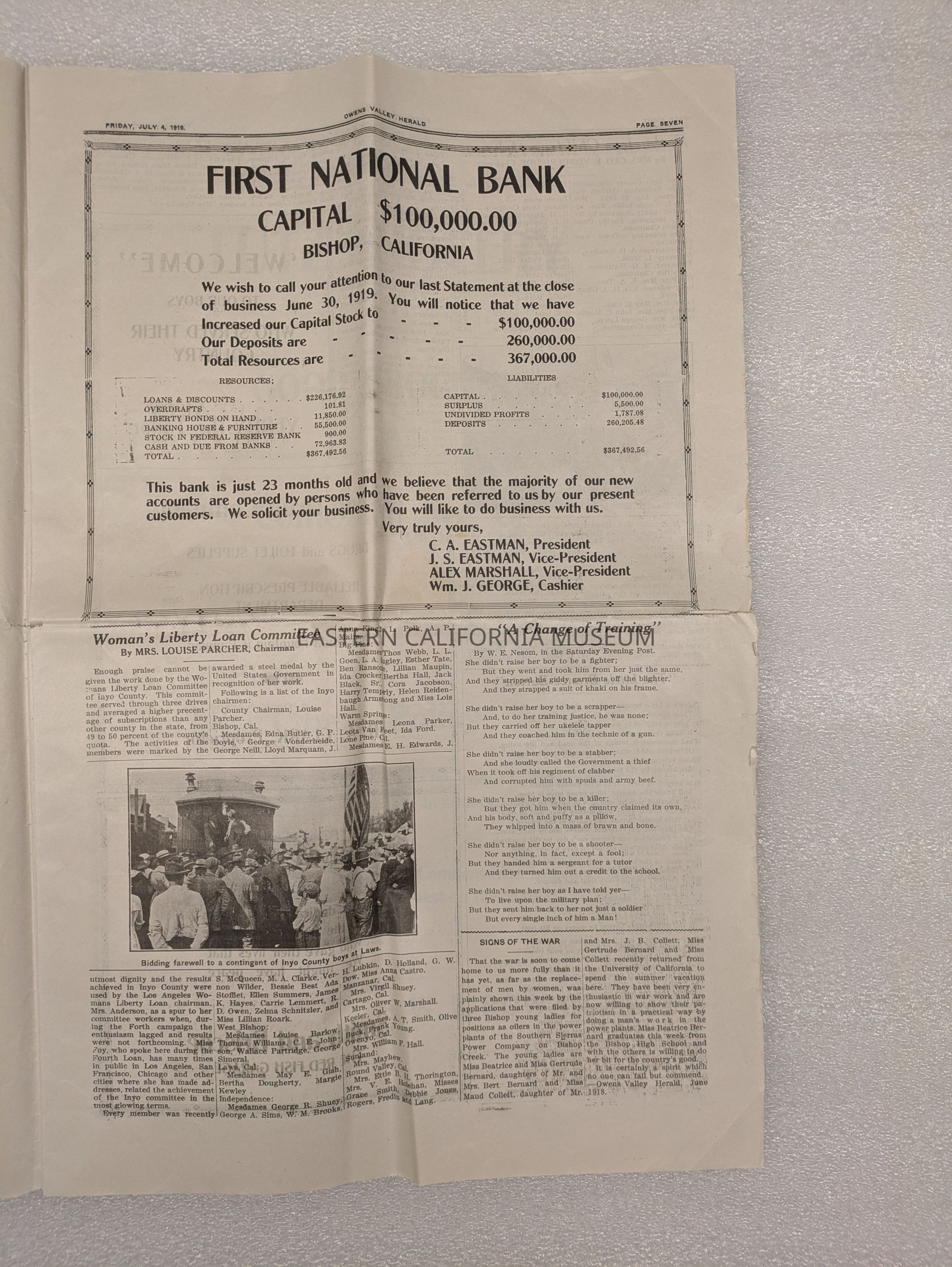 Newspaper: Owens Valley Herald, Special Welcome Home Edition Issued in Honor of and Dedicated to the Service Men of Inyo County, July 4, 1919. Contains article titled "Our Boys" giving names of Inyo County servicemen.