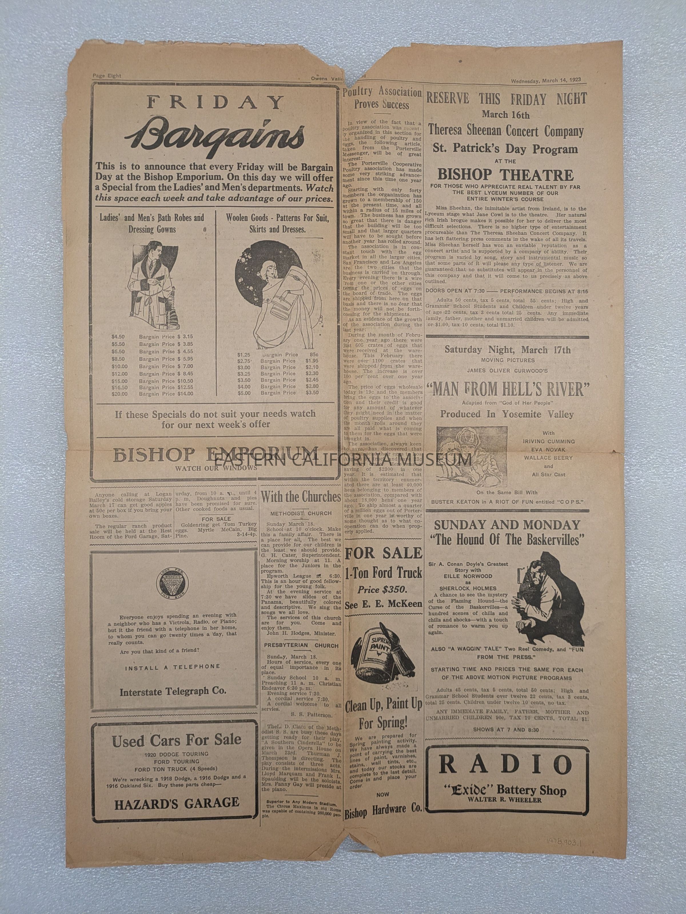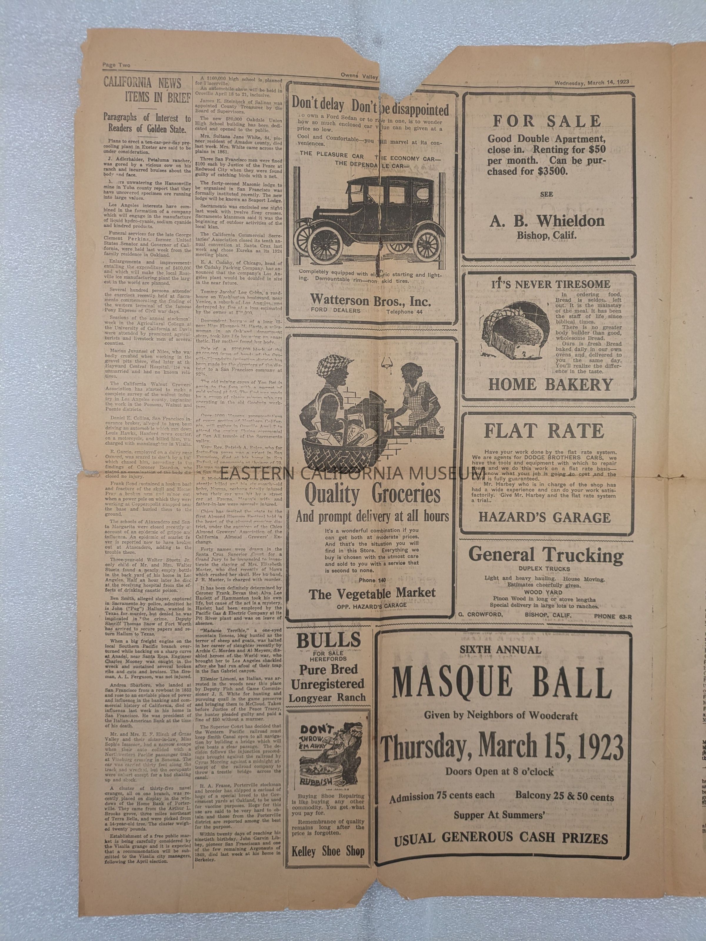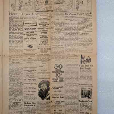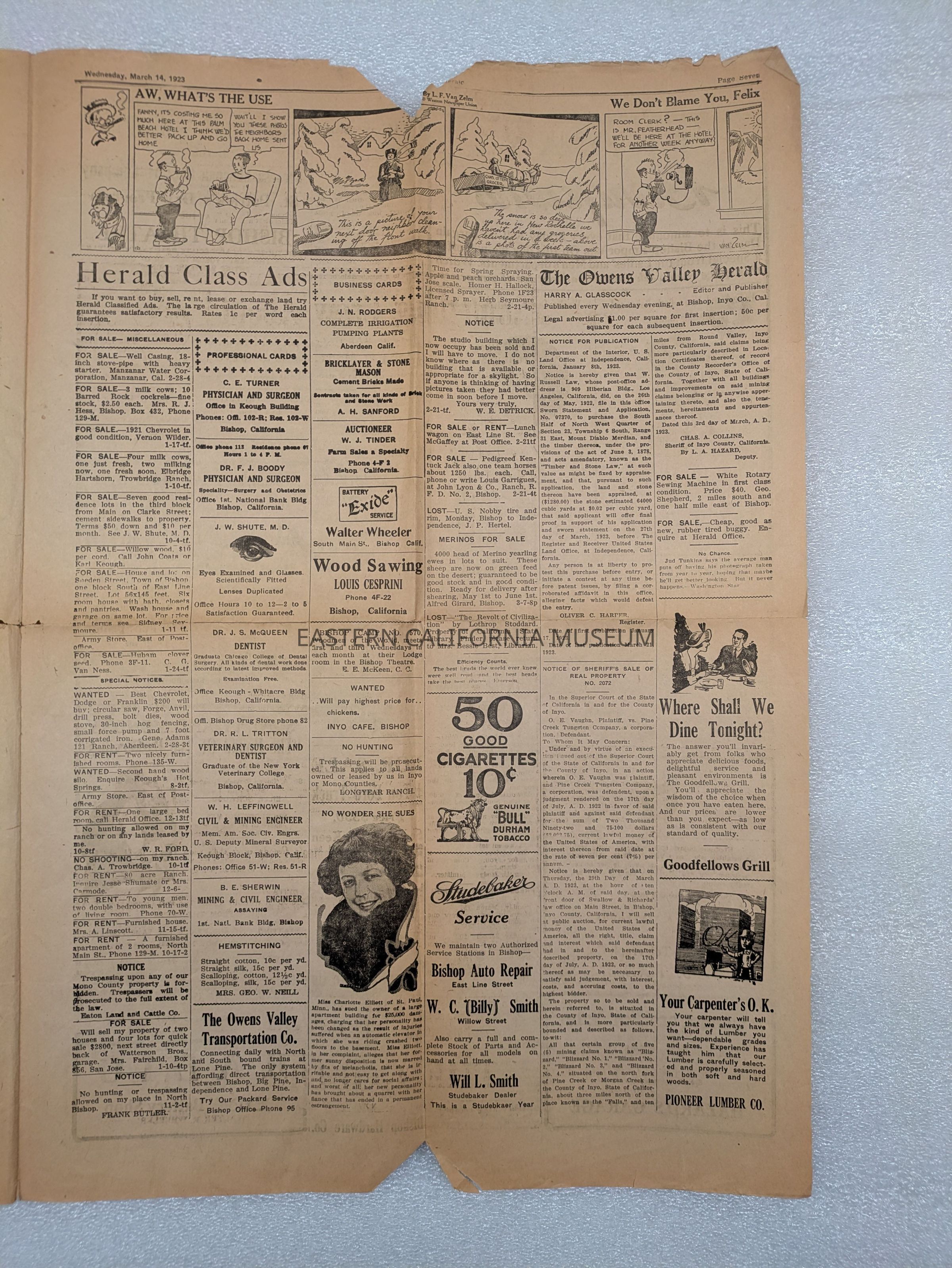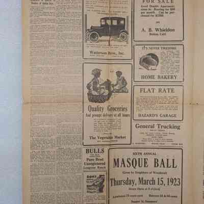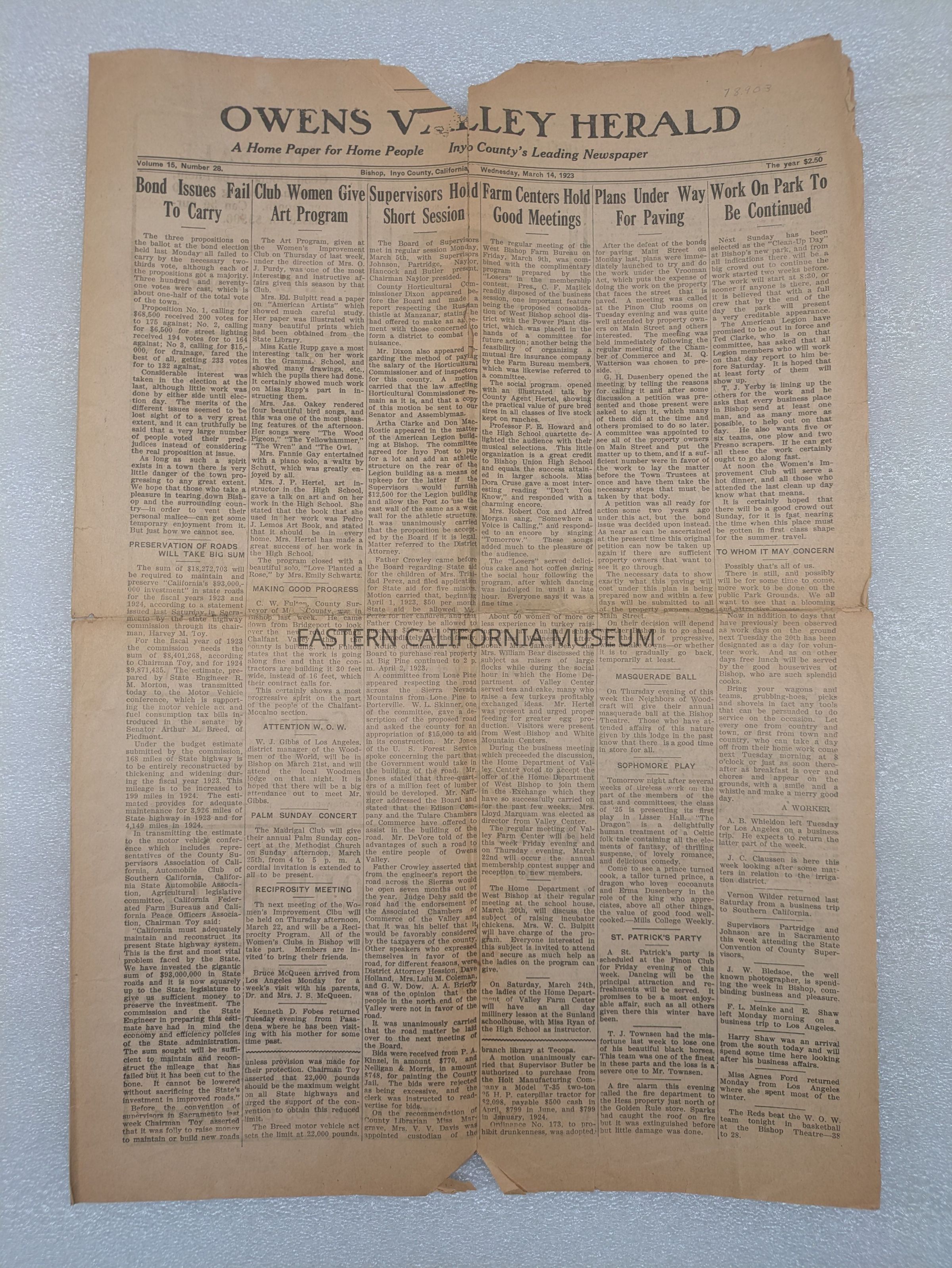Newspaper: Owens Valley Herald, Vol. 15, No. 28, March 14, 1923. Missing inner pages 3-6.Publication Details