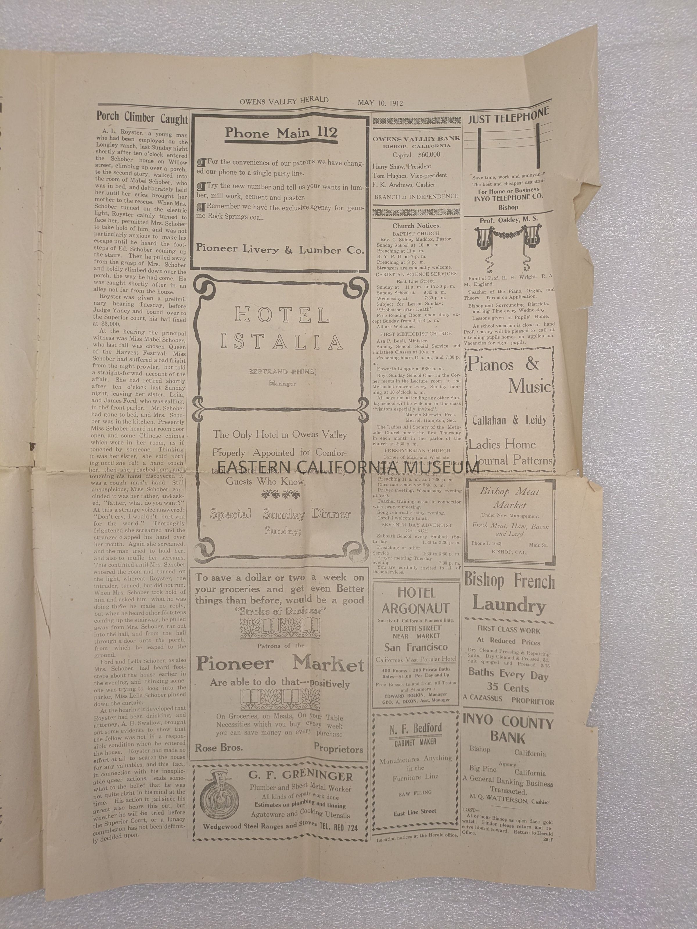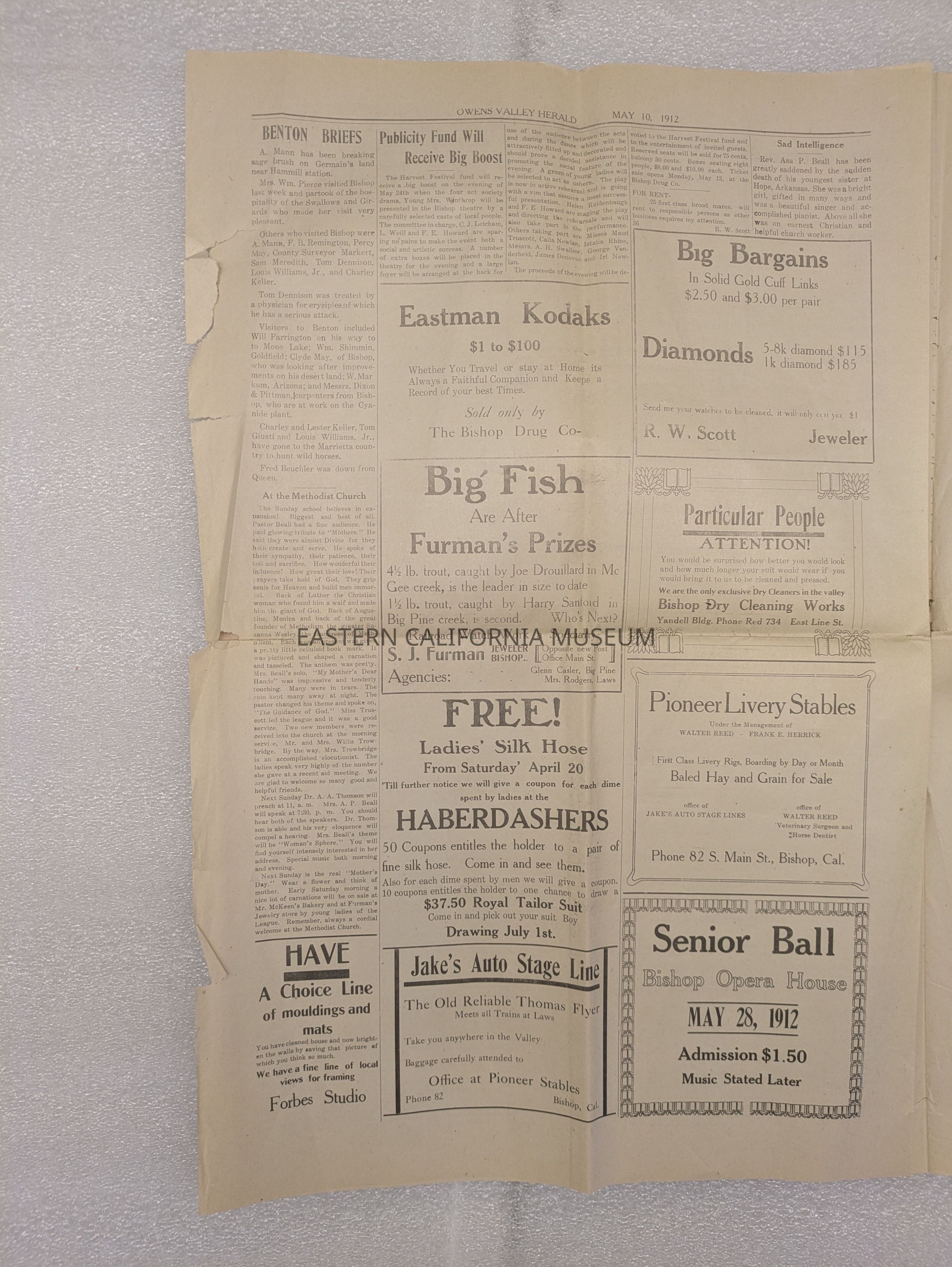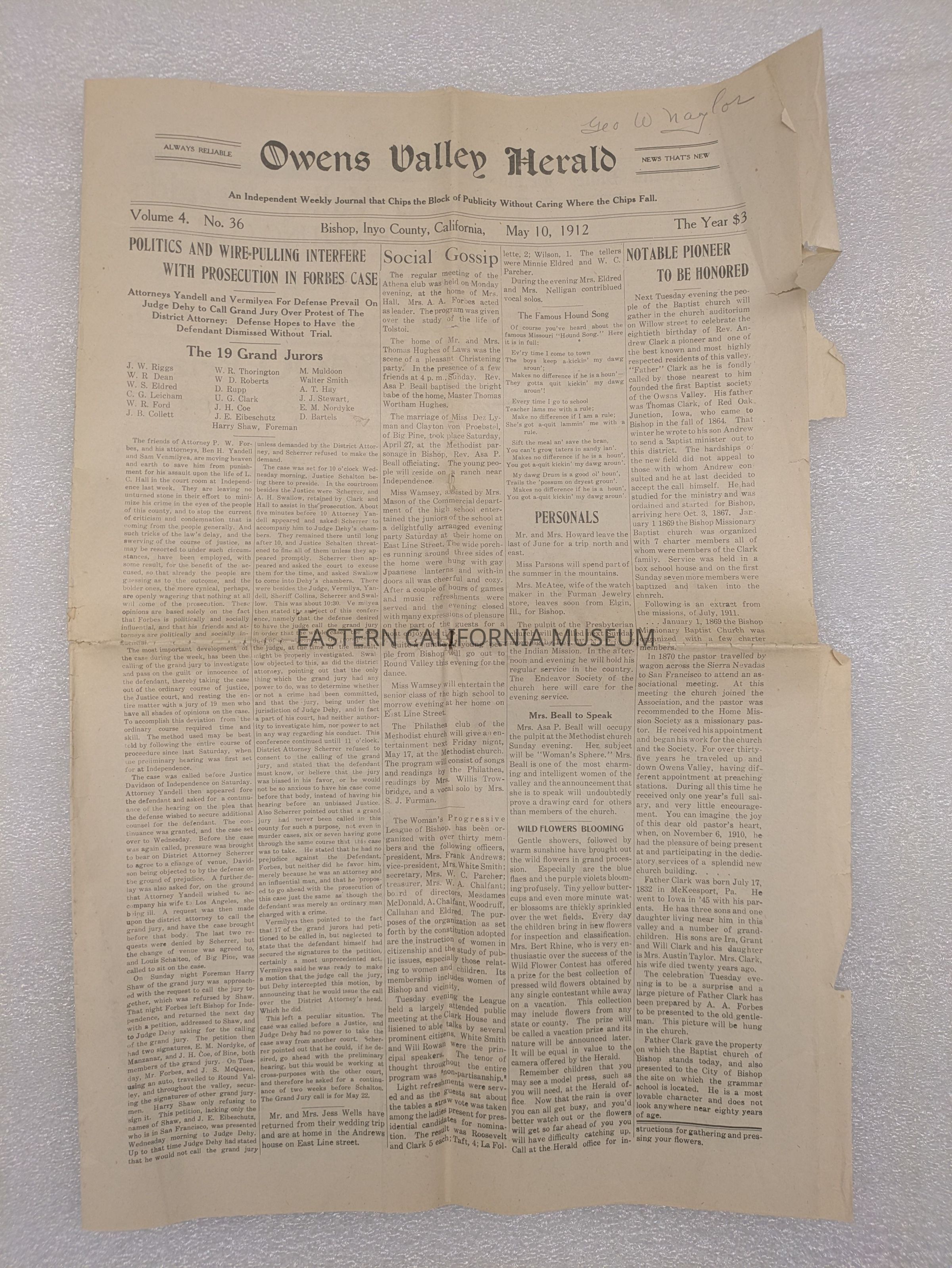 Newspaper: Owens Valley Herald, Vol. 4, No. 36, May 10, 1912. Written in pencil on front page: Geo. W. Naylor.