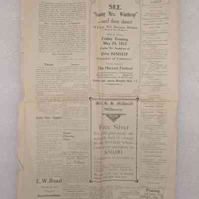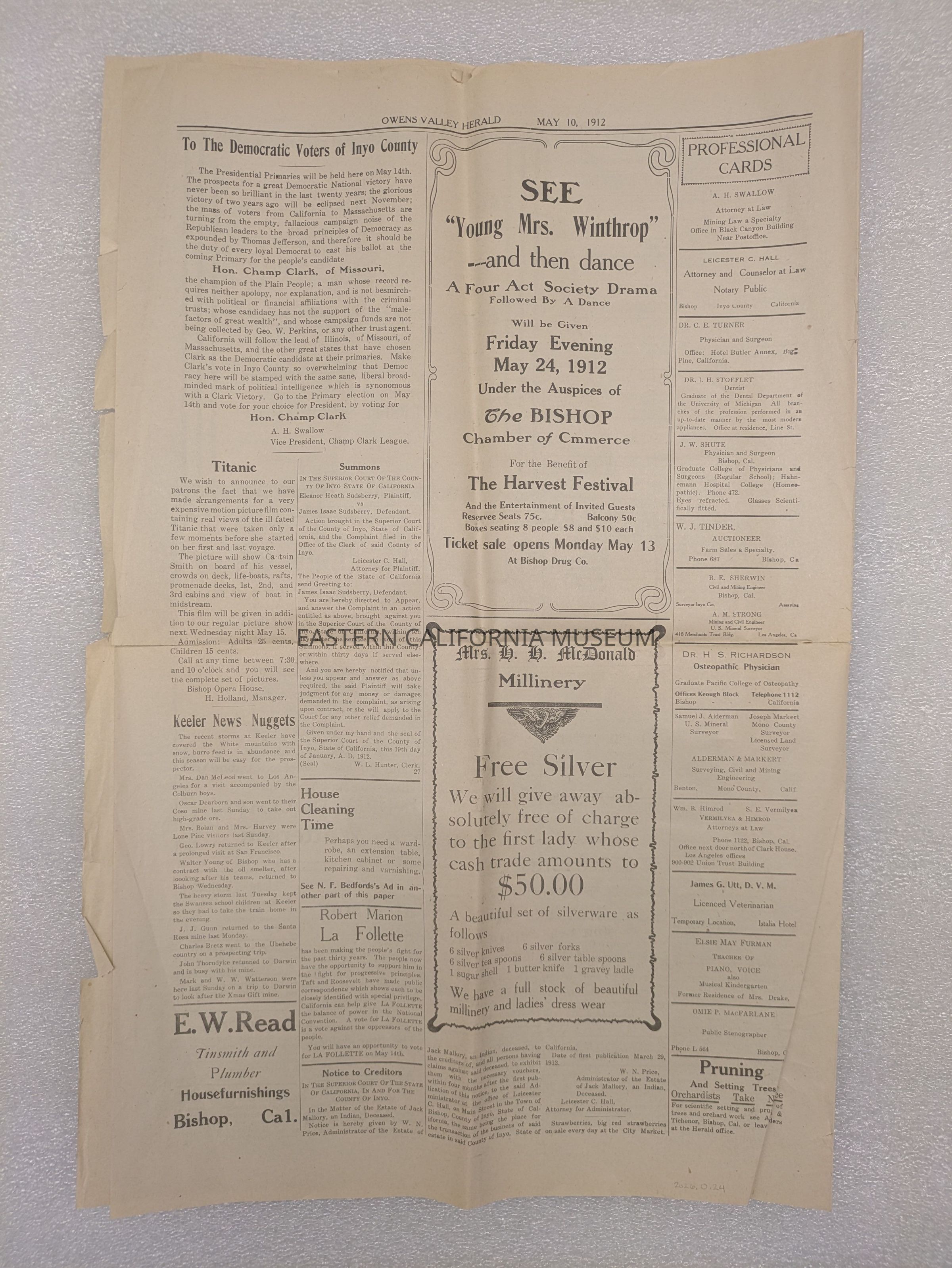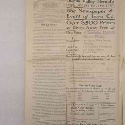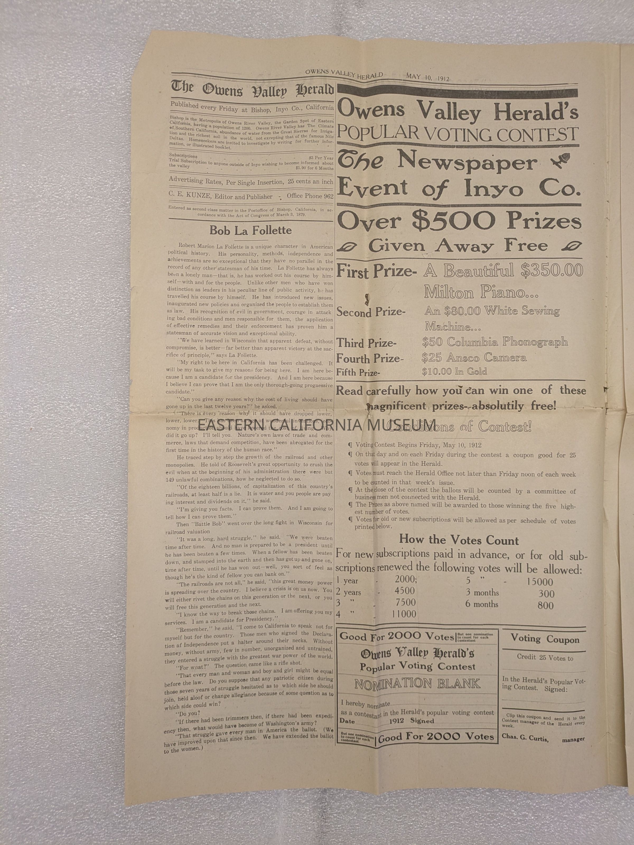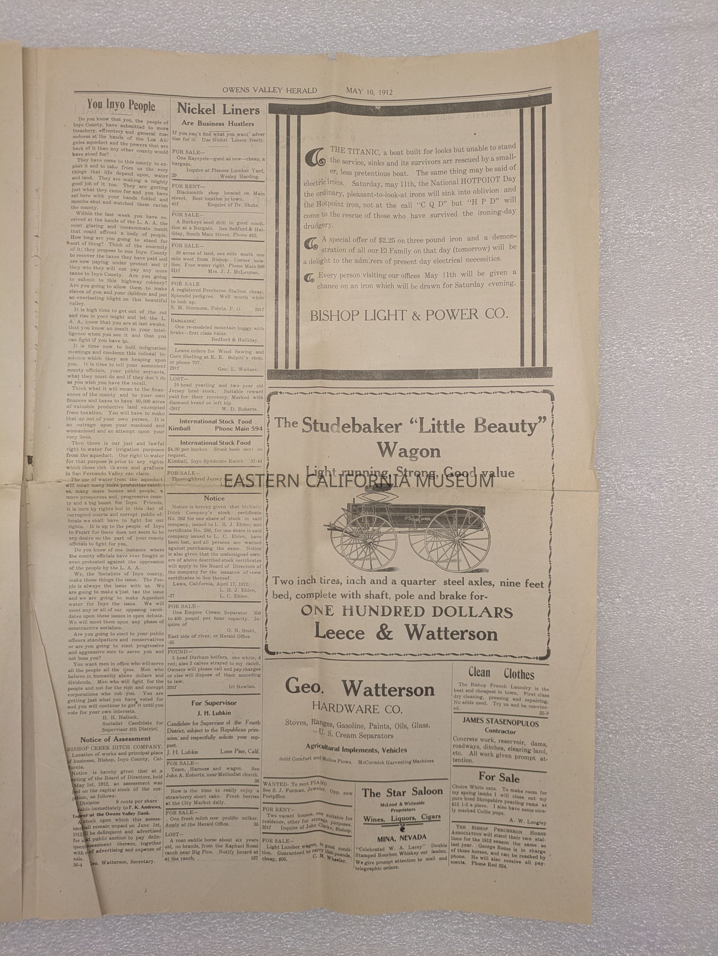 Newspaper: Owens Valley Herald, Vol. 4, No. 36, May 10, 1912. Written in pencil on front page: Geo. W. Naylor.