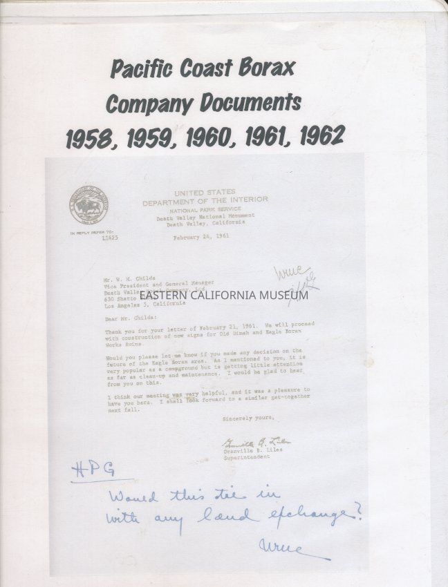 This is a 2 1/'2" thick white loose leaf binder with documents including in-house letters regarding Furnace Creek Inn and suggested layout regarding for the ranch. There is also a document titled Moss Investigation l956 Land Exchange Legislation regarding a museum in Death Valley white loose leaf binder with insert on front; approx. 60 pages, 10" wide, 11.5" high x 1" thick/deep. Each page is in a plastic sheet.Publication Details