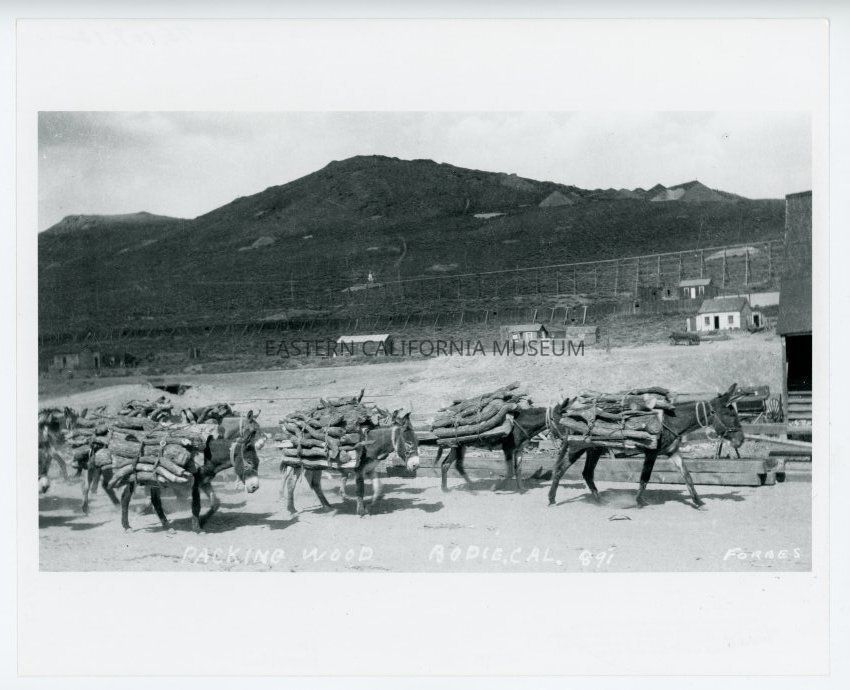 Photo of four to seven mules hauling wood. There is an interesting trestle in the background--maybe to transport ore carts or water? Written on front: Packing wood, Bodie, Cal., Forbes, 891.