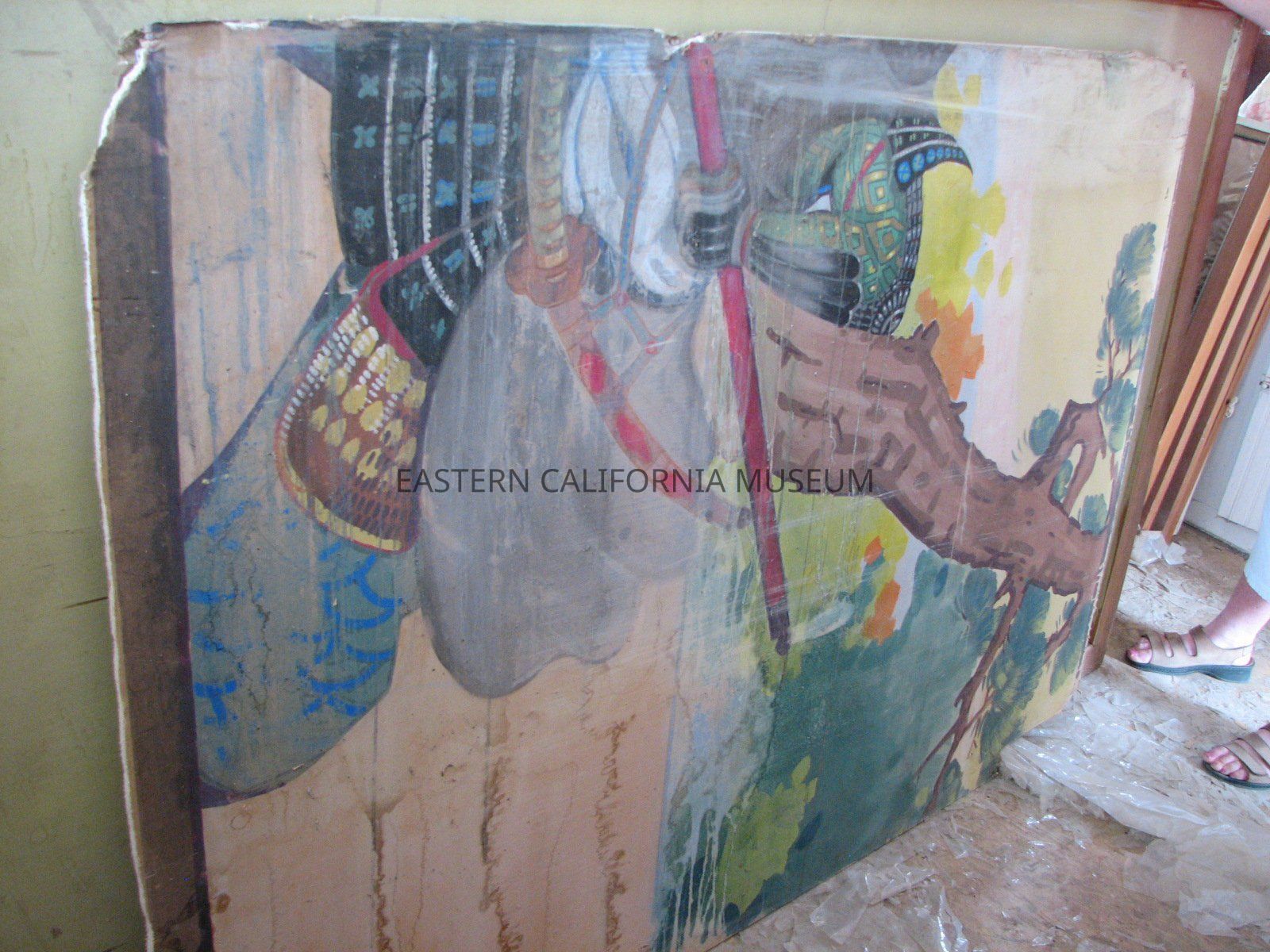 Painting on drywall of Benkei and Ushiwakamaru, part of a triptych by Henry Masauke Kumano, 48" x 69.5". At various times labeled "1955.01-ManzPaint 06" and "ECM 06" in loan paperwork.