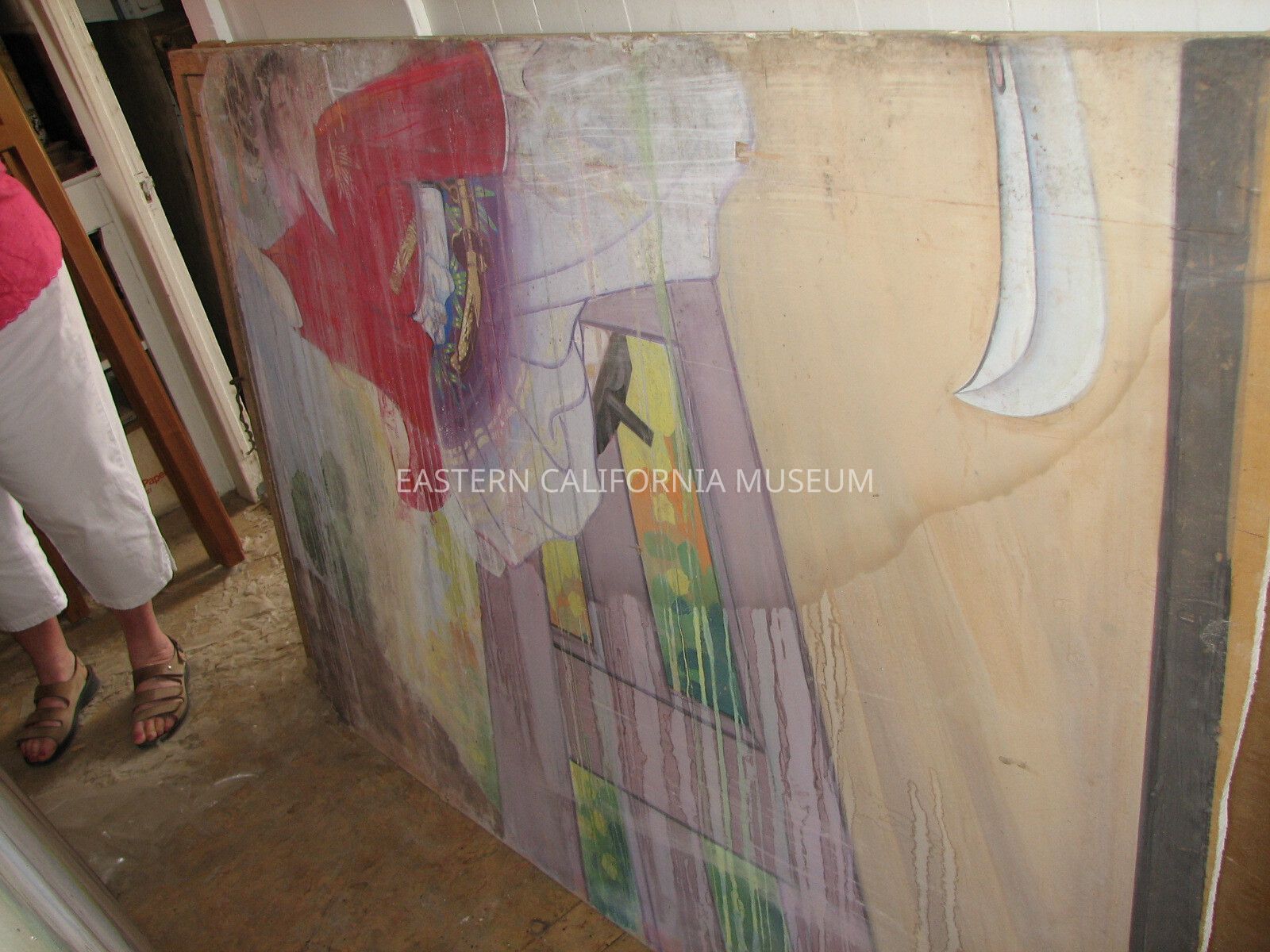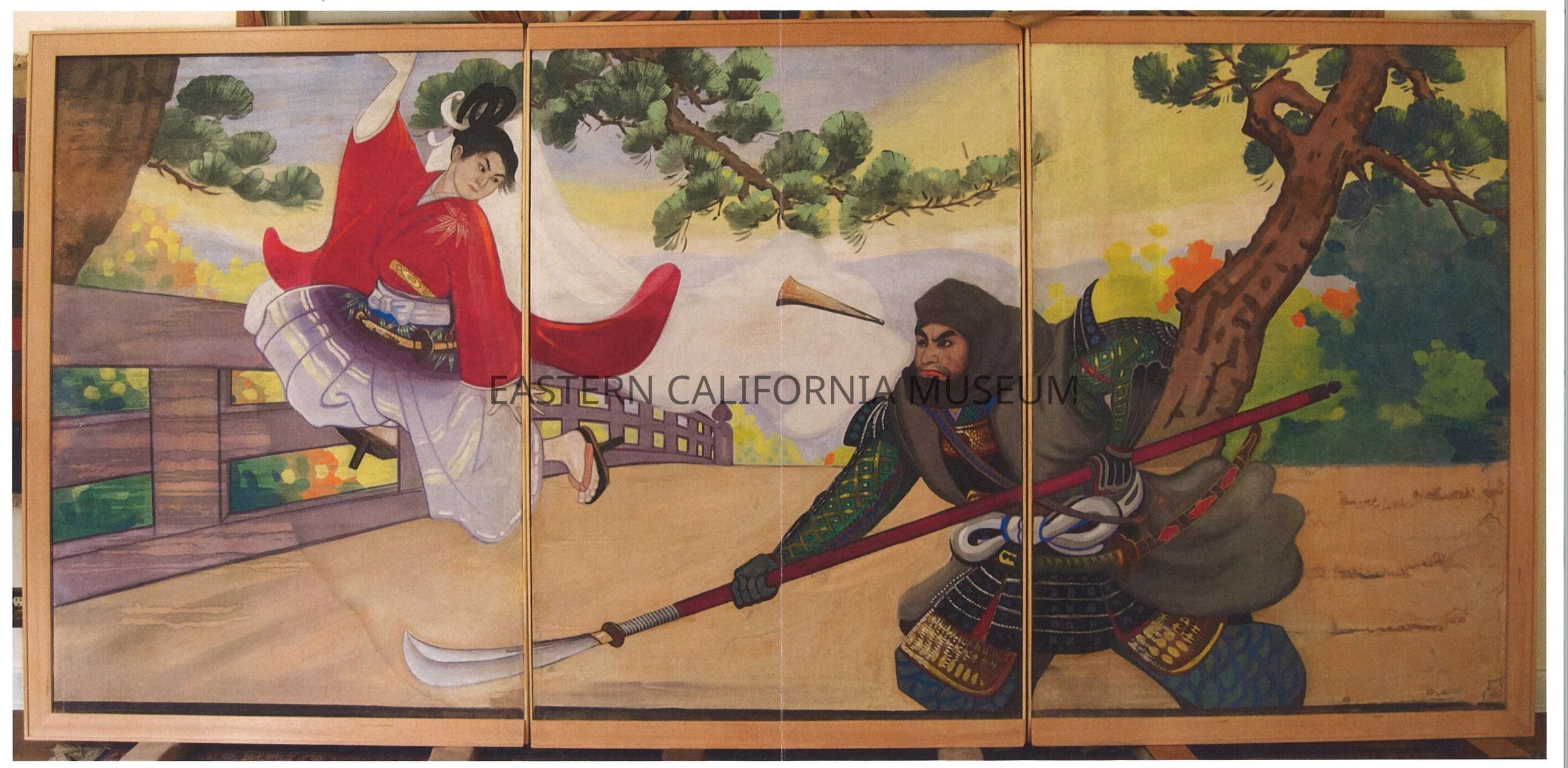Painting on drywall of Benkei and Ushiwakamaru, part of a triptych by Henry Masauke Kumano, 48" x 69.5". At various times labeled "1955.01-ManzPaint 08" and "ECM 08" in loan paperwork.