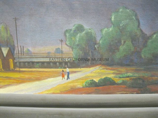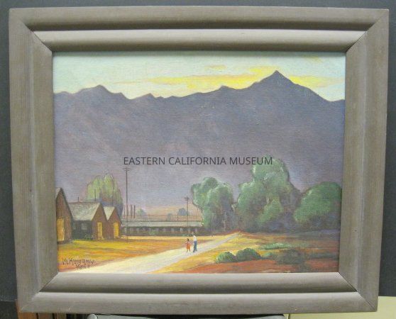 Framed painting of sunset at Manzanar War Relocation Center with the Sierra Nevada mountain range in the background. There are two figures standing or walking on a dirt path in the center of the painting. The colors are muted tones of greens, golds, greys and rust.