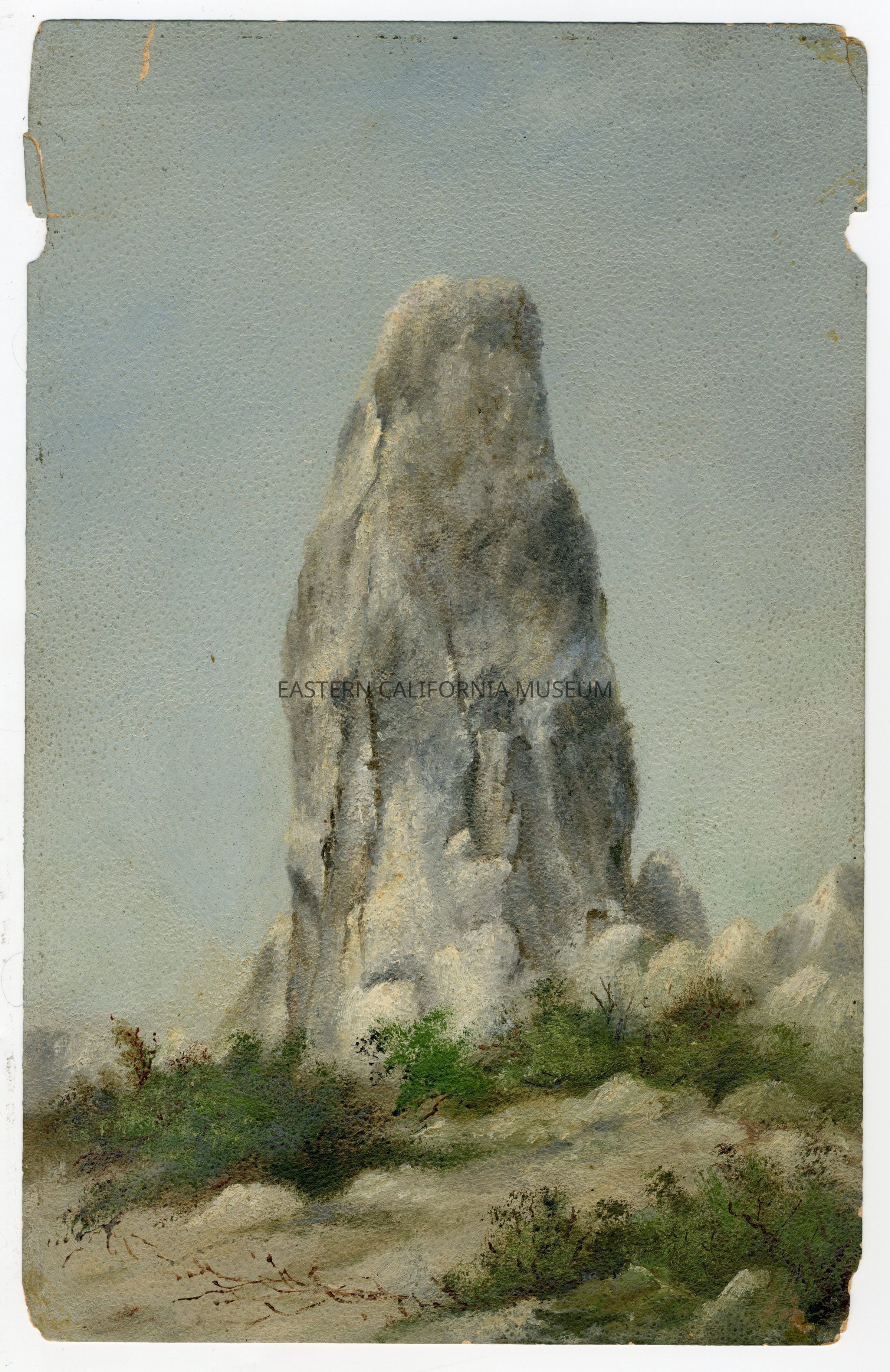 Oil painting of Winnedumah Monument in the Inyo Mountains. Painted by Marcia C. Stevens (1836-1899). She was commonly called Mollie or Molly. Written on reverse is, "Pah-Ute [Paiute] Monument."