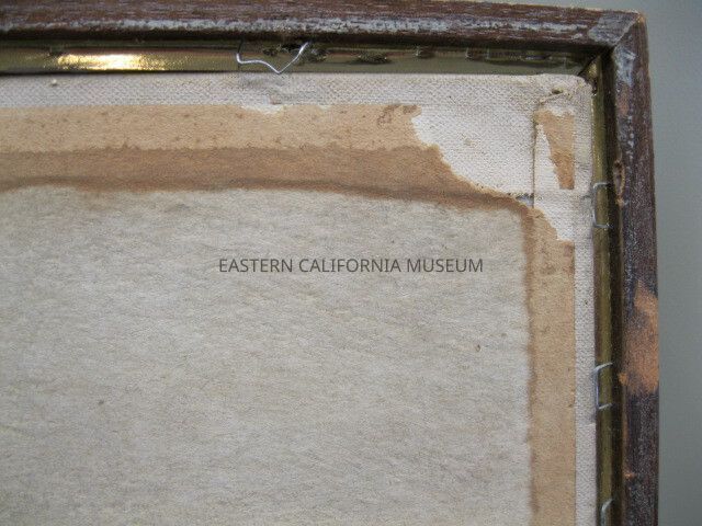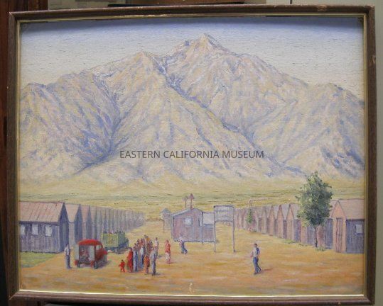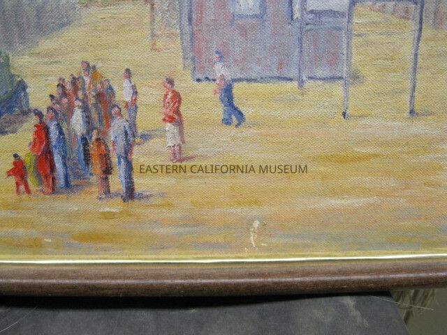 Painting on board framed in small brown frame with interior gold lip. Board does not quite fit the frame. Scene is of Manzanar, two rows of barracks, one row on left and one on right with a single building in the middle. People in lower left quadrant standing together facing two vehicles of which one is a red truck.