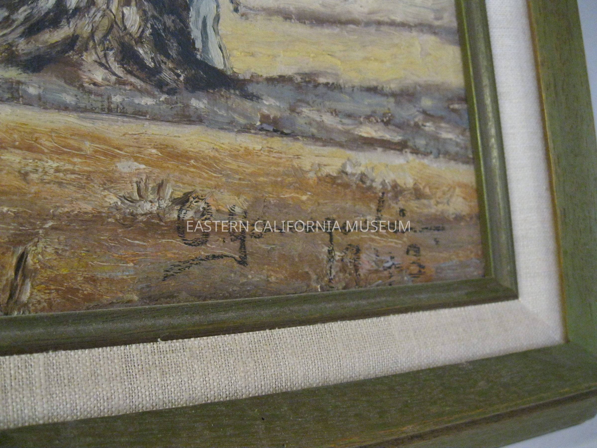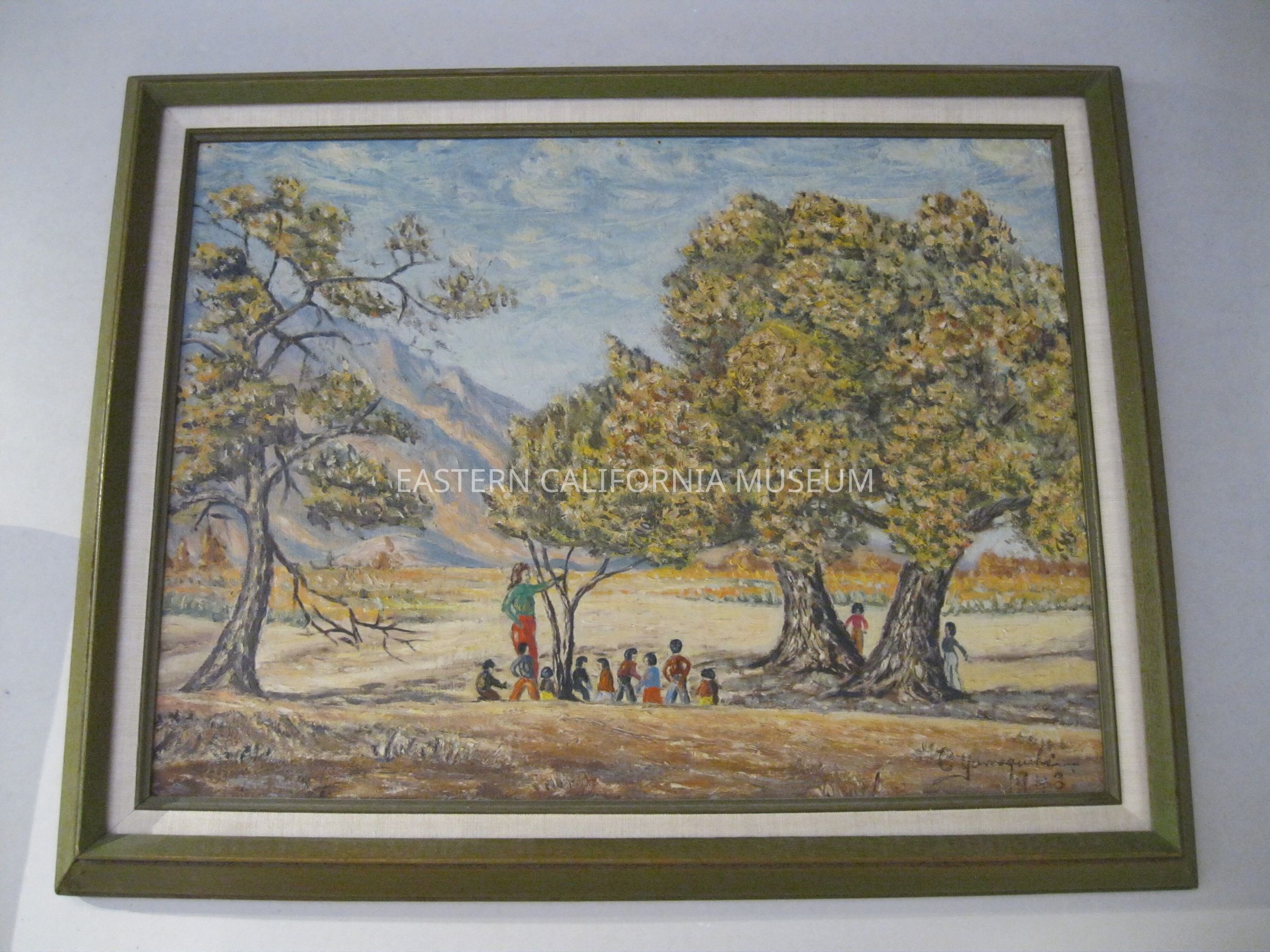 Painting of a group of children under a large tree with an adult woman, likely a teacher and students. It was painted by C. [Catherine?] Yamaguchi in 1943 at Manzanar War Relocation Center.Collection