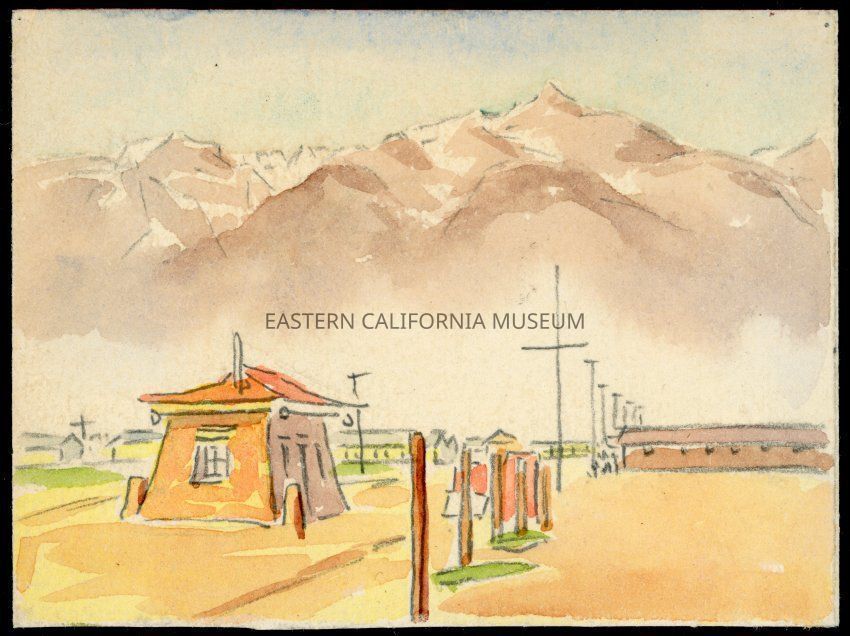 Watercolor painting of the entrance to Manzanar War Relocation Center. It shows a sentry house, barracks, and mountains.Collection