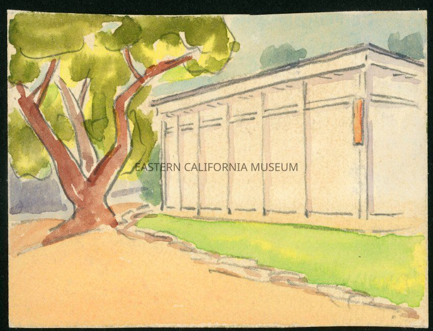 Watercolor painting of Manzanar War Relocation Center's judo building.Collection