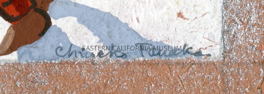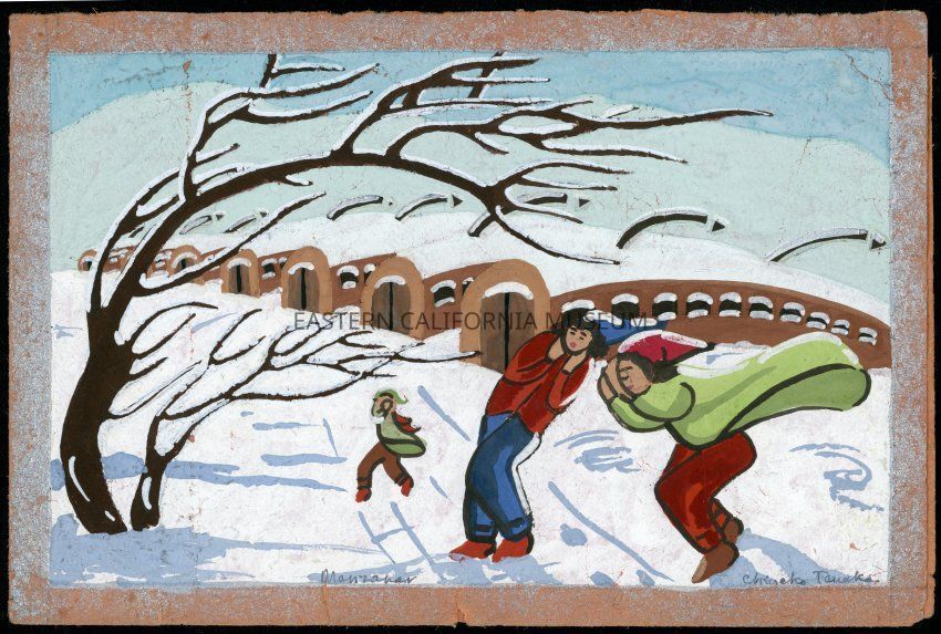 Christmas card of winter wind at Manzanar, art by Chiyoko [Chiyeko?] Tanaka, card sent by Lucile Smith.