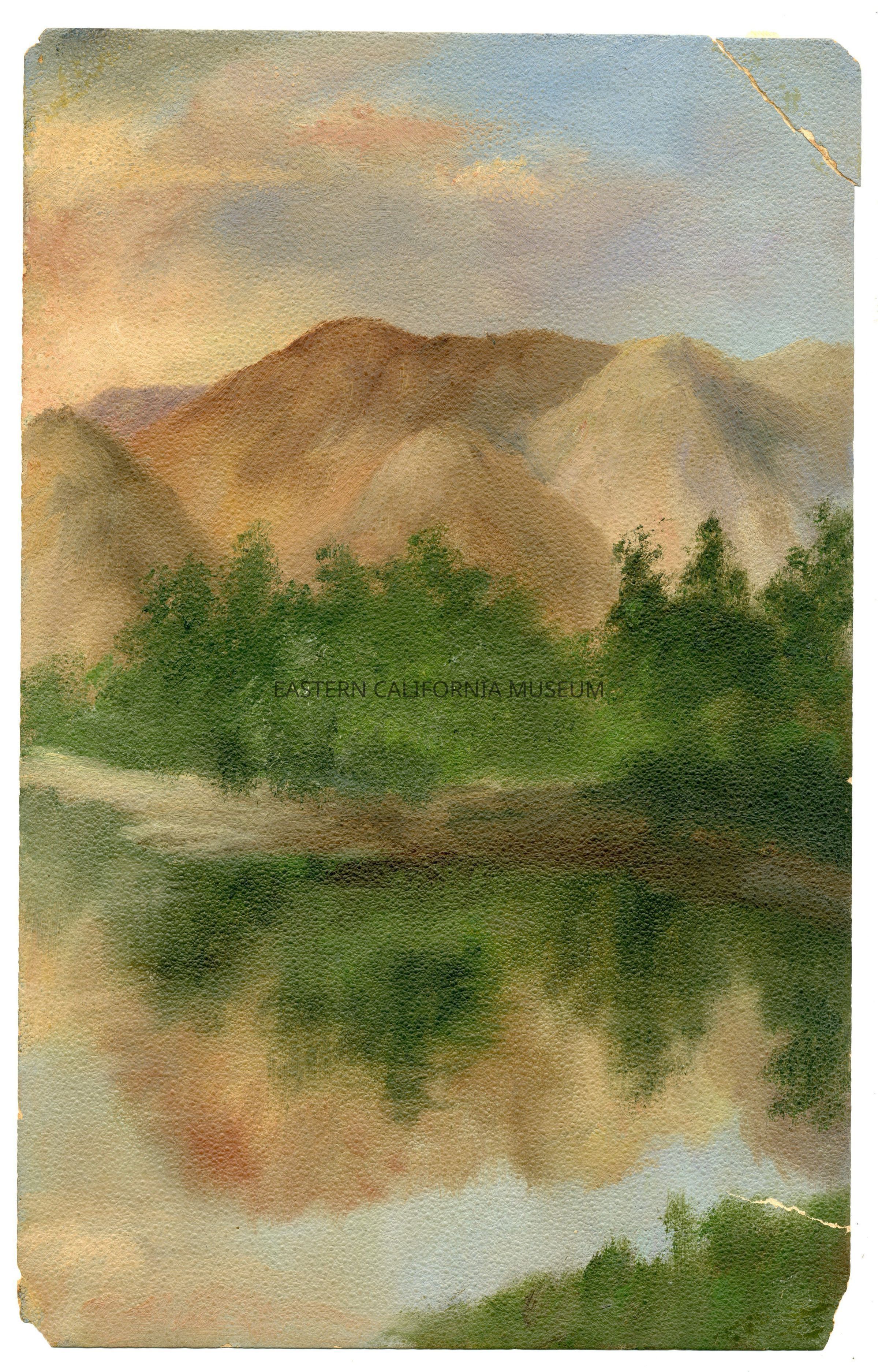 Oil painting of trees and hills/mountains reflected in a body of water, possibly Diaz Lake. Painted by Marcia C. Stevens (1836-1899). She was commonly called Mollie or Molly. Written on reverse is, "Sky pink at top, grey at base of [illegible]. Mts. pink very bright at top, bluish at base."