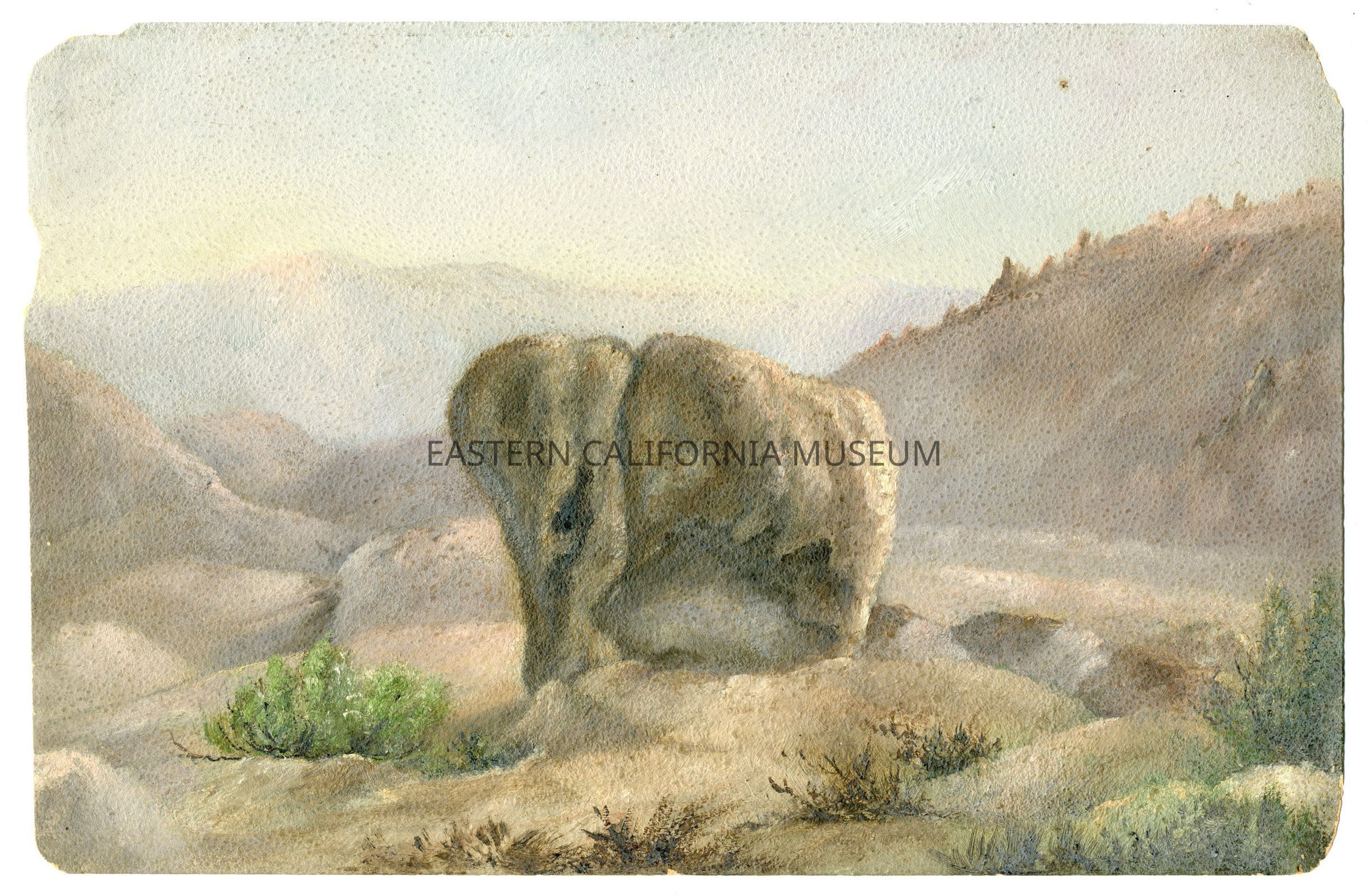Oil painting of Elephant Rock in the Alabama Hills. Painted by Marcia C. Stevens (1836-1899). She was commonly called Mollie or Molly. Written on reverse is, "Elephant Rock. Elephant Rock Mollie called it that. It is in Inyo Co. somewhere near Lone Pine."