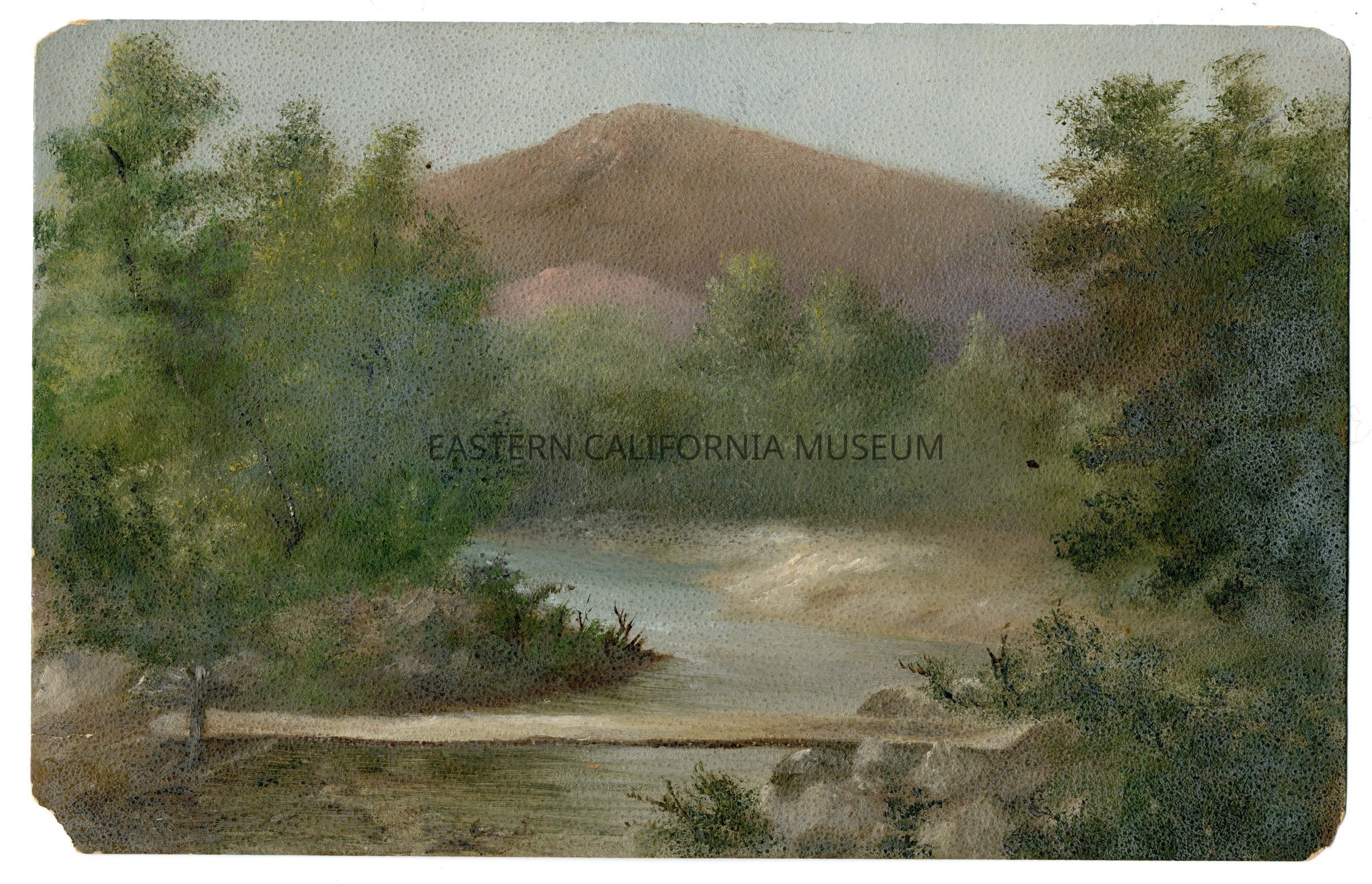 Oil painting of a river with a board or log "bridge" spanning it. Reddish mountain in the background. Painted by Marcia C. Stevens (1836-1899). She was commonly called Mollie or Molly. Written on reverse is, "Iny. Mts. [Inyo Mountains] and Lone Pine Creek."