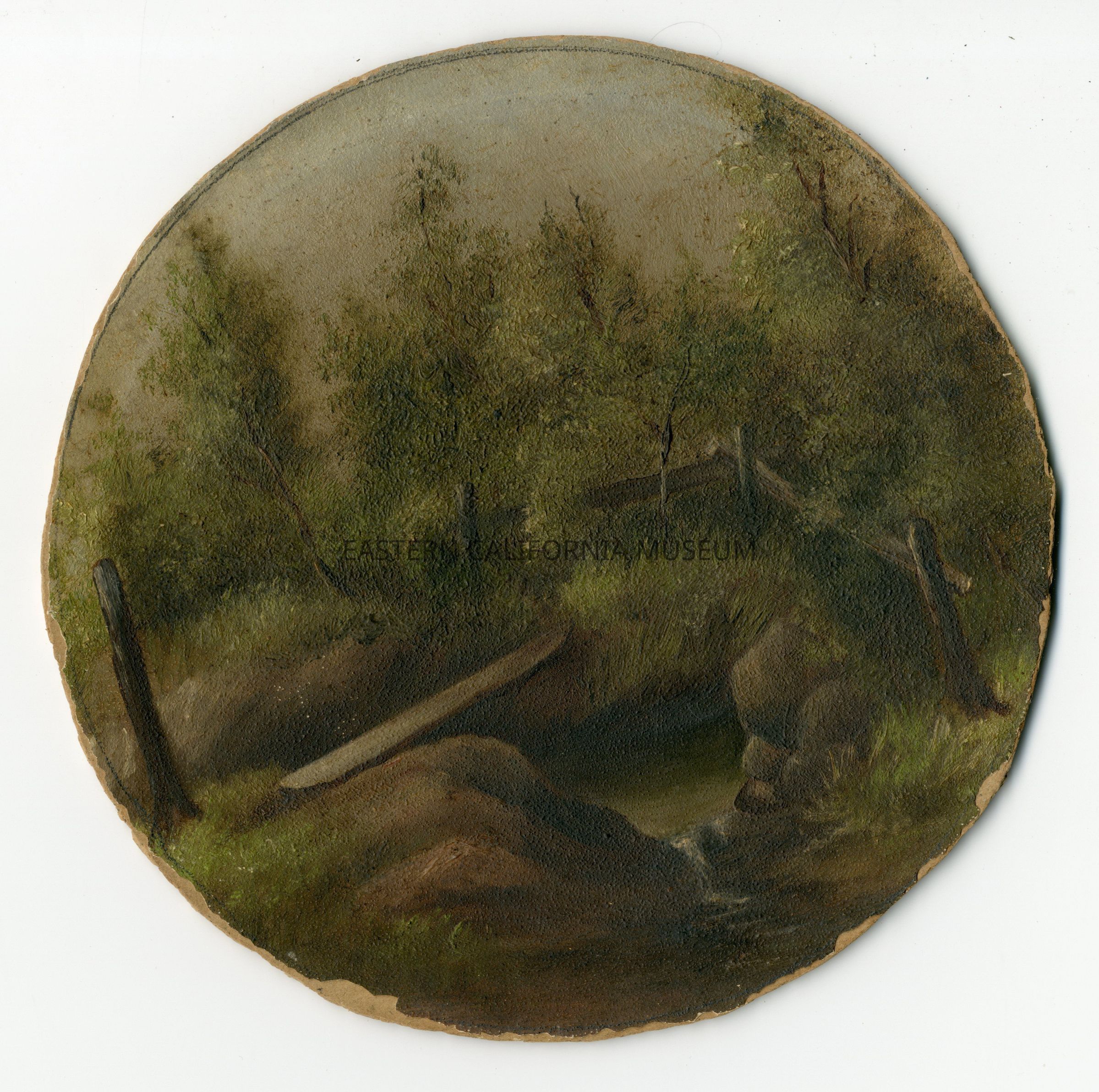 Oil painting of a spring or creek with a wooden board or log "bridge" spanning across it. Painted by Marcia C. Stevens (1836-1899). She was commonly called Mollie or Molly. Written on reverse is, "Spring at Moffett Ranch. Moffett Ranch north end of Alabamas. West of [Alabama Hills]." It has been cut into a circle about 6" in diameter.