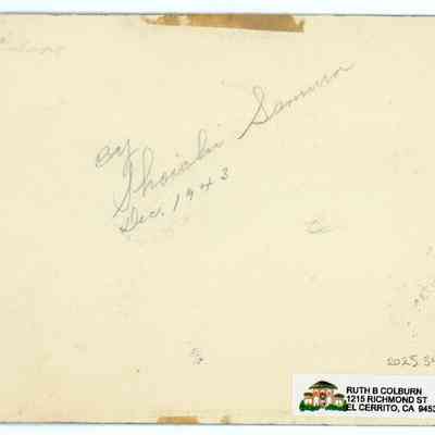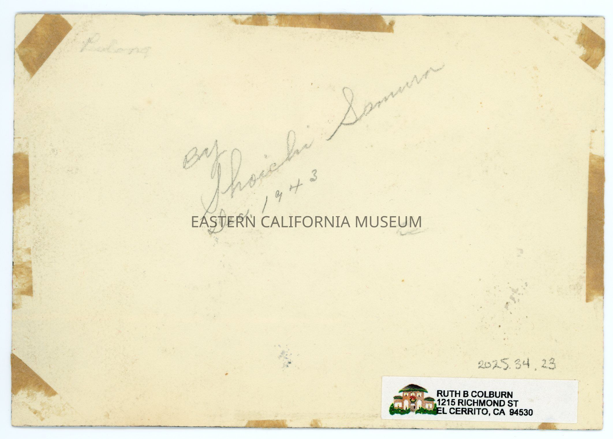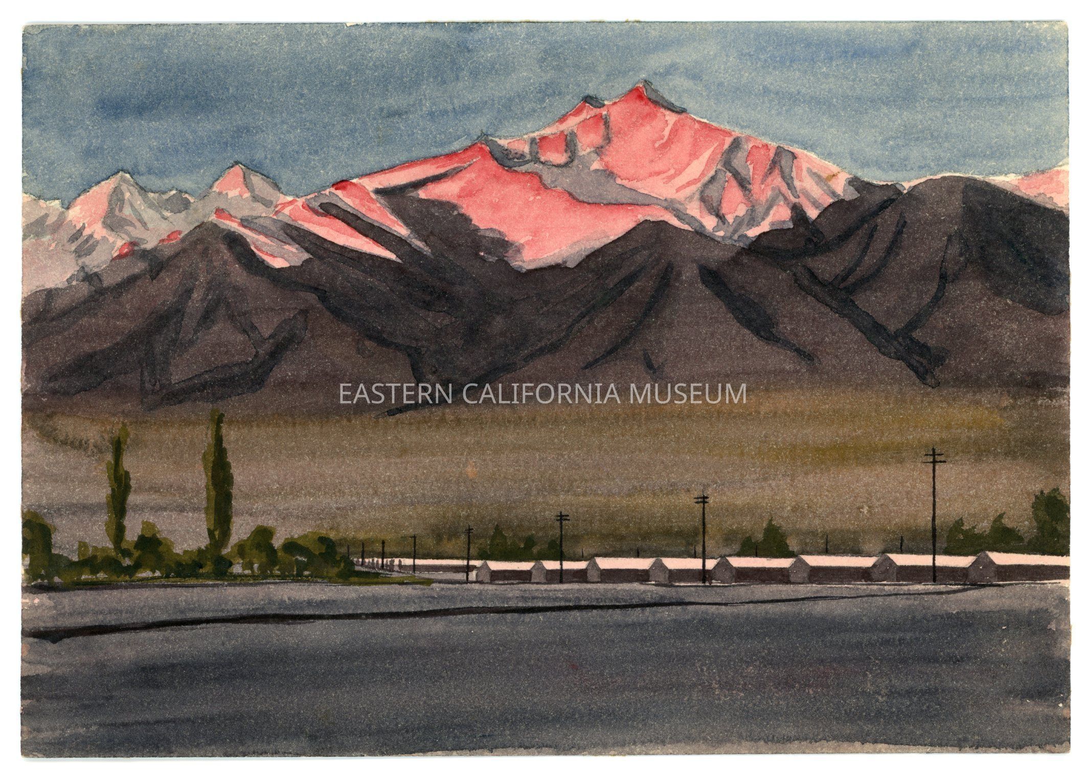 Small watercolor painting of a row of barracks at Manzanar War Relocation Center and Mt. Williamson by Shoichi Samura, December 1943.Collection