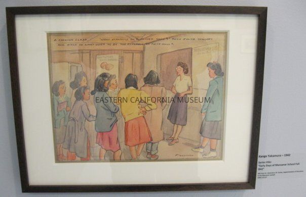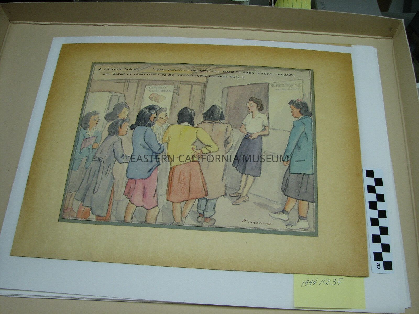 Watercolor painting by Kango Takamura. It is one of twelve in a collection titled, "Early Days of Manzanar School, Fall 1942" that was presented to Dr. Genevieve Carter, Superintendent of Education at Manzanar War Relocation Center.