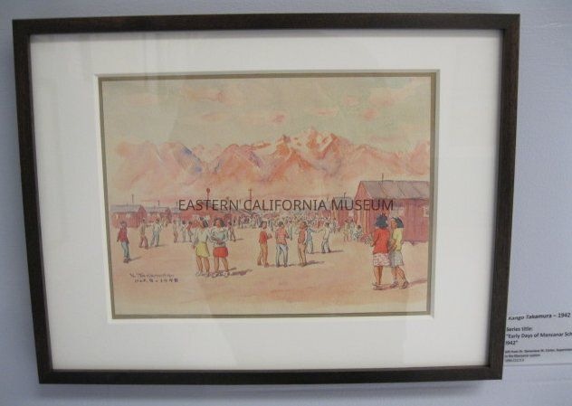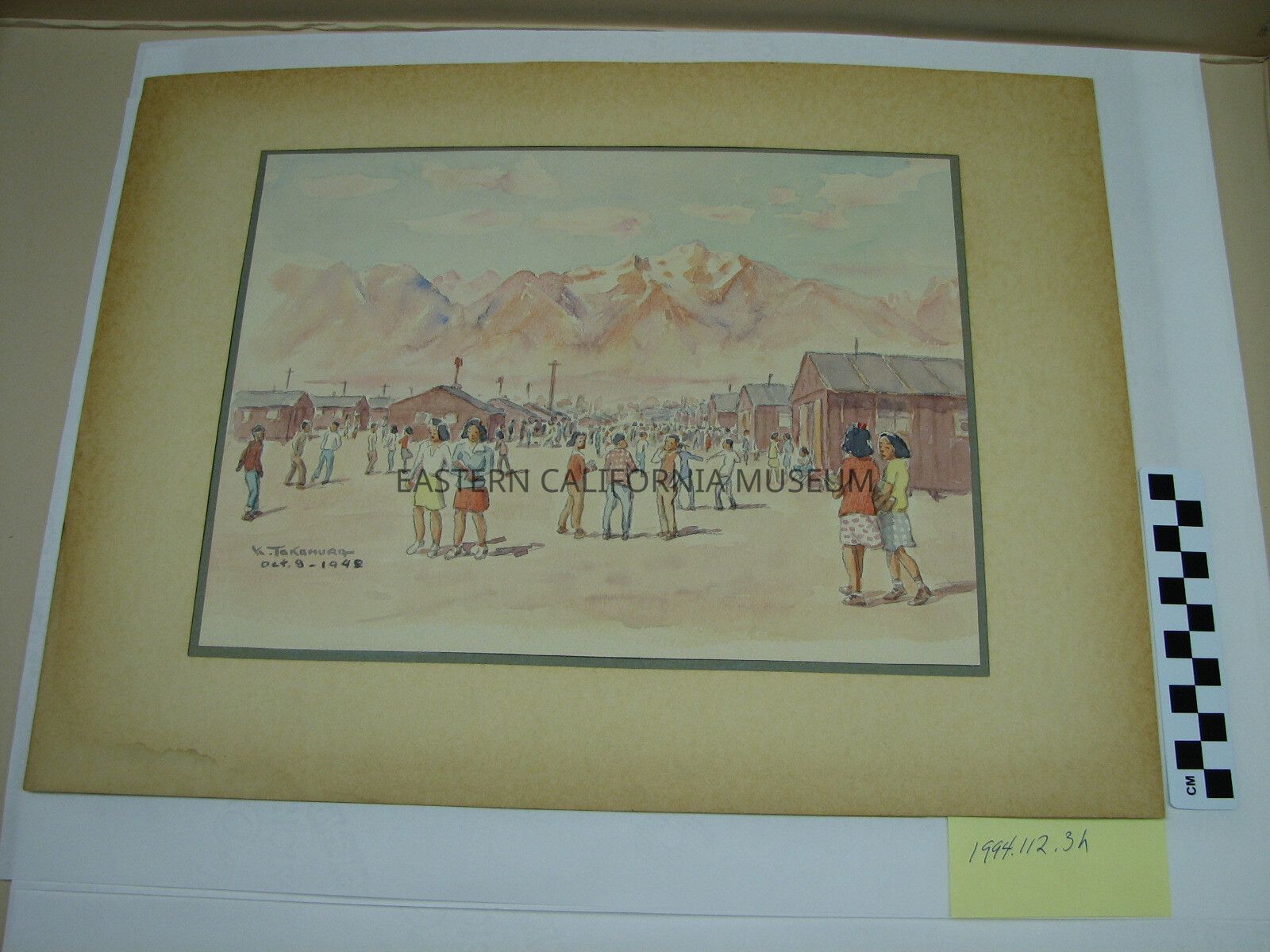 Watercolor painting by Kango Takamura. It is one of twelve in a collection titled, "Early Days of Manzanar School, Fall 1942" that was presented to Dr. Genevieve Carter, Superintendent of Education at Manzanar War Relocation Center.