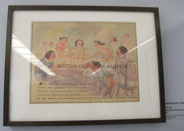 Watercolor painting by Kango Takamura. It is one of twelve in a collection titled, "Early Days of Manzanar School, Fall 1942" that was presented to Dr. Genevieve Carter, Superintendent of Education at Manzanar War Relocation Center.