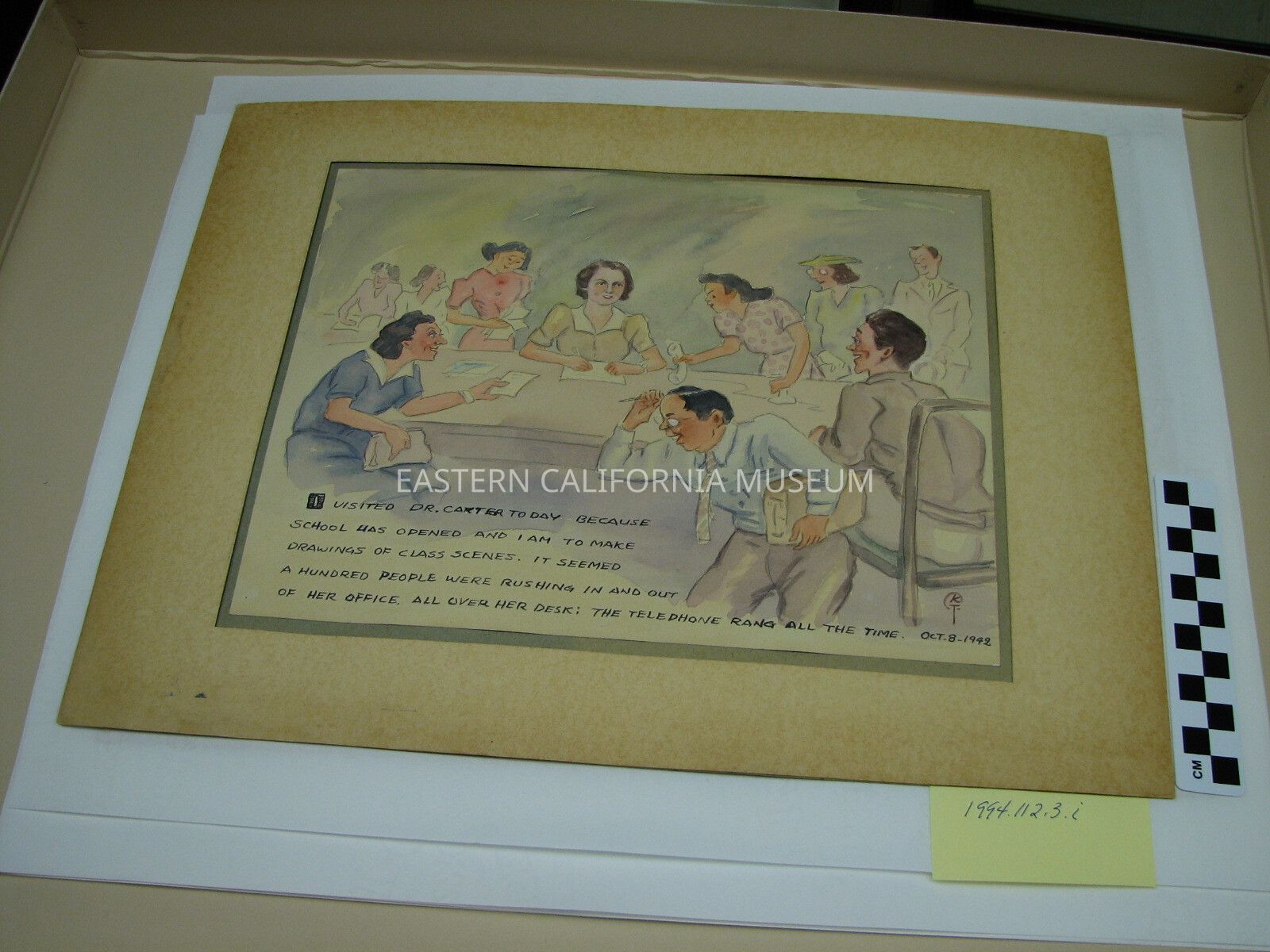 It is captioned: "I visited Dr. Carter today because school has opened and I am to make drawing of class scenes. It seemed a hundred people were rushing in and out of her office. All over her desk: The telephone rang all the time."Collection