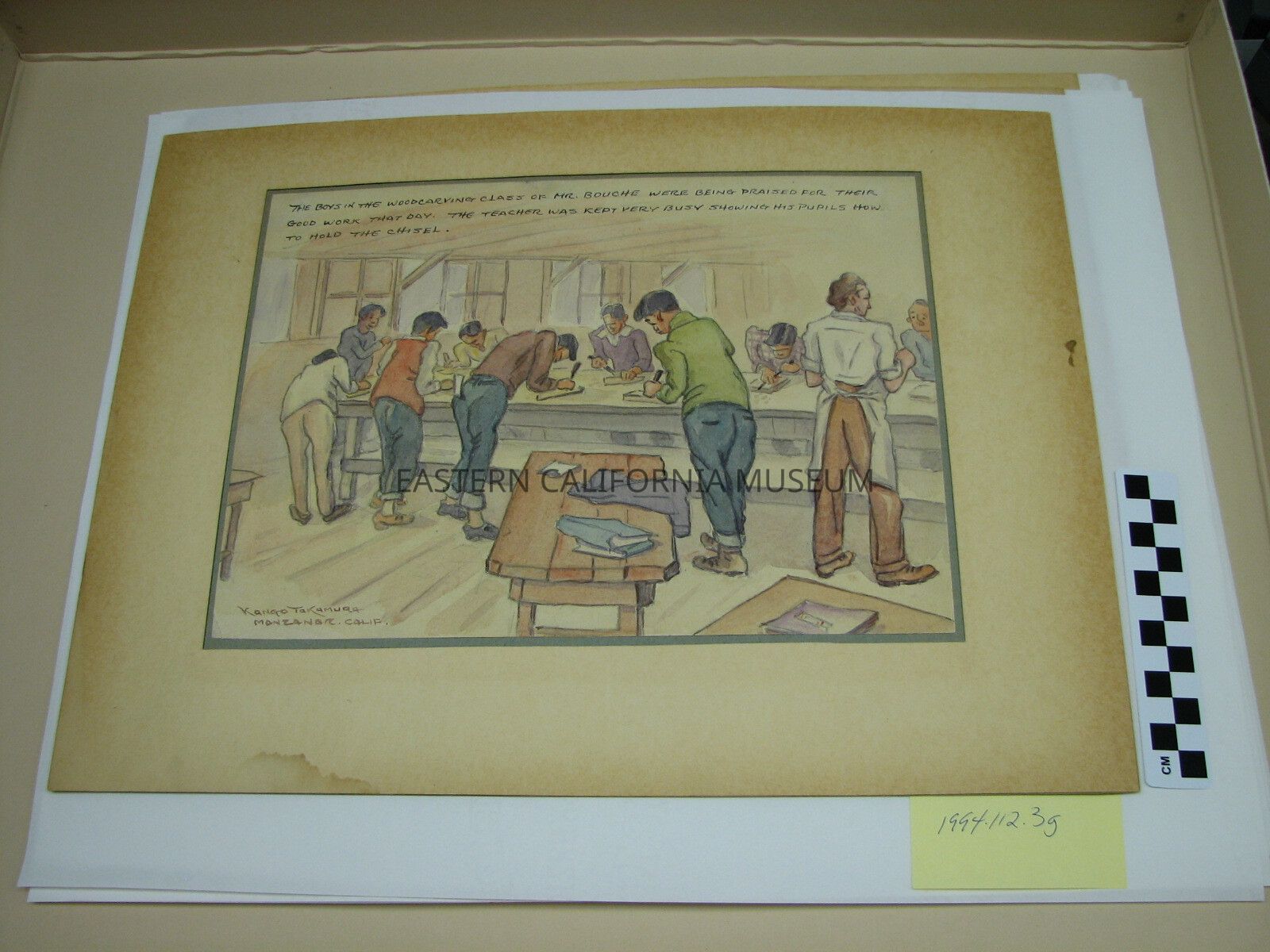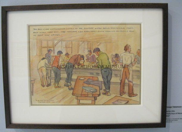 Watercolor painting by Kango Takamura. It is one of twelve in a collection titled, "Early Days of Manzanar School, Fall 1942" that was presented to Dr. Genevieve Carter, Superintendent of Education at Manzanar War Relocation Center.