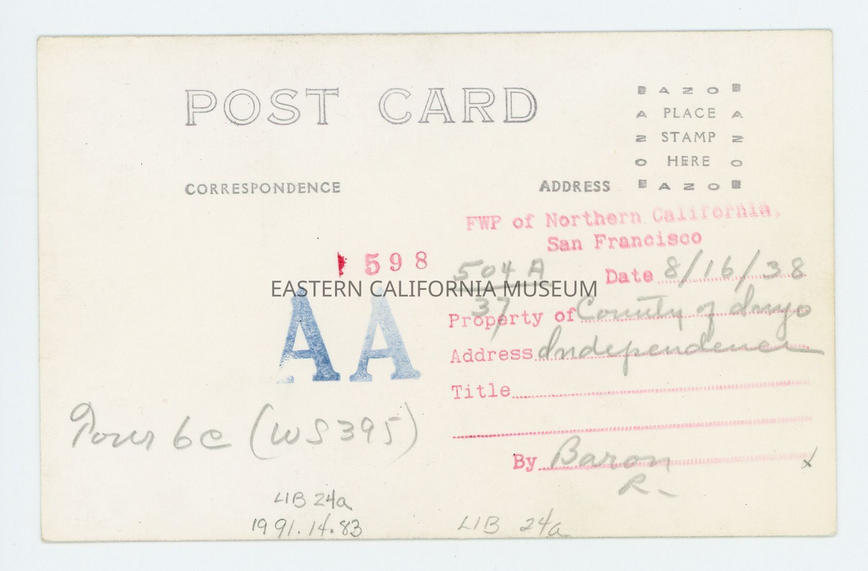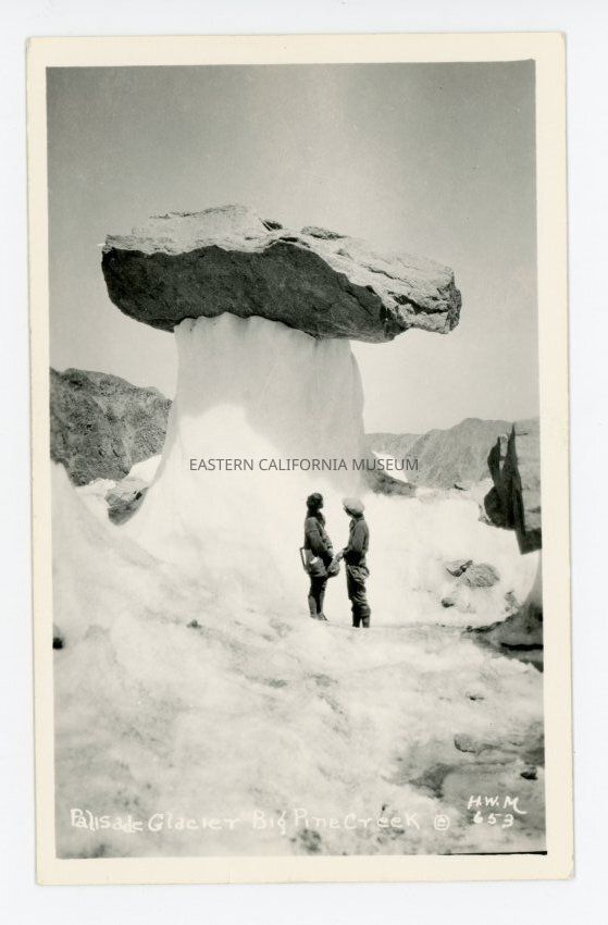 Photo postcard of two people standing beneath a large boulder suspended on a pedestal of ice. It is labeled, "Palisade Glacier, Big Pine Creek" and has ID #653.Collection