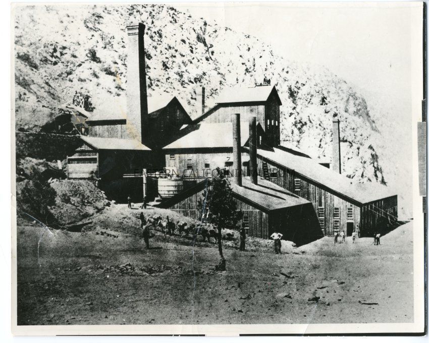 B&W. Panamint City in Death Valley. Appears to have been taken in the 1880s. People, buildings, and mule team (center near tree?); Surprise Valley Mill and Water Company 20 Stamp mill.