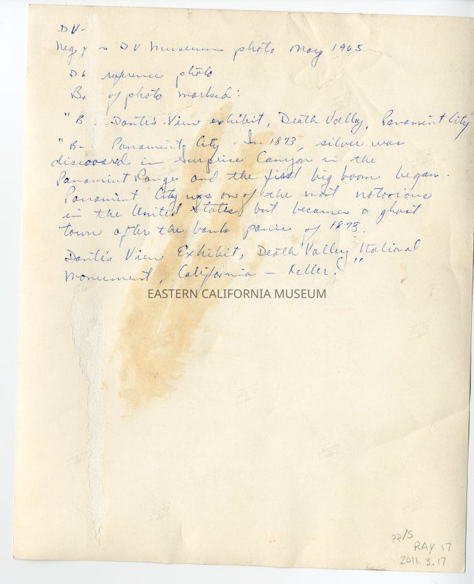 Reverse: Handwritten in ink: Neg from DV Museum, Photo May 1965, DV reference photo, Back of photo marked: Dante's View exhibit, Death Valley, Panamint City. In 1873 silver was discovered in Surprise Canyon in the Panamint Range and the first big boom began. Panamint City was one of the most notorious in the United States but became a ghost town after the bank panic of 1875. Dante's View Exhibit, Death Valley National Monument, California--Keller.Collection
