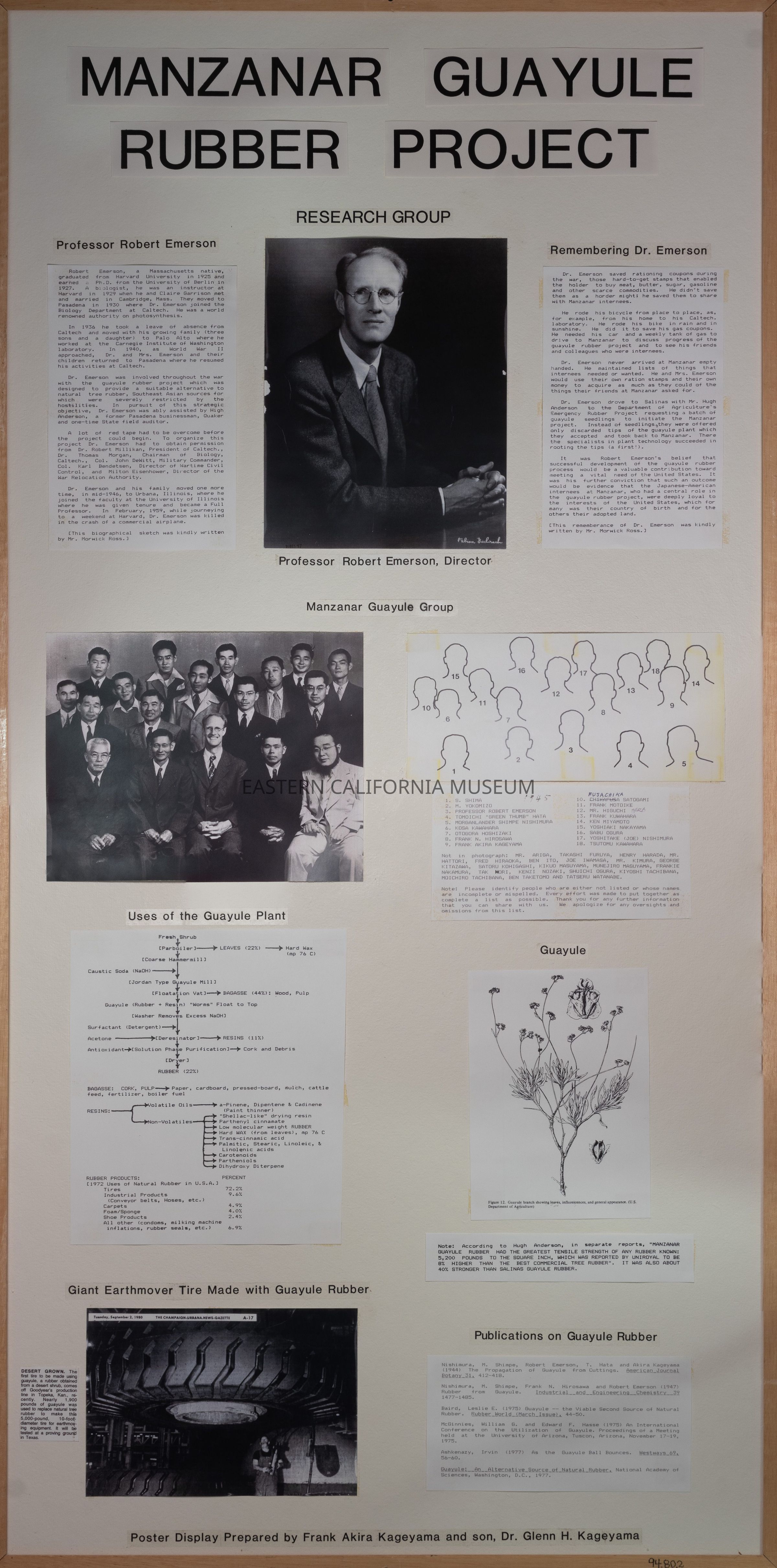 Panel titled "Manzanar Guayule Rubber Project." It is one of three panels about the Manzanar Guayule Rubber Project along with 1994.80.1 and 1994.80.3. This display was prepared by Frank Akira Kageyama and son, Dr. Glenn H. Kageyama.